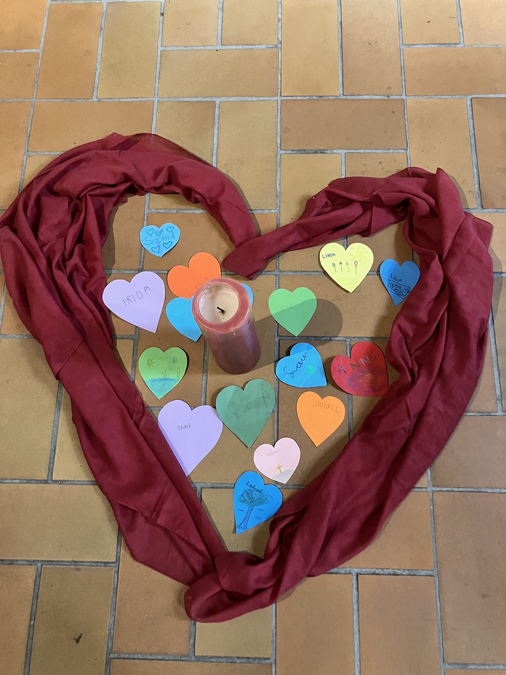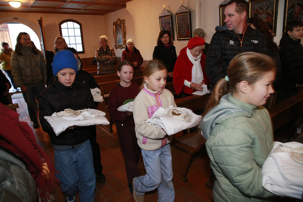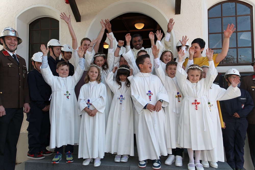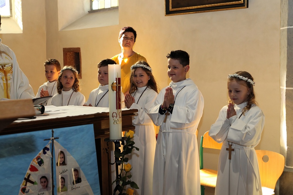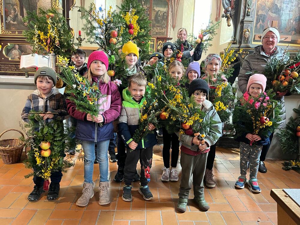 Die Rönser Volksschulkinder mit Pfarrer Lojin und Religionslehrerin Alexandra Amann. Ganz vorne sind die Erstklässler Jakob und Frida zu sehen. "Das Herz" war das Thema des Gottesdienstes.