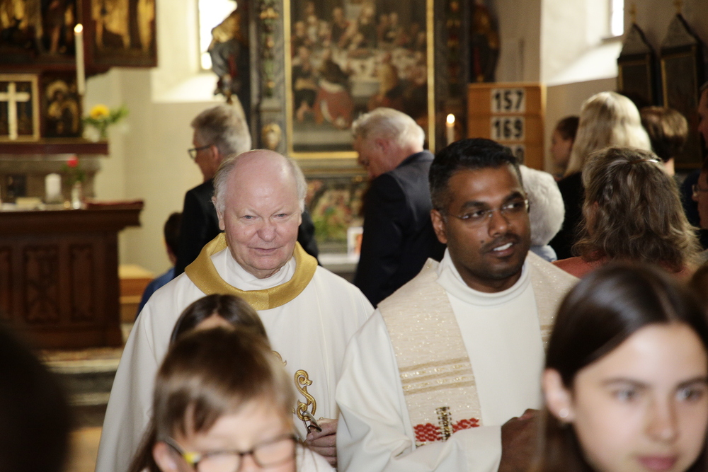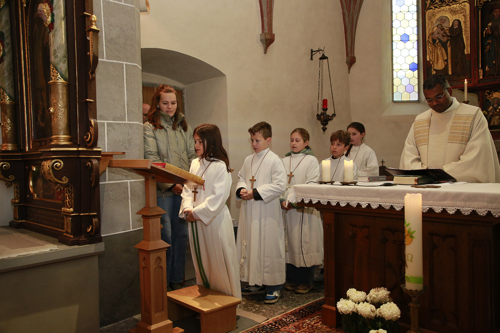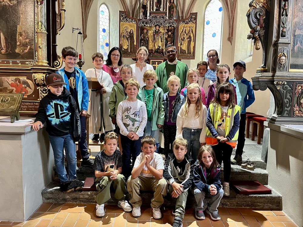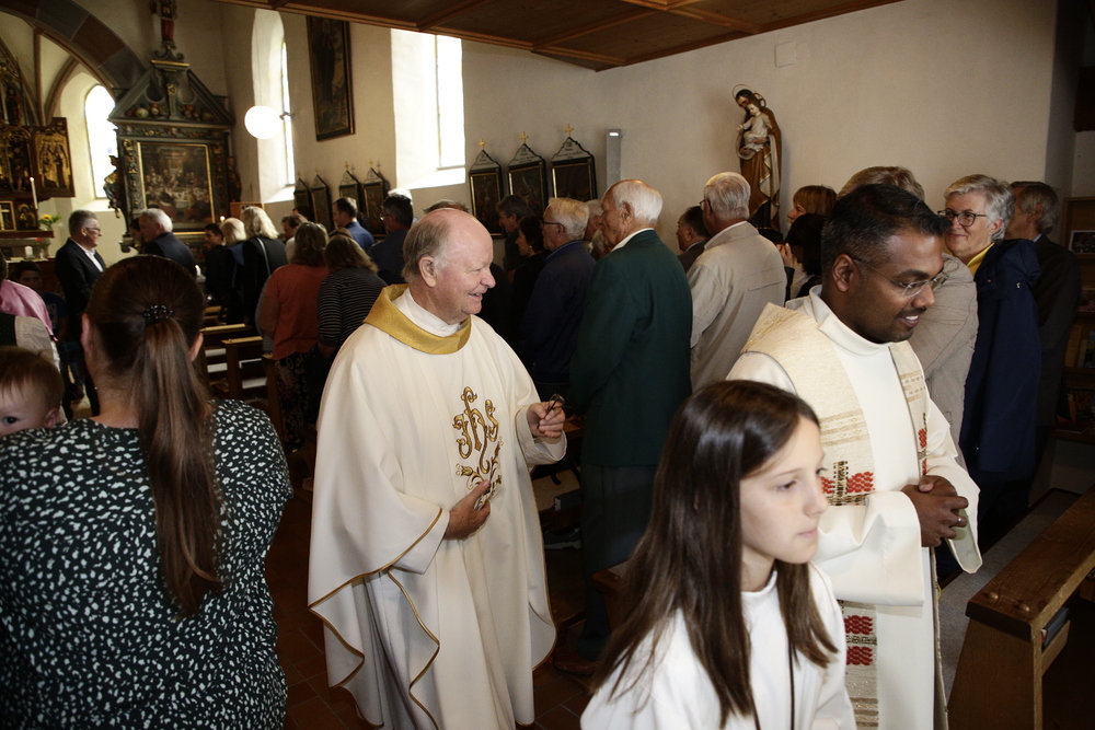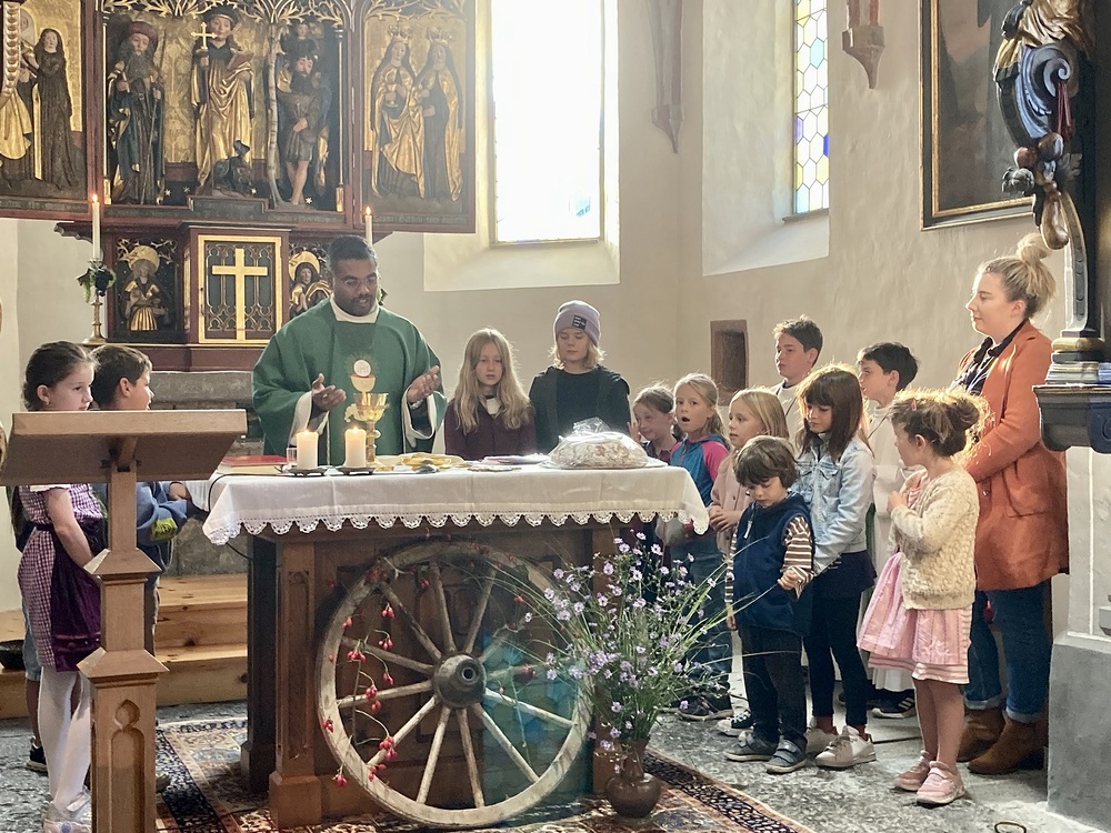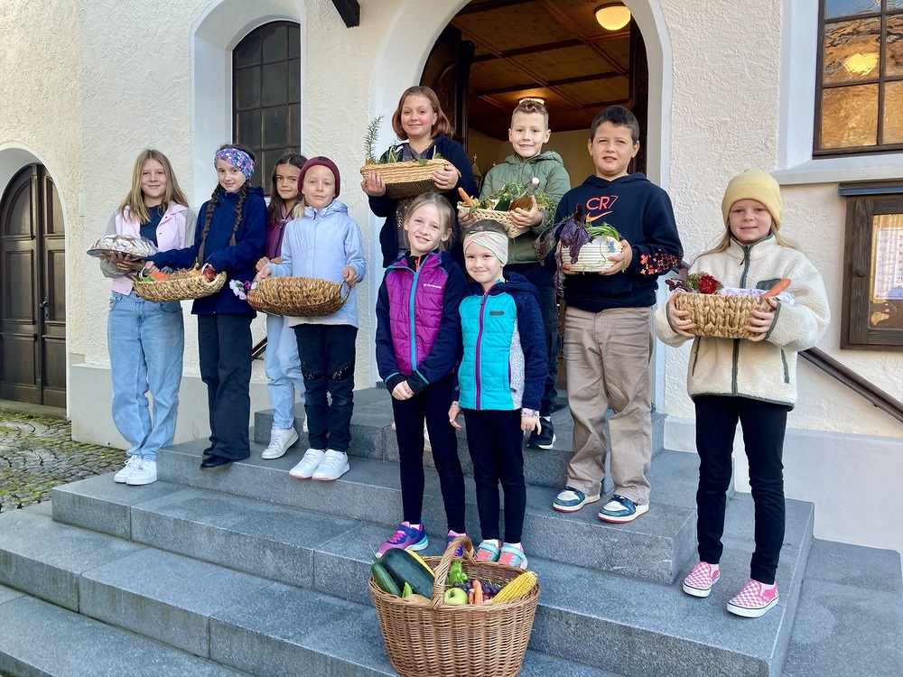 Pfarrer Lojin feierte mit zahlreichen Kindern und Erwachsenen den Erntedankgottesdienst. Sabrina las den Kindern eine Geschichte zum Thema Dankbarkeit vor. Theresia und Otto übernahmen einmal mehr die musikalische Umrahmung.