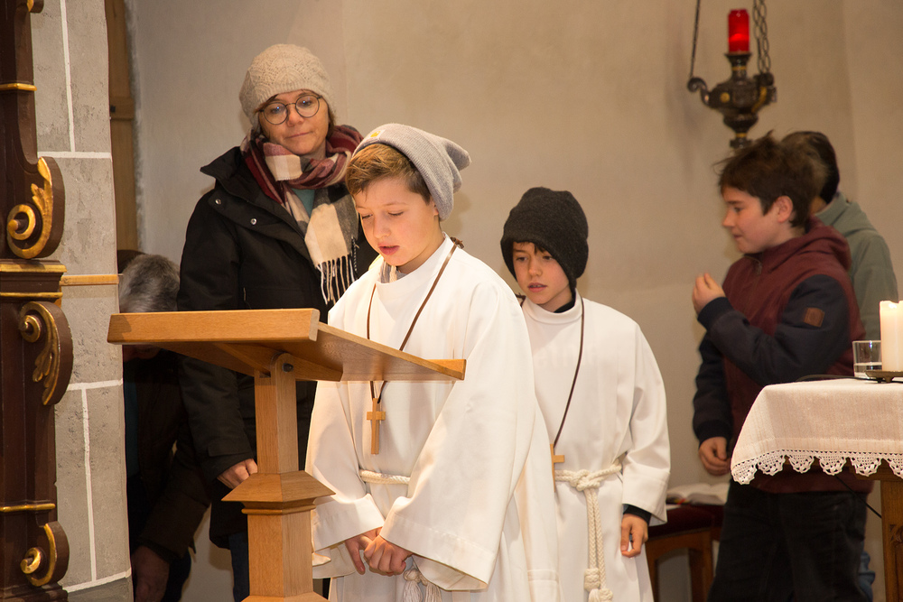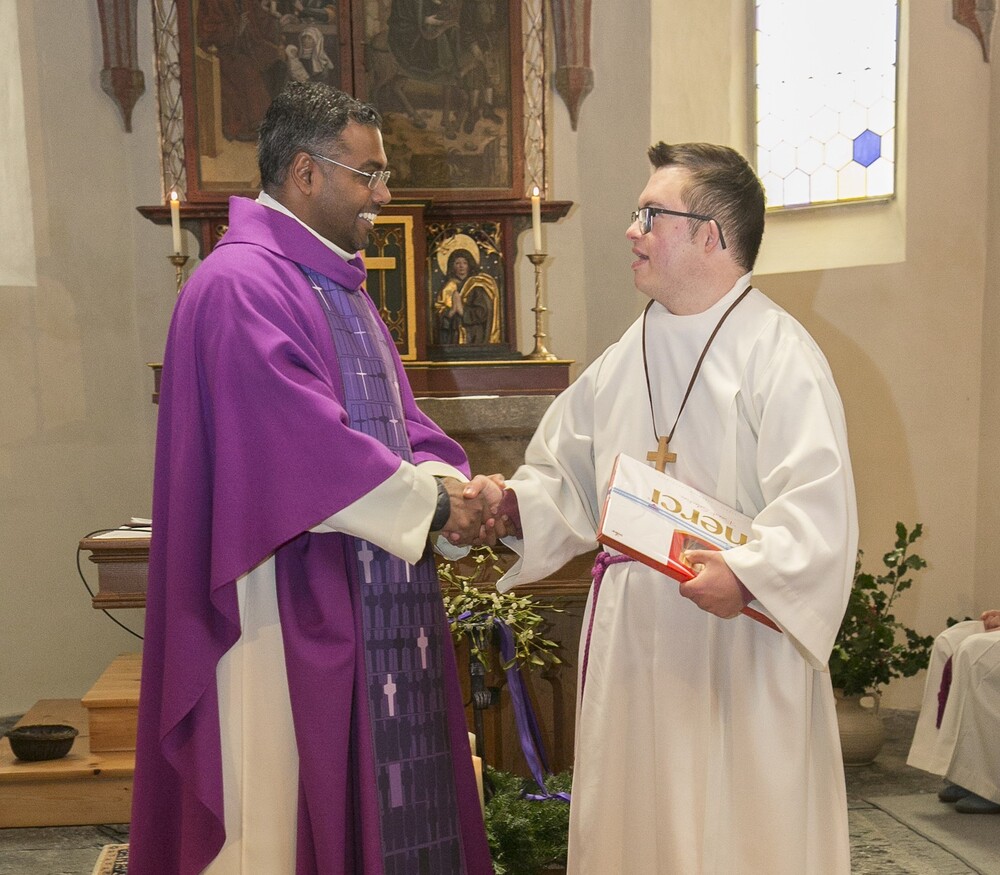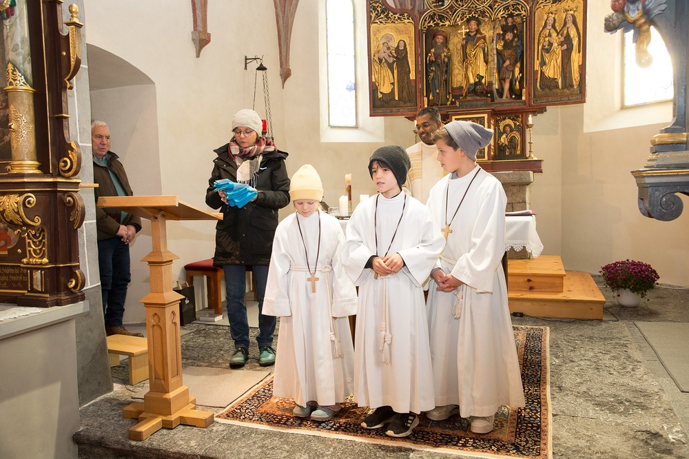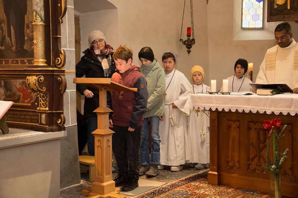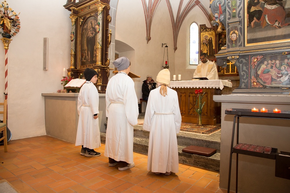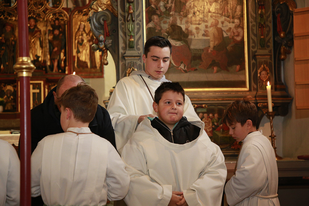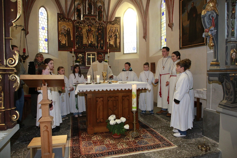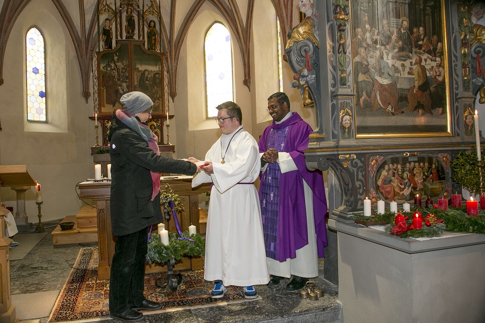 Am 1. Adventsonntag verabschiedete sich Stephan nach 16 Jahren aus dem Ministrantendienst. Angelika bedankte sich im Namen des Mini-Teams sehr herzlich. Den lobenden Worten von Pfarrer Lojin folgte ein großer Applaus der Pfarrfamilie.