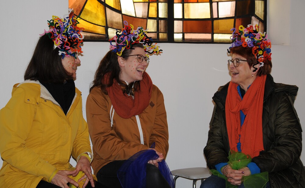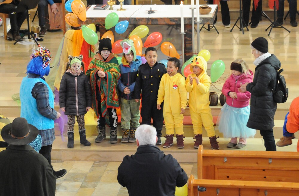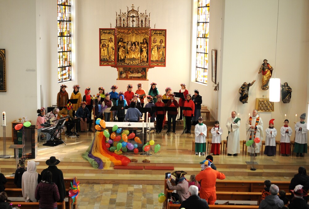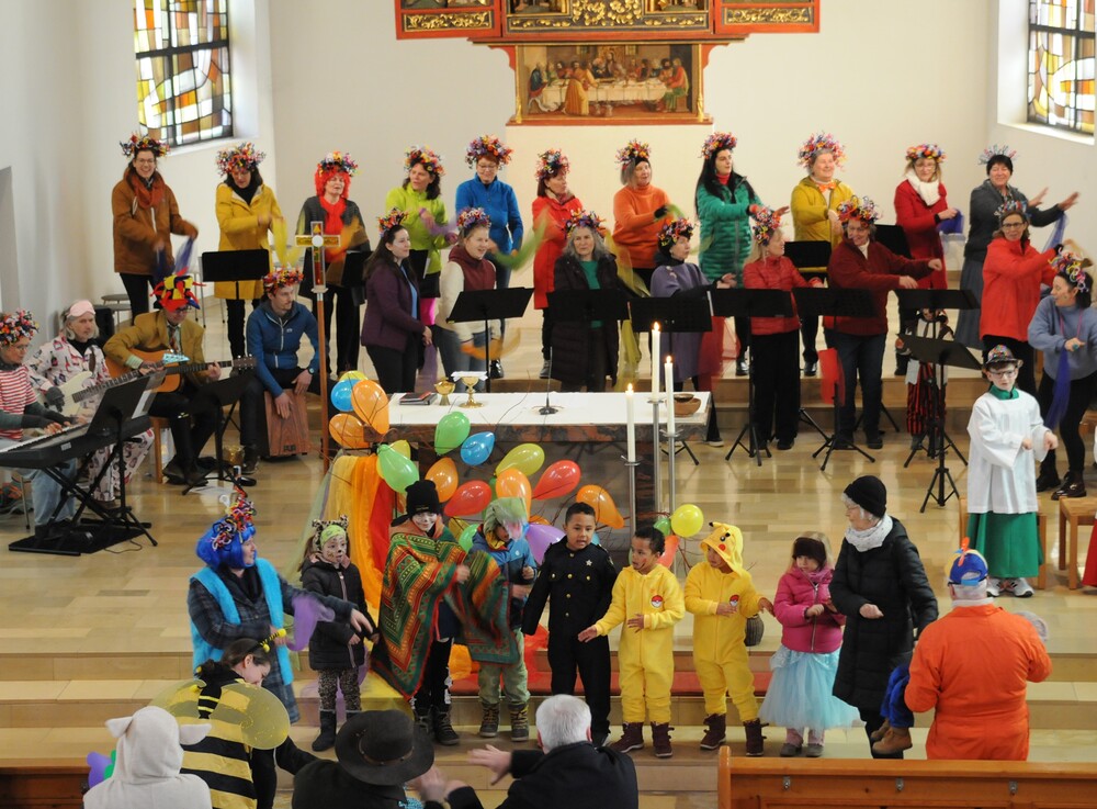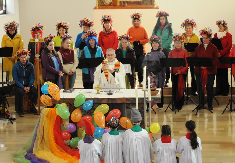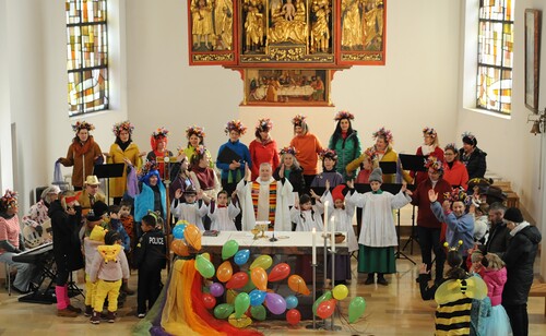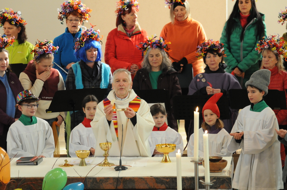 Schon beim Betreten der Kirche war eine besondere Atmosphäre spürbar und der Leitsatz für diesen speziellen Sonntag erkennbar: eine bunte Schar von farbigen Luftballons verwandelte den Gabentisch in eine Farbpalette, wobei die verschiedenen Farben nicht nur schön ausschauten, sondern auch voll dem Grundgedanken des Gottesdienstes entsprachen, weil die Farbkombinationen - inspiriert von der Natur und dem Alltag - so gewählt waren, dass sie zu einzelnen Abschnitten des Gottesdienstes die praktische Inspiration lieferten. Viele Gläubige, darunter zahlreiche Kinder, erschienen als „lustige Gestalten“ kostümiert, besonders auffällig waren die Damen vom Chor imPuls mit ihren bunten, schillernden „Trendfrisuren“ und farbenfrohen Tüchern. Auch die Ministranten waren etwas bunter als sonst und selbst Vikar Edwin Matt ließ es sich nicht nehmen, beim Einzug ein elegantes Faschingshütchen zu tragen.