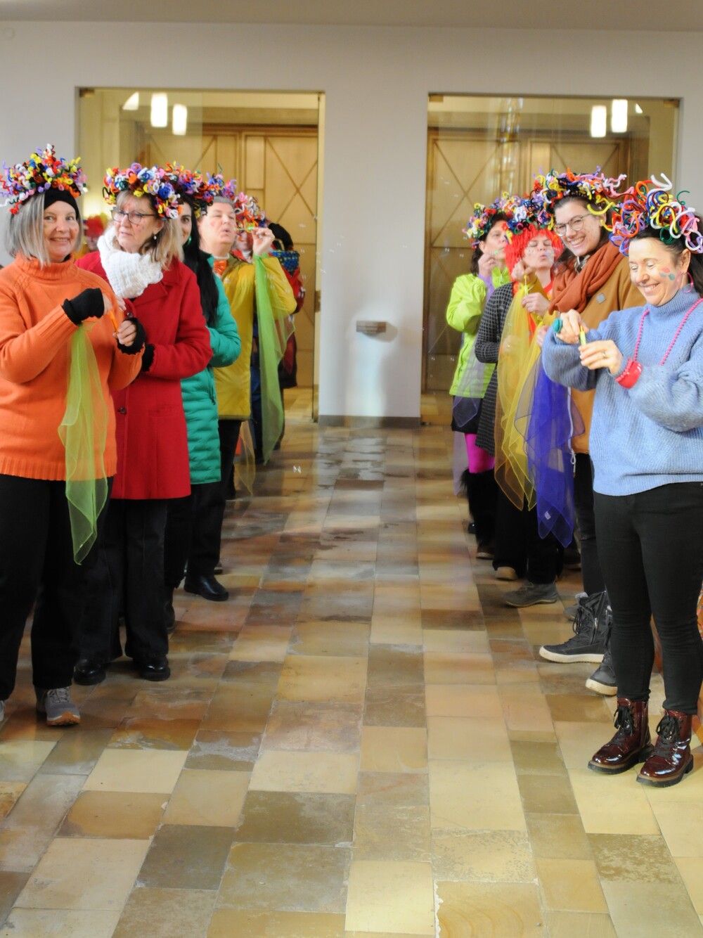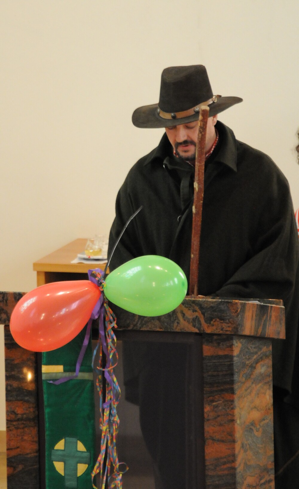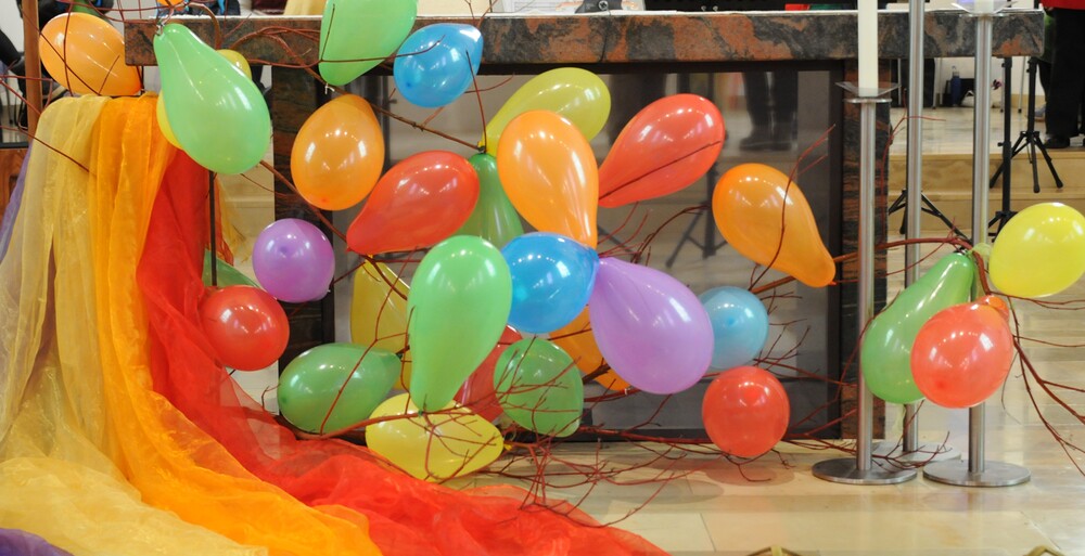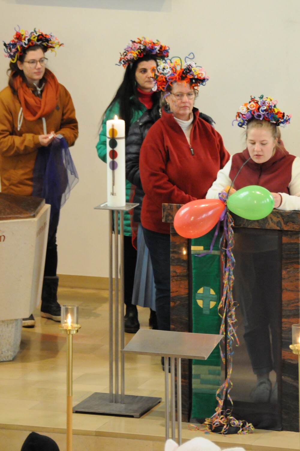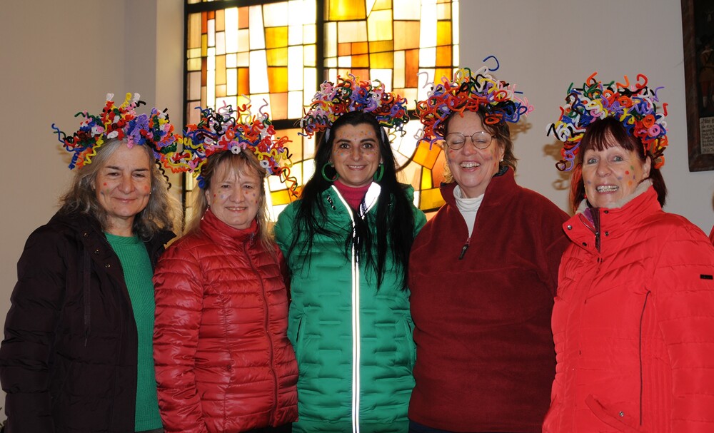 Schon beim Betreten der Kirche war eine besondere Atmosphäre spürbar und der Leitsatz für diesen speziellen Sonntag erkennbar: eine bunte Schar von farbigen Luftballons verwandelte den Gabentisch in eine Farbpalette, wobei die verschiedenen Farben nicht nur schön ausschauten, sondern auch voll dem Grundgedanken des Gottesdienstes entsprachen, weil die Farbkombinationen - inspiriert von der Natur und dem Alltag - so gewählt waren, dass sie zu einzelnen Abschnitten des Gottesdienstes die praktische Inspiration lieferten. Viele Gläubige, darunter zahlreiche Kinder, erschienen als „lustige Gestalten“ kostümiert, besonders auffällig waren die Damen vom Chor imPuls mit ihren bunten, schillernden „Trendfrisuren“ und farbenfrohen Tüchern. Auch die Ministranten waren etwas bunter als sonst und selbst Vikar Edwin Matt ließ es sich nicht nehmen, beim Einzug ein elegantes Faschingshütchen zu tragen.
