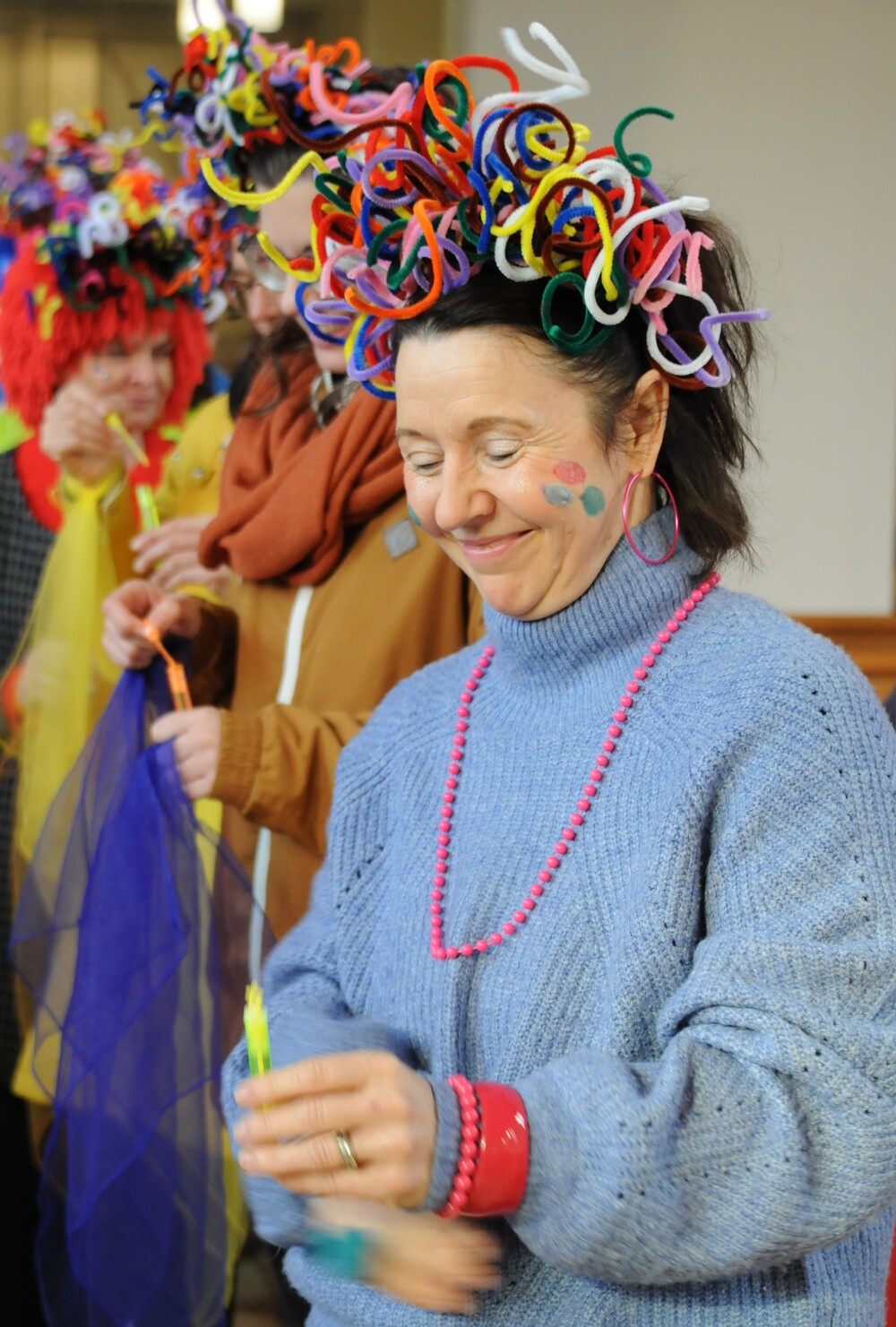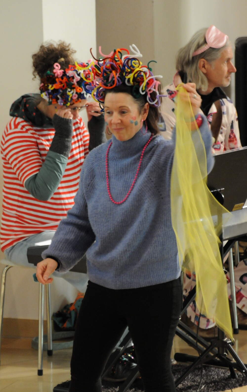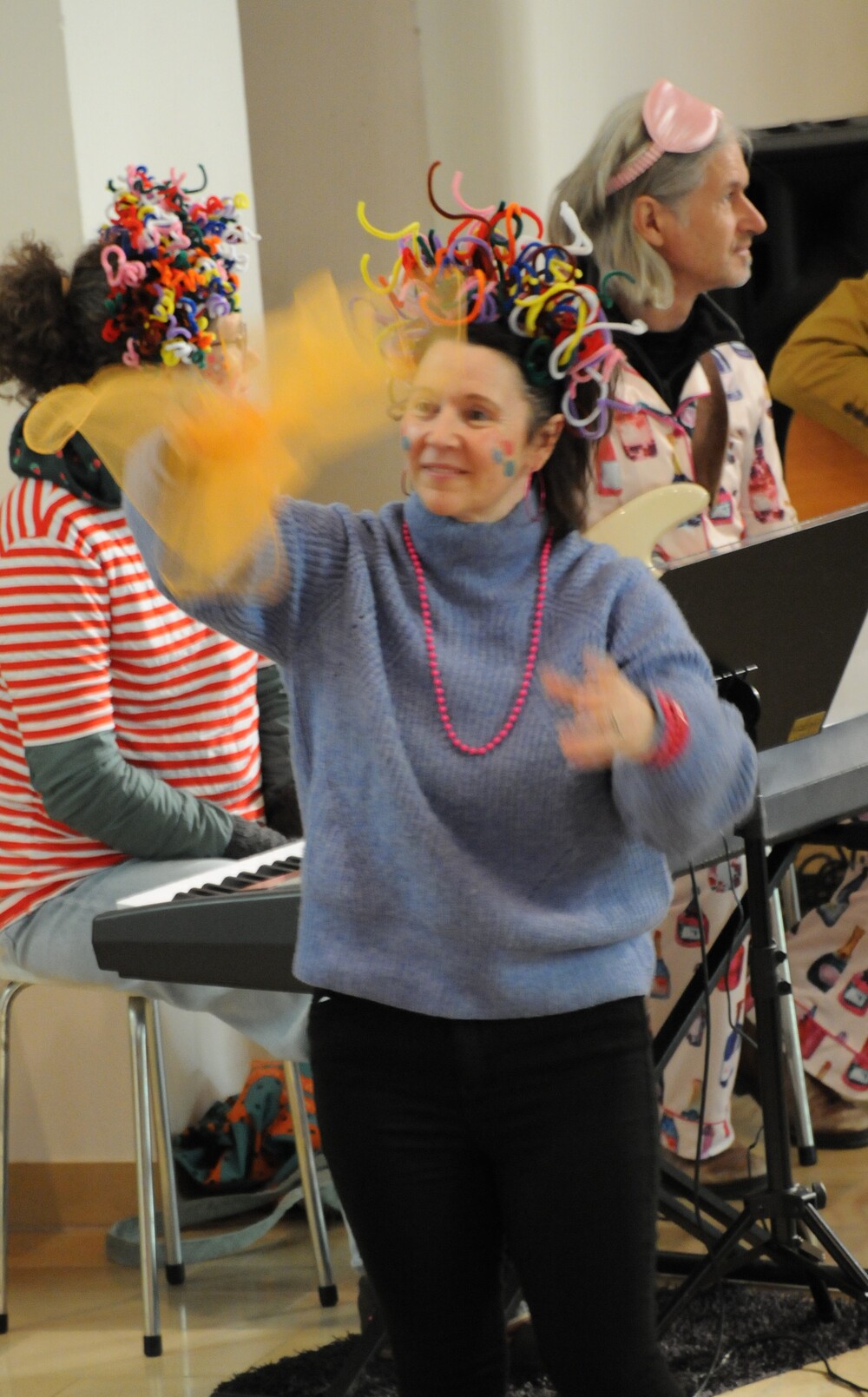 Schon beim Betreten der Kirche war eine besondere Atmosphäre spürbar und der Leitsatz für diesen speziellen Sonntag erkennbar: eine bunte Schar von farbigen Luftballons verwandelte den Gabentisch in eine Farbpalette, wobei die verschiedenen Farben nicht nur schön ausschauten, sondern auch voll dem Grundgedanken des Gottesdienstes entsprachen, weil die Farbkombinationen - inspiriert von der Natur und dem Alltag - so gewählt waren, dass sie zu einzelnen Abschnitten des Gottesdienstes die praktische Inspiration lieferten. Viele Gläubige, darunter zahlreiche Kinder, erschienen als „lustige Gestalten“ kostümiert, besonders auffällig waren die Damen vom Chor imPuls mit ihren bunten, schillernden „Trendfrisuren“ und farbenfrohen Tüchern. Auch die Ministranten waren etwas bunter als sonst und selbst Vikar Edwin Matt ließ es sich nicht nehmen, beim Einzug ein elegantes Faschingshütchen zu tragen.