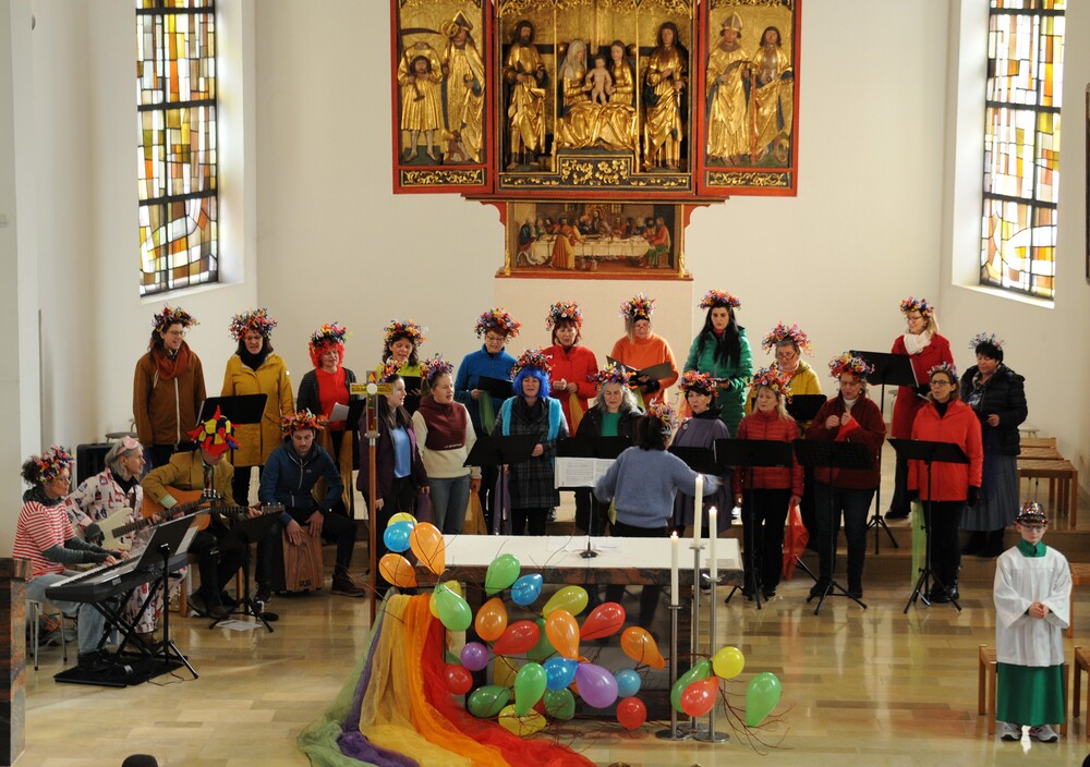 - Der Farbenstreit, ein Zwiegespräch zwischen den Farben grün, blau, gelb, orange, rot und violett, vorgetragen von zwei Chormitgliedern. Wobei am Schluss die Frage auftauchte, warum überhaupt gestritten wird, weil jede Farbe wichtig und doch einzigartig ist! „Wir wollen alle zusammen einen Bogen über die Erde spannen, zum Zeichen, dass Gott euch alle gleich liebt und ihr in Frieden leben wollt.“