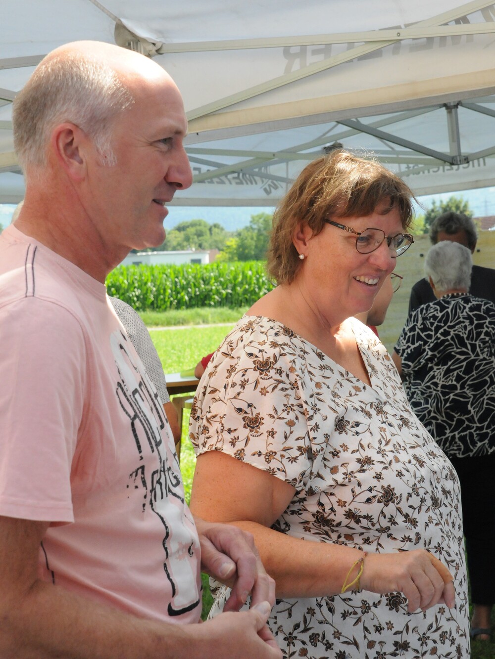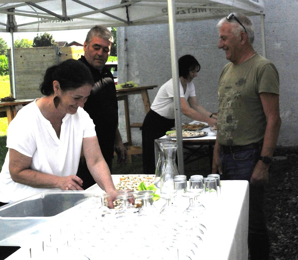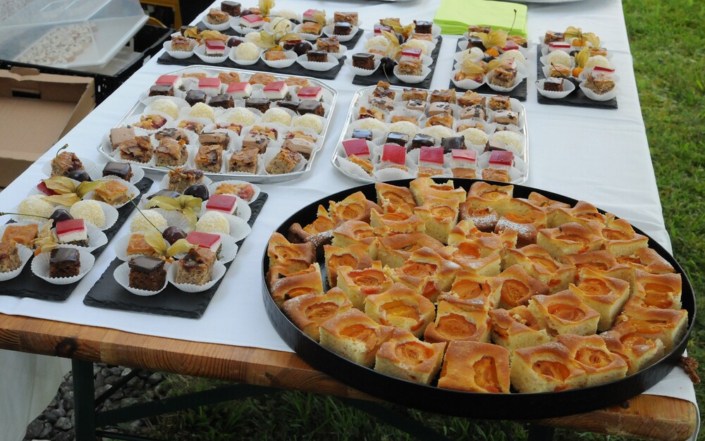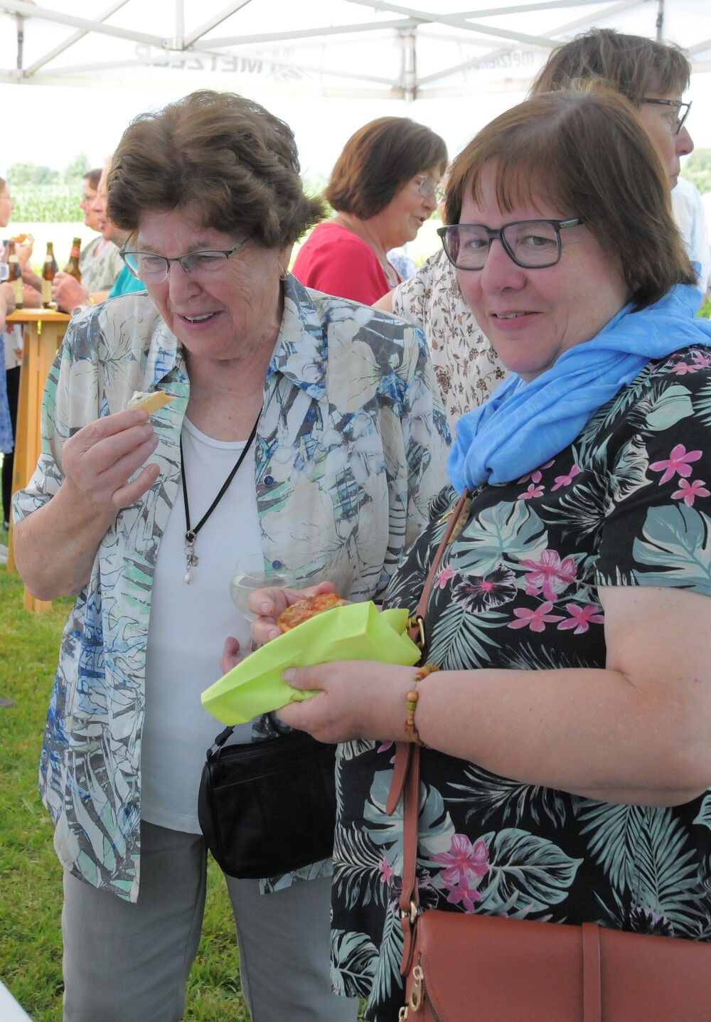 Im Anschluss an das feierliche Hochamt wurden die Kirchenbesucher*innen zu einer Agape auf der Nordseite der Kirche eingeladen. Der Pfarrgemeinderat überraschte die einheimischen und auch auswärtigen Gläubigen mit kleinen, handlichen Häppchen (Fingerfood). Auch leckere Kuchenstücke und Getränke luden zum Verweilen ein. Die Möglichkeit, mit Bekannten oder Fremden ins Gespräch zu kommen, wurde eifrig genutzt.