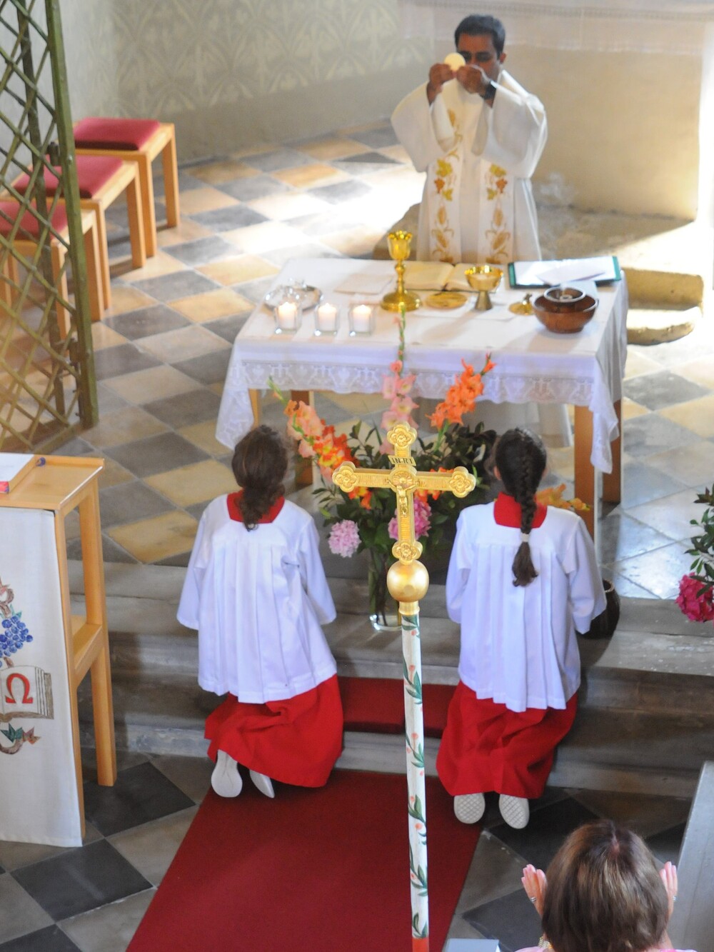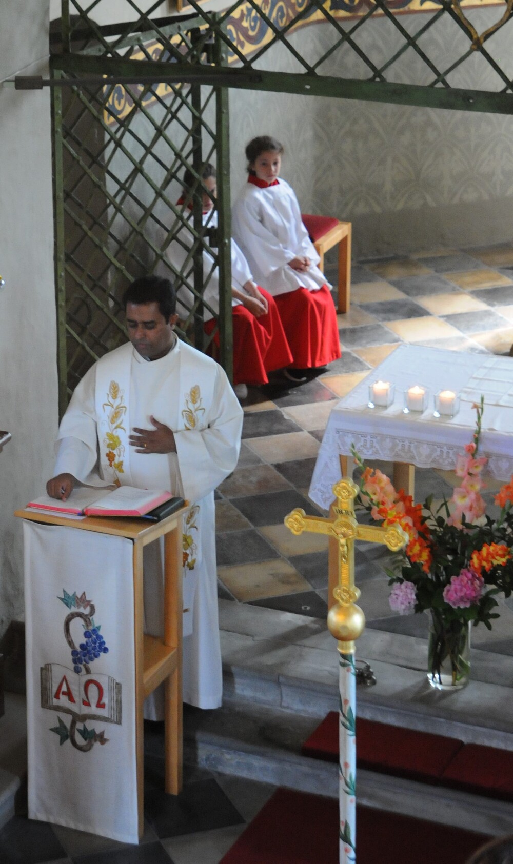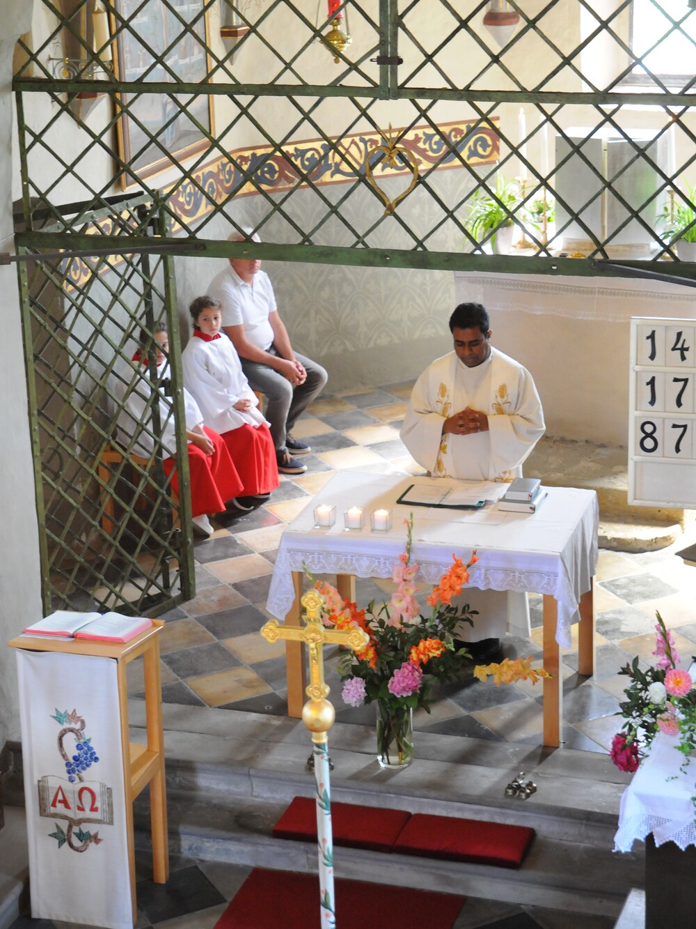 Eingebettet in dieses prachtvolle Umfeld zelebrierte Pfr. Noby Acharuparambil den Festgottesdienst, der von einem Gesangstrio aus Göfis mit wunderschön getragenen Stimmen musikalisch begleitet wurde, wobei neben Liedern aus dem Gotteslob auch Einzelstücke von liturgischen Messen zur Aufführung gelangten. Gerade in diesem kleinen Innenraum, der mit einer sehr guten Akustik ausgestattet ist, berührte ihre Musik die Herzen der Zuhörenden.