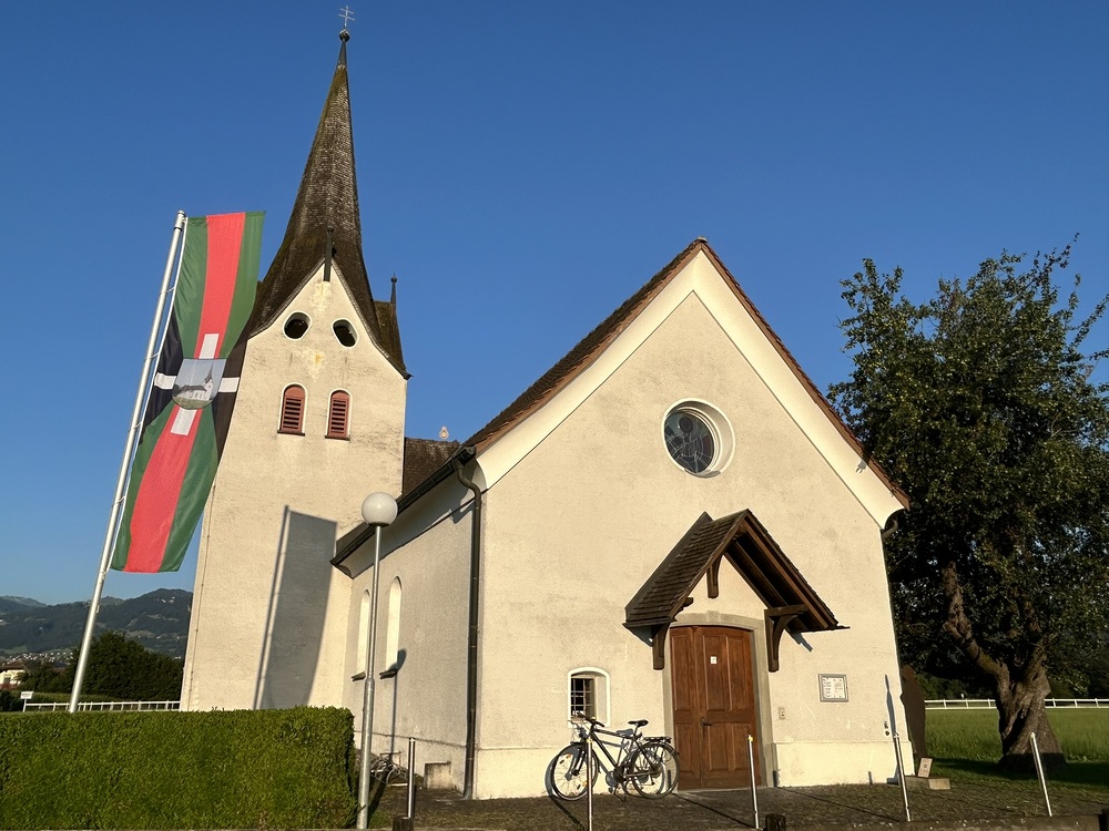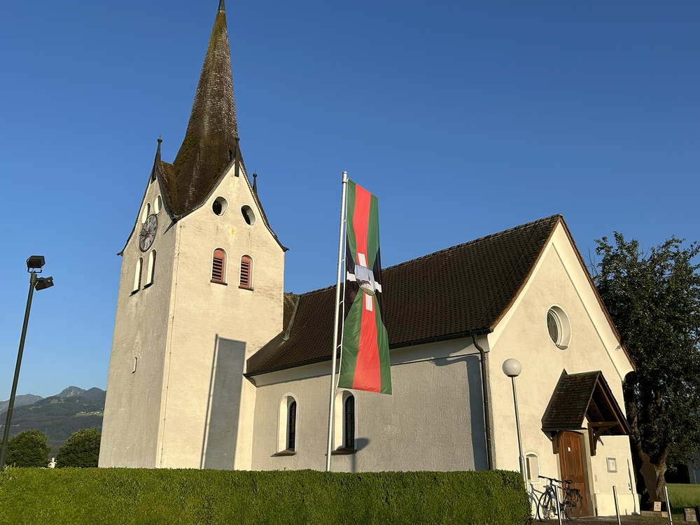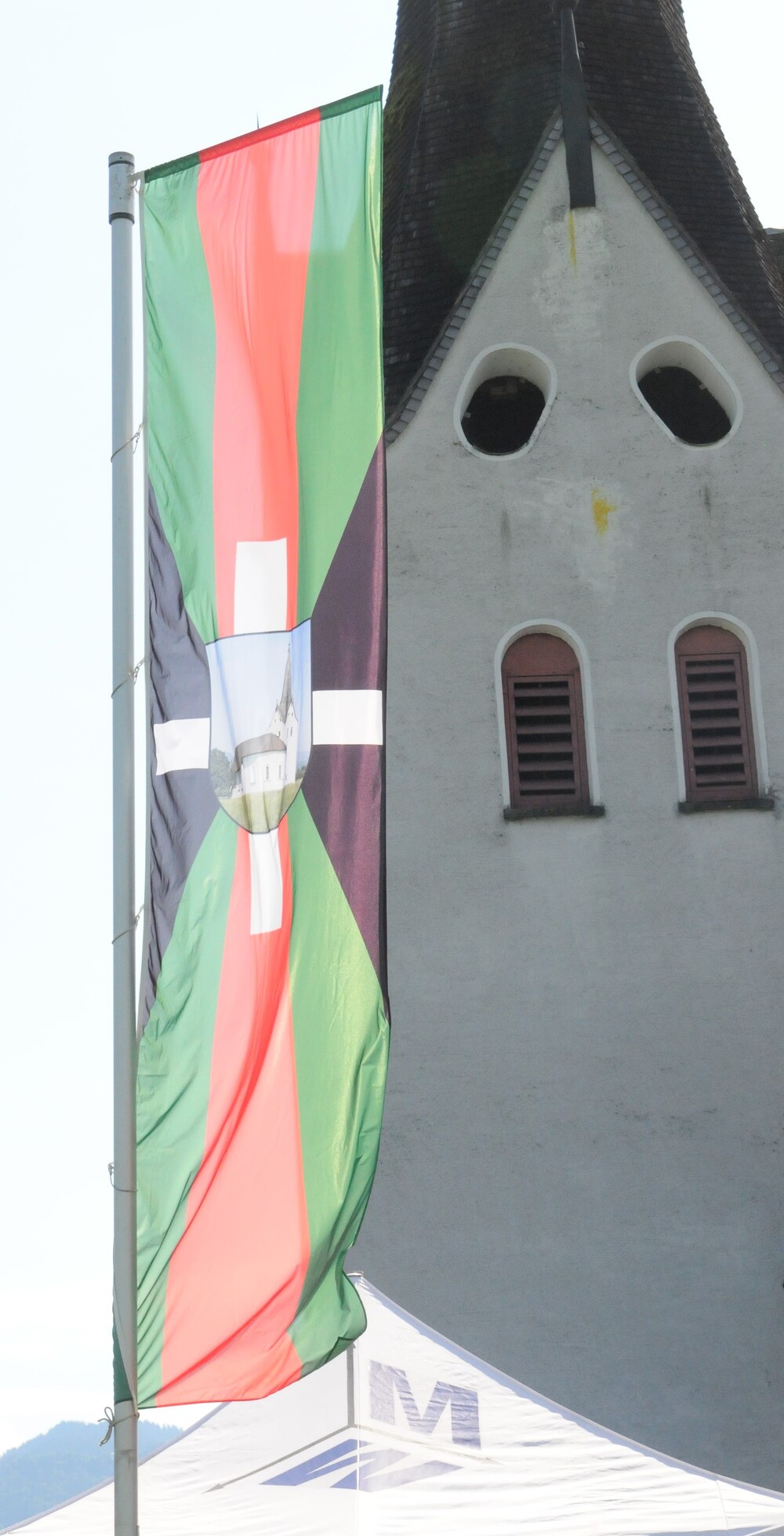 Auf diese besondere Festlichkeit wies die bei der Kirche vom Kulturverein Volk-Land-Zukunft Brederis extra für diesen Anlass gehisste Sigmund Nachbauer Fahne hin, die immer bei speziellen kirchlichen Ereignissen in Brederis präsent ist.
