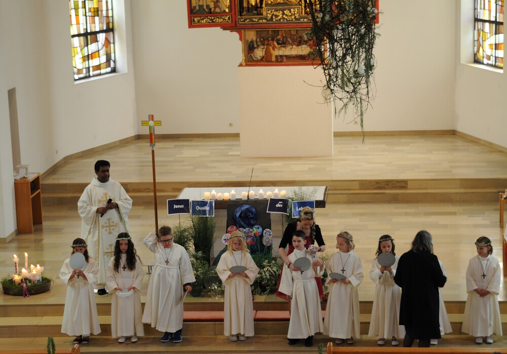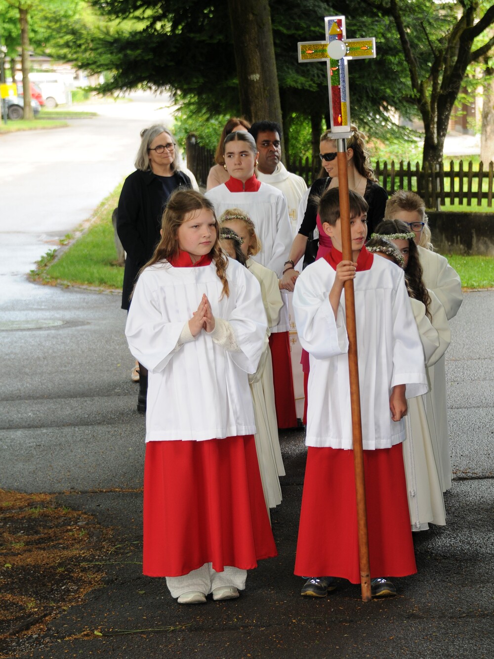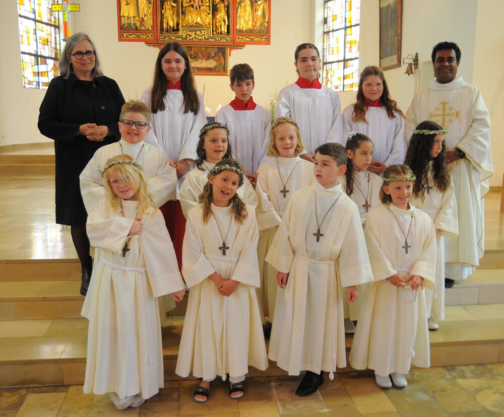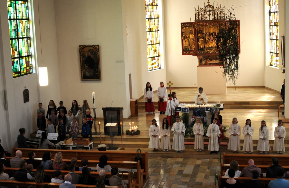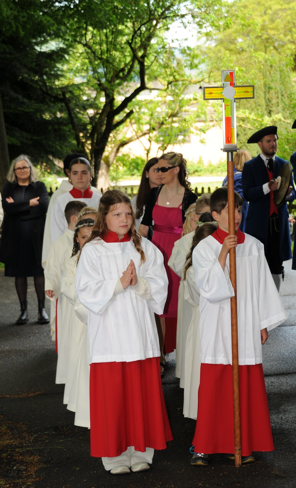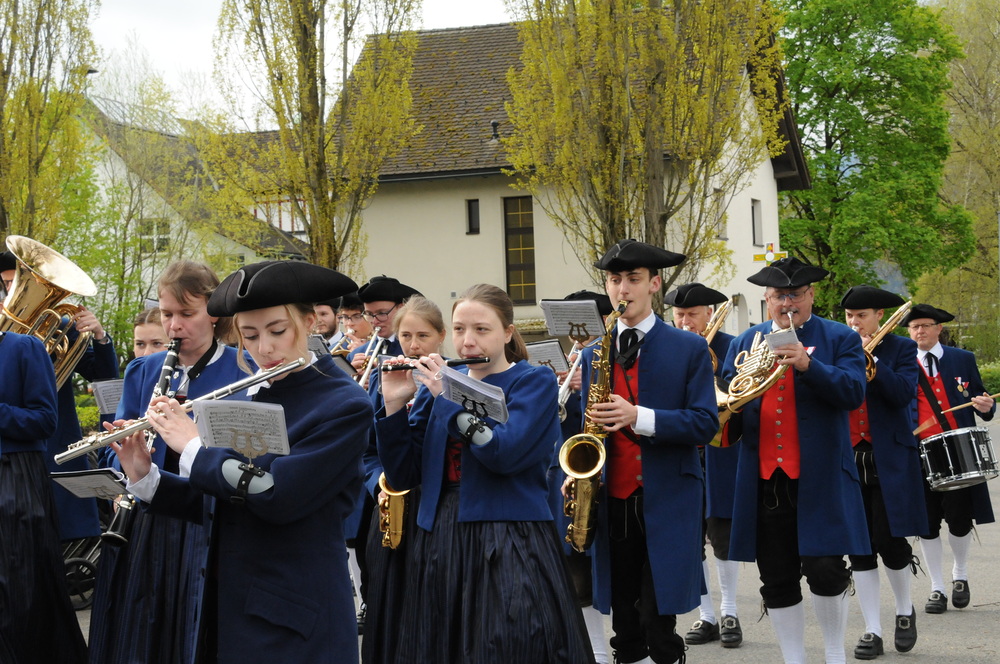 Die „kleinen Festgäste“ versammelten sich am Schulplatz und wurden dort von Pfarrer Noby Acharuparambil begrüßt. Angeführt von der Bürgermusik Rankweil zogen sie dann zusammen mit der Ministrantenschar, dem Priester und dem Planungsteam (RL Barbara Halbeisen, Manuela Kinz-Marte, Andrea Tiefenthaler) mit flotter Marschmusik von der Volksschule zur Kirche, in der Familie, Paten und Patinnen sowie Verwandte und Freunde bereits auf sie warteten.