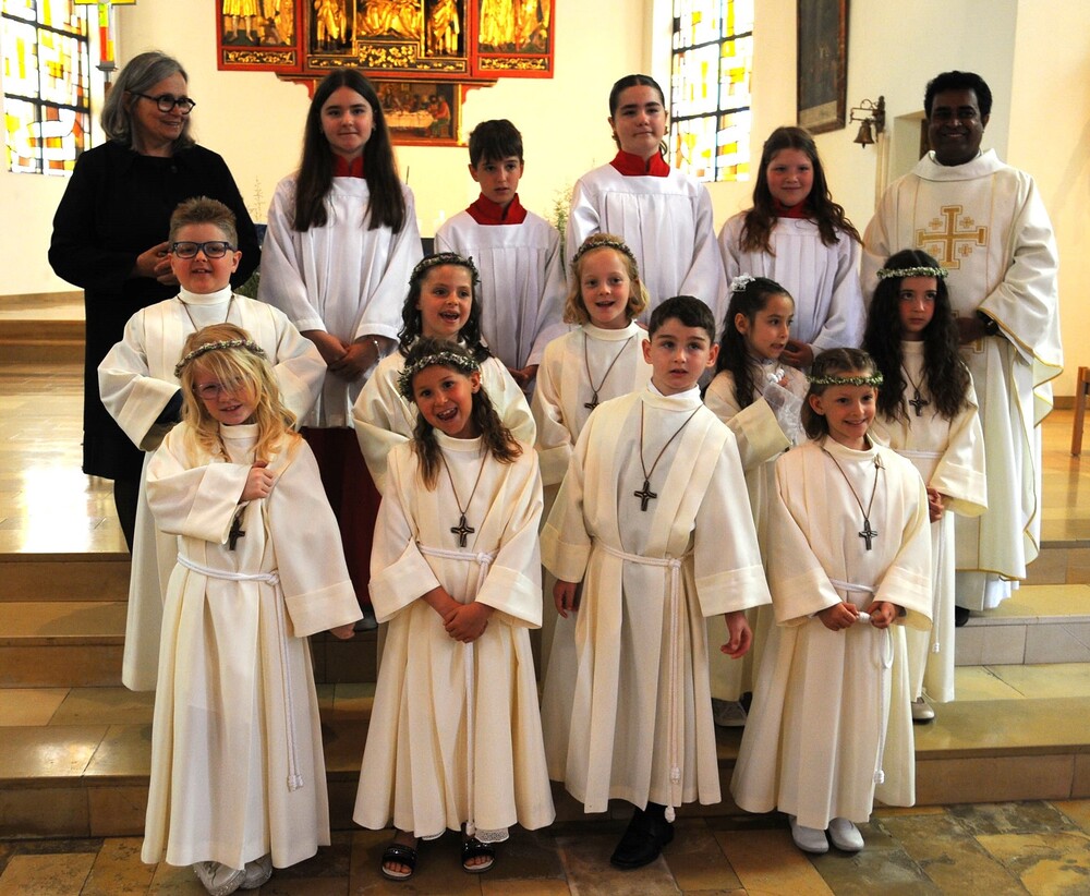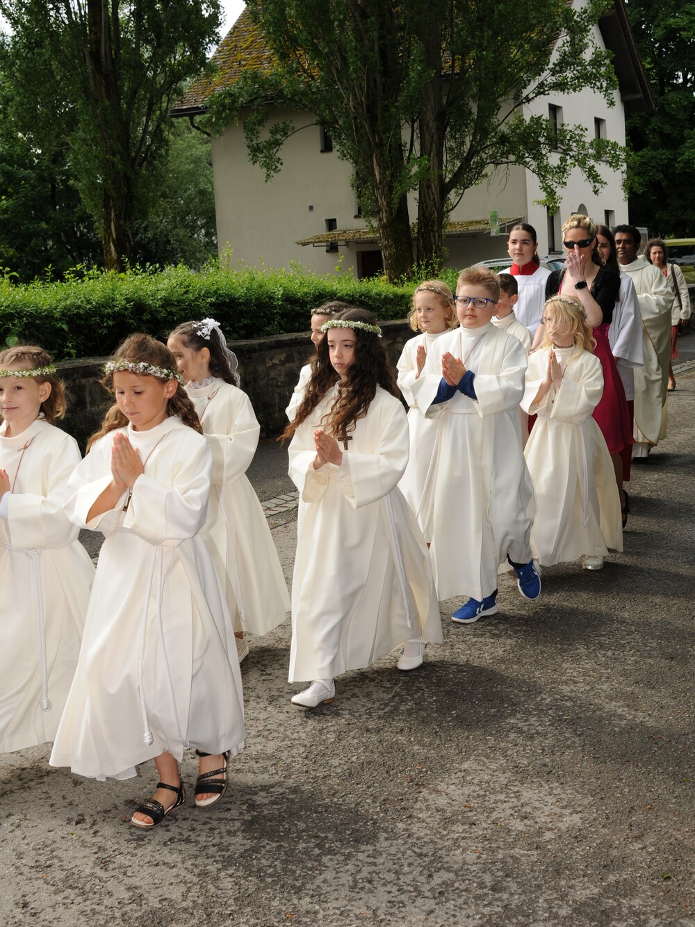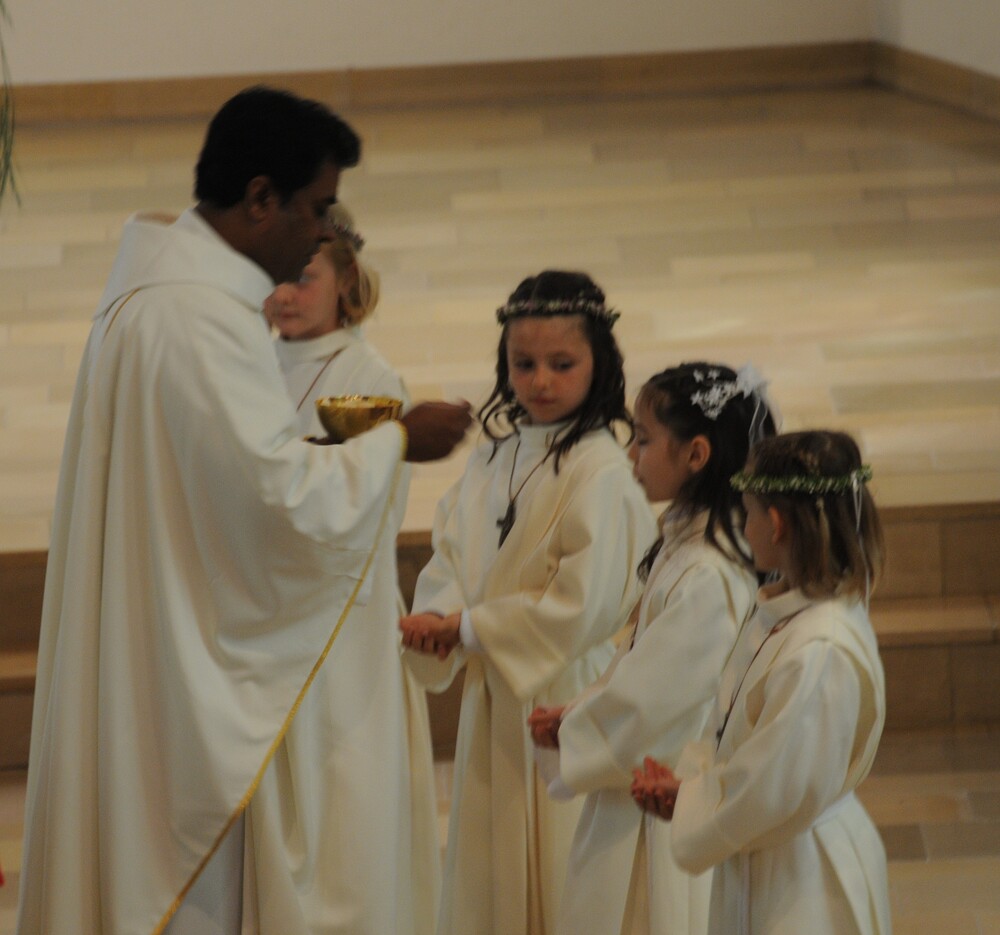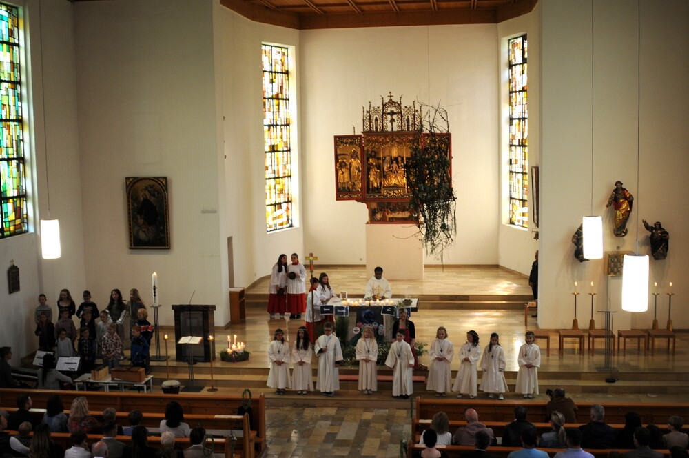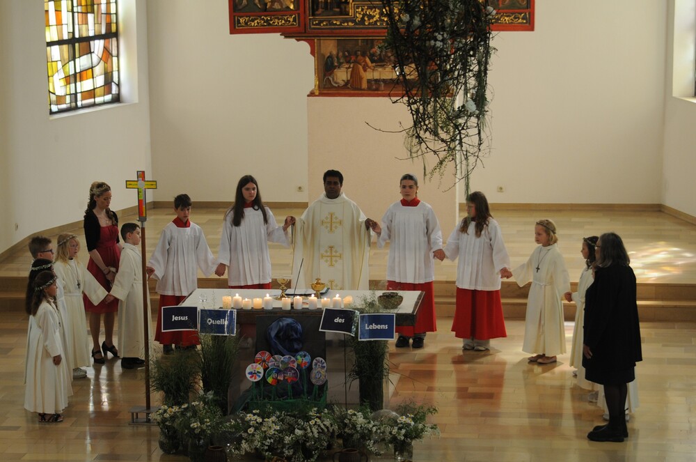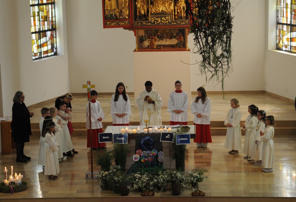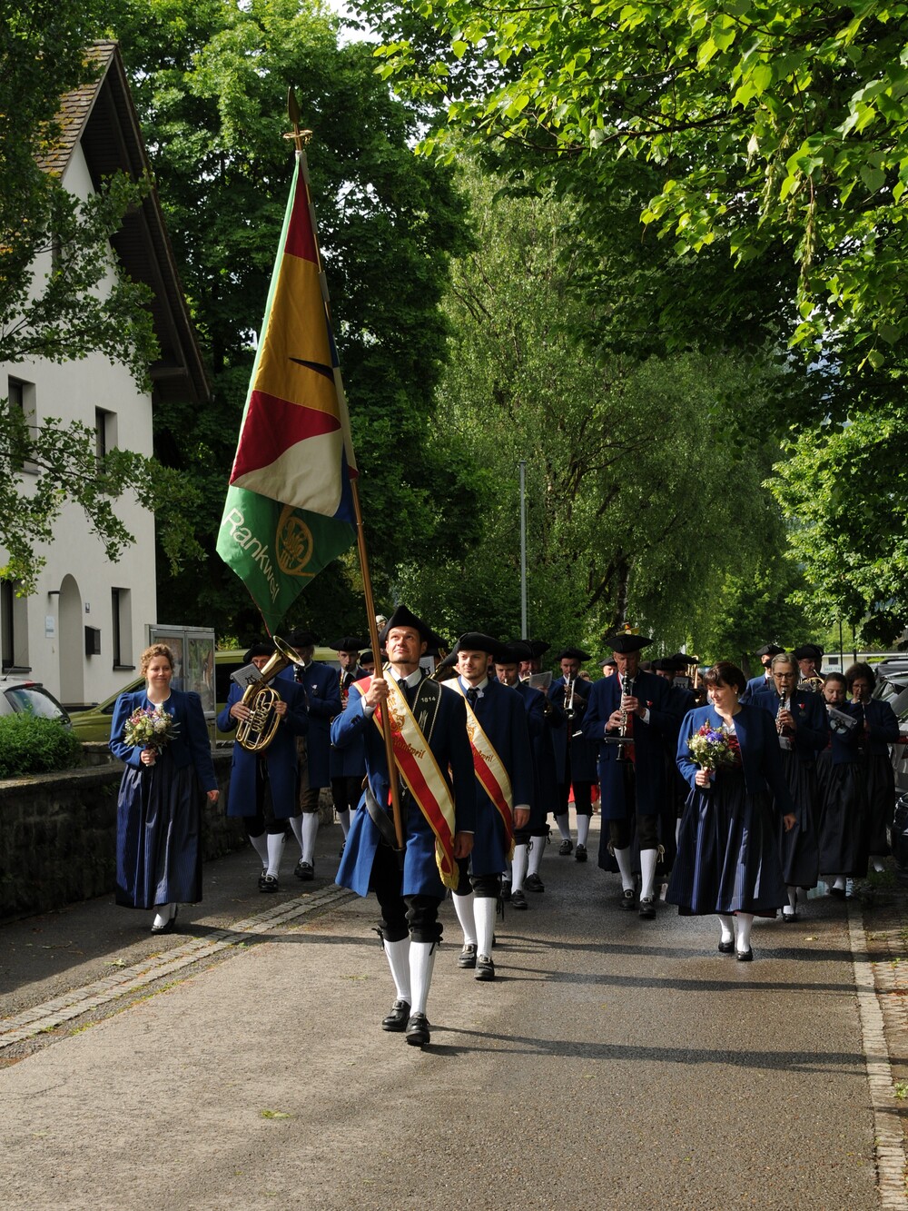 Die „kleinen Festgäste“ versammelten sich am Schulplatz und wurden dort von Pfarrer Noby Acharuparambil begrüßt. Angeführt von der Bürgermusik Rankweil zogen sie dann zusammen mit der Ministrantenschar, dem Priester und dem Planungsteam (RL Barbara Halbeisen, Manuela Kinz-Marte, Andrea Tiefenthaler) mit flotter Marschmusik von der Volksschule zur Kirche, in der Familie, Paten und Patinnen sowie Verwandte und Freunde bereits auf sie warteten.