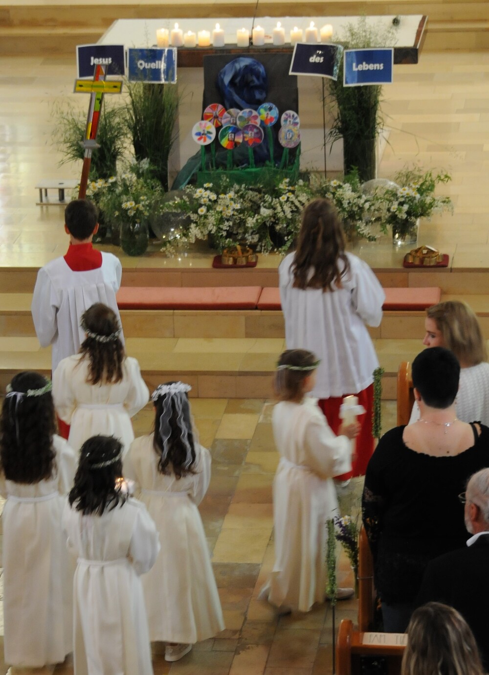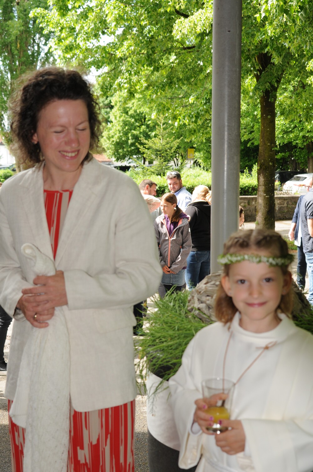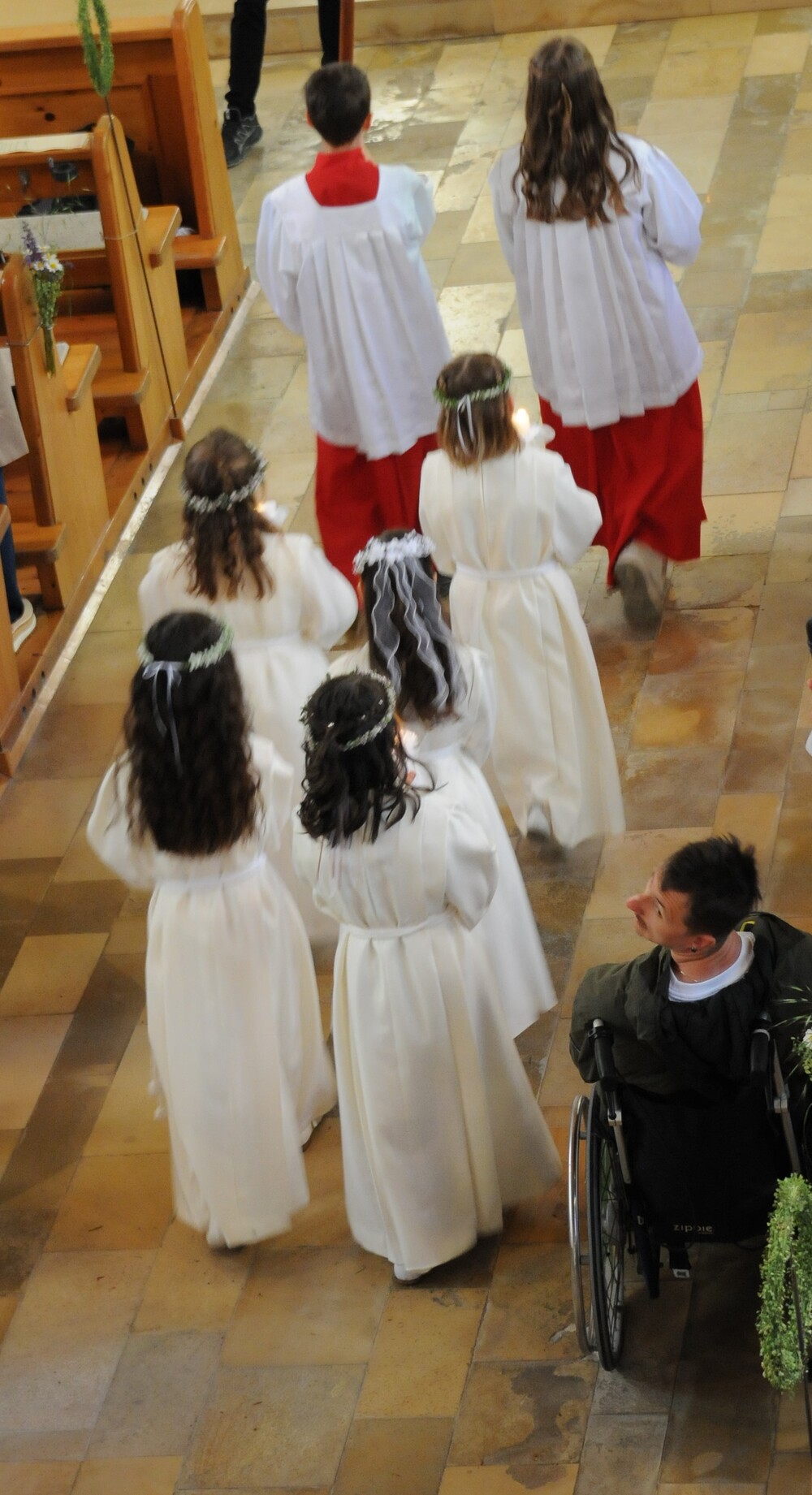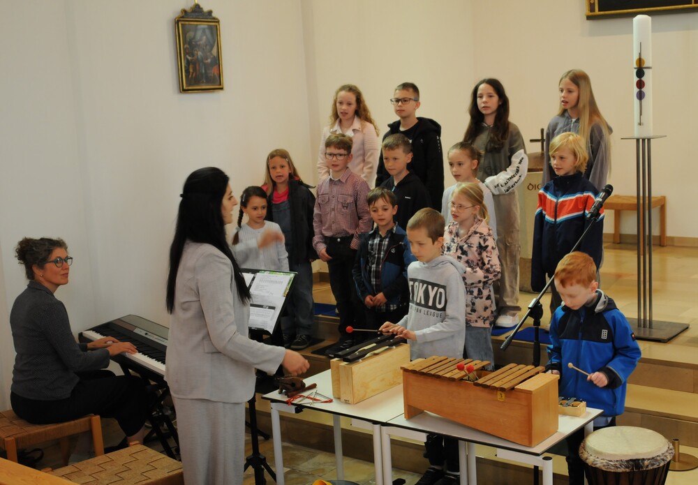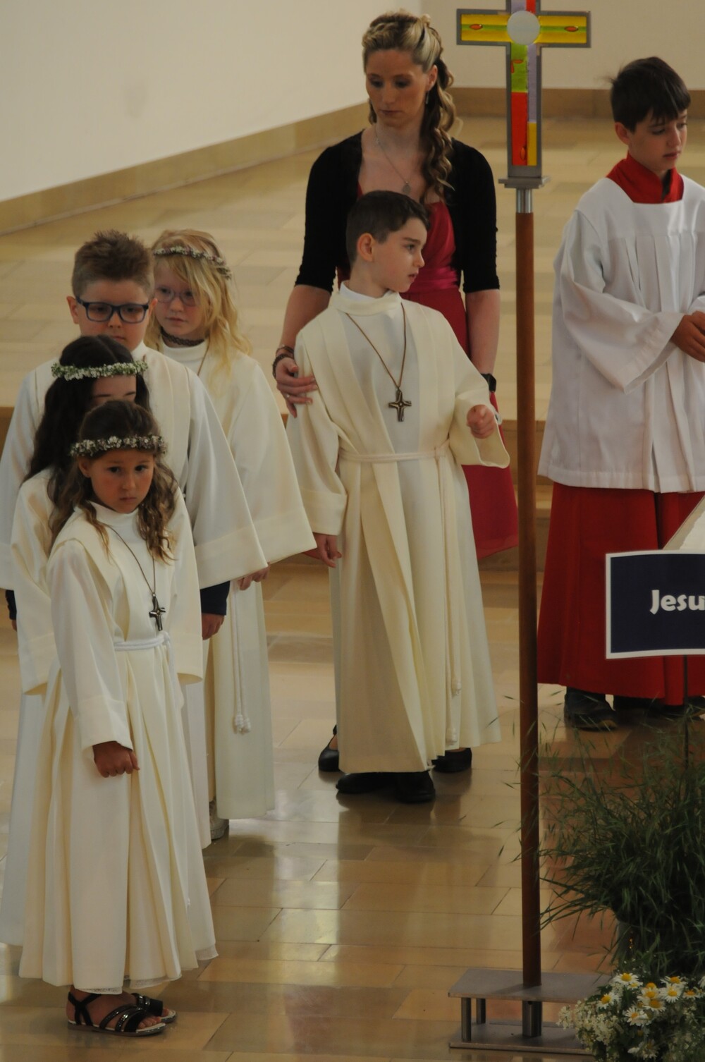 Die „kleinen Festgäste“ versammelten sich am Schulplatz und wurden dort von Pfarrer Noby Acharuparambil begrüßt. Angeführt von der Bürgermusik Rankweil zogen sie dann zusammen mit der Ministrantenschar, dem Priester und dem Planungsteam (RL Barbara Halbeisen, Manuela Kinz-Marte, Andrea Tiefenthaler) mit flotter Marschmusik von der Volksschule zur Kirche, in der Familie, Paten und Patinnen sowie Verwandte und Freunde bereits auf sie warteten.
