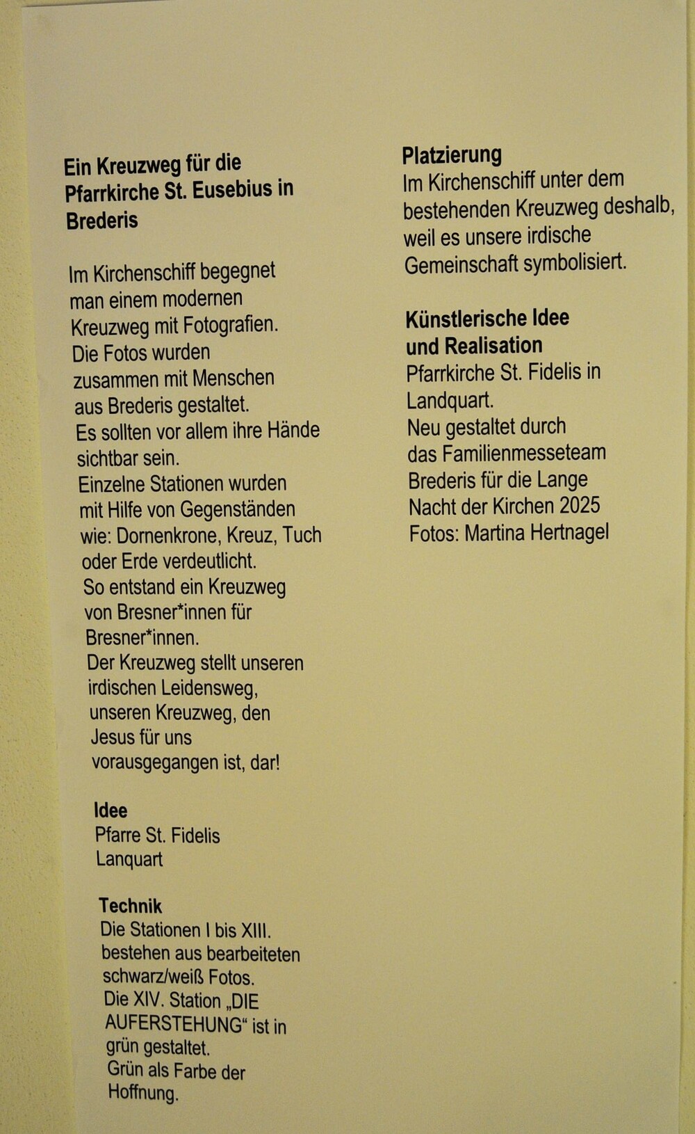 - die 14 großflächigen in schwarz-weiß gehaltenen Händen von Bresner*innen, fotografiert v. Martina Hertnagel und untermauert mit Texten von Hans Thomann, Mirijam Krebs-Ziltener, Annemarie Fehrenbacher.
