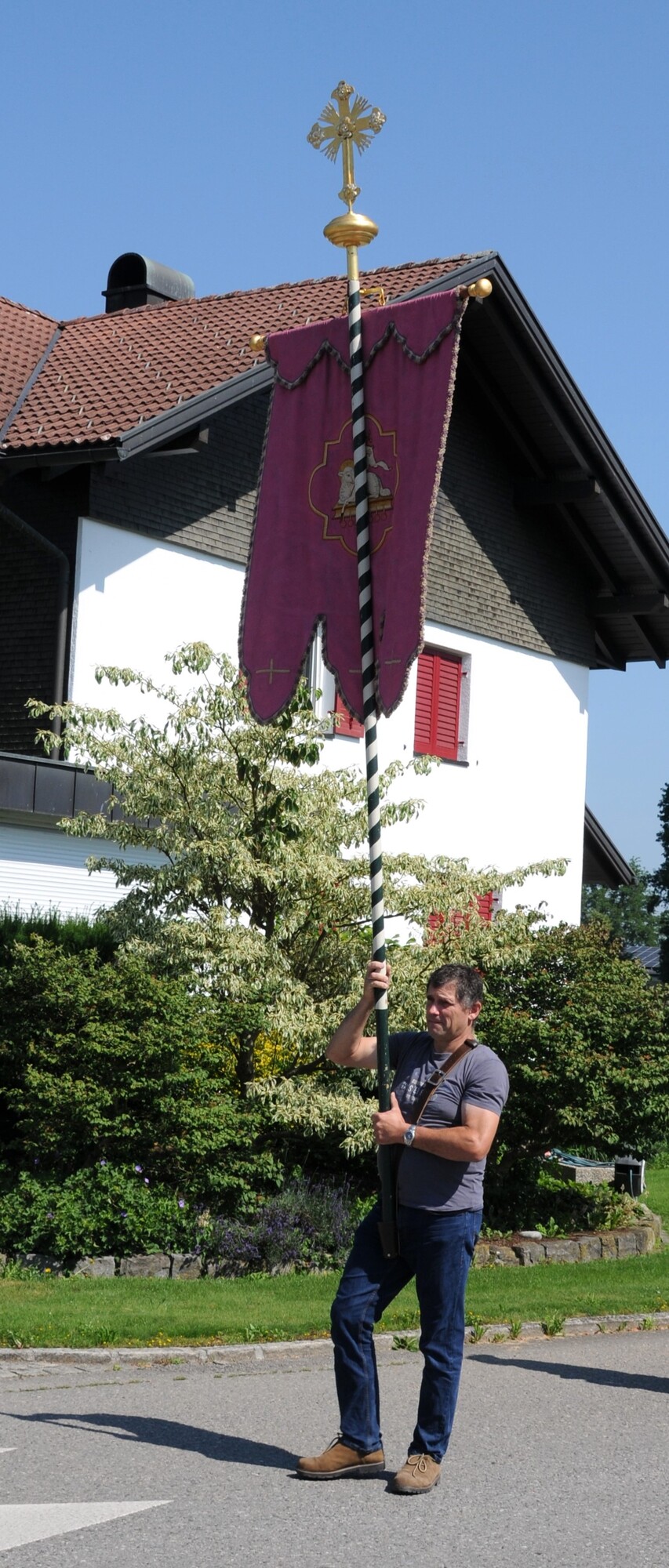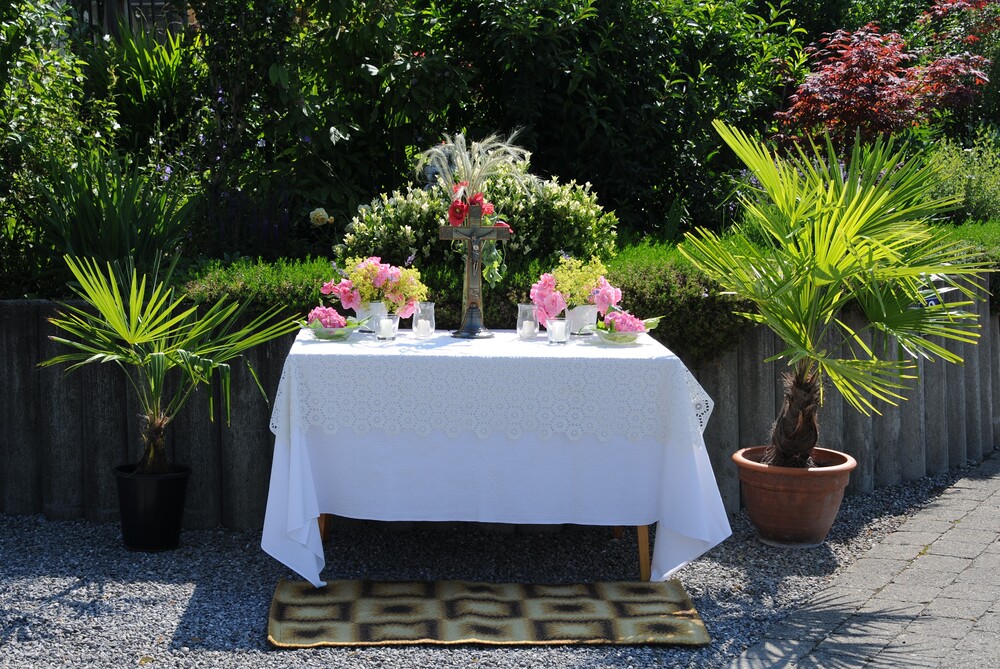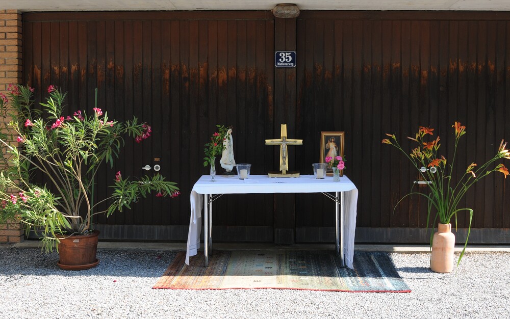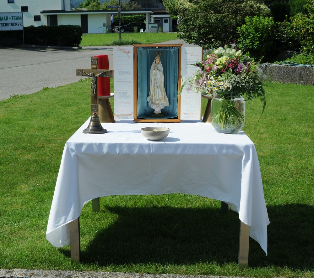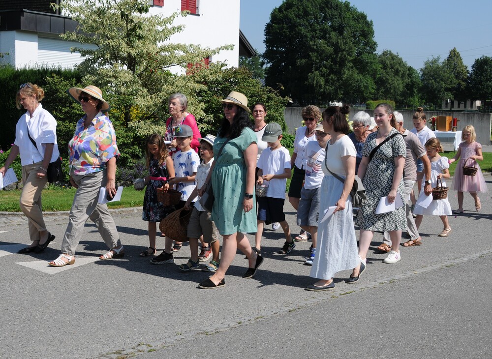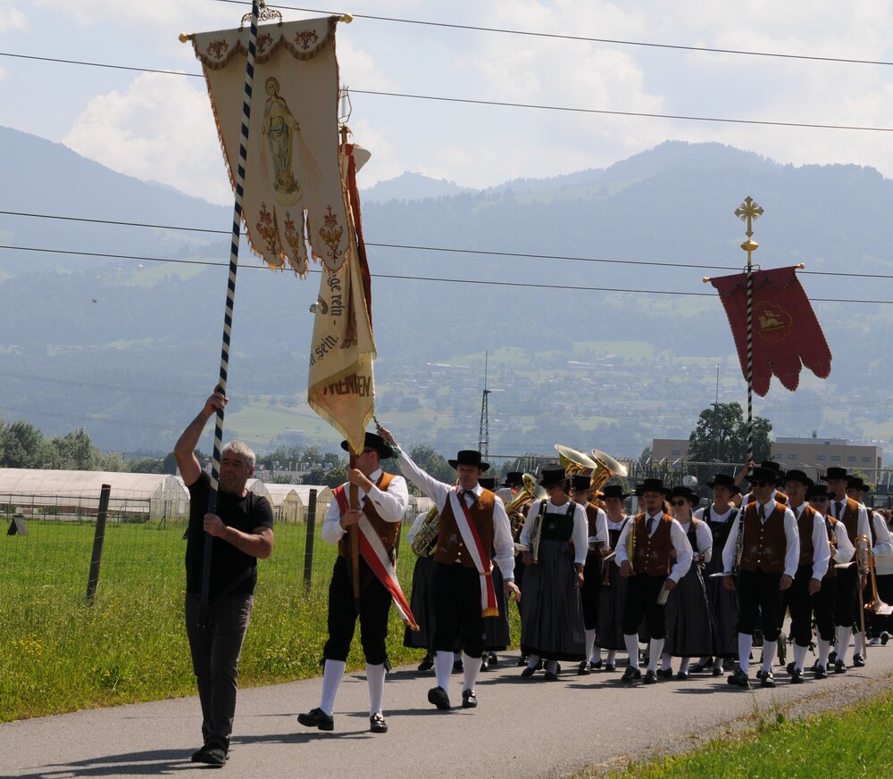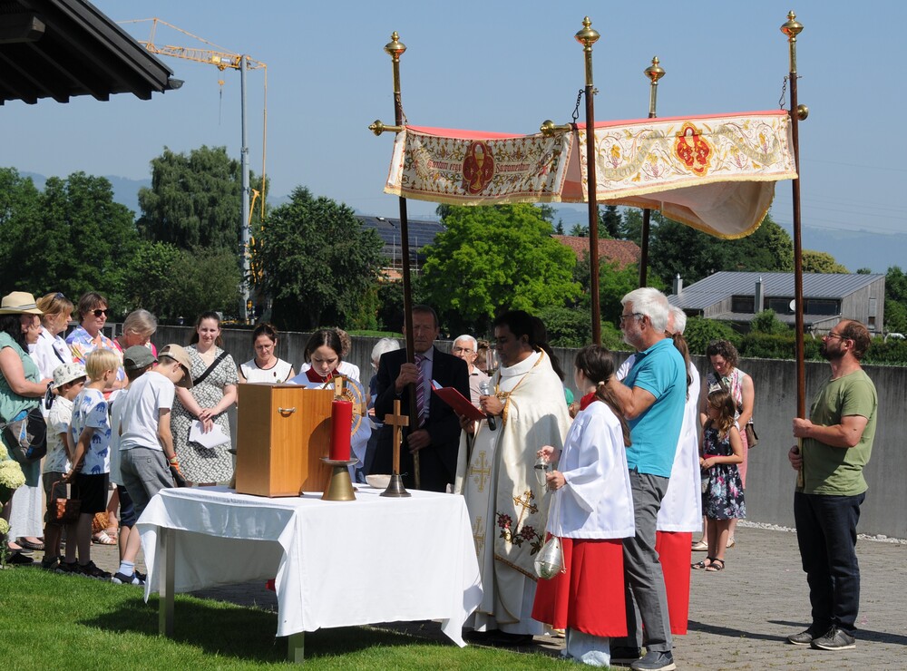 Im Anschluss an die Festmesse folgte dann bei wunderbarem Wetter die eindrucksvolle Prozession, heuer wieder in Brederis. Entlang des Prozessionsweges (Pfarrkirche - Kirchstr. - Hinter den Bündten - Im Gässele - St. Eusebius Str. - Madlenerweg - Pfarrkirche) waren an vier Stationen von den Hausbesitzern kleine Altäre errichtet worden, an denen die Prozession Halt machte. Sie entsprechen den vier Himmelsrichtungen und den vier Evangelien. An jeder Station wurde ein Abschnitt aus einem Evangelium vorgelesen, es wurden Fürbitten und Gebete gesprochen, sowie Hymnen gesungen. Darüber hinaus erteilte der Priester den eucharistischen Segen in jede Himmelsrichtung und über das Dorf.