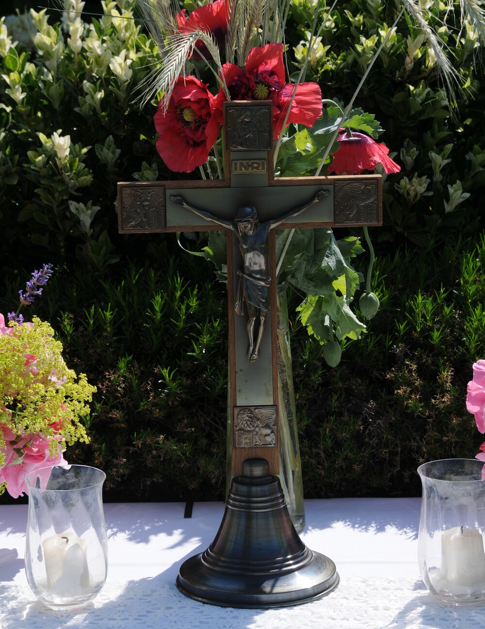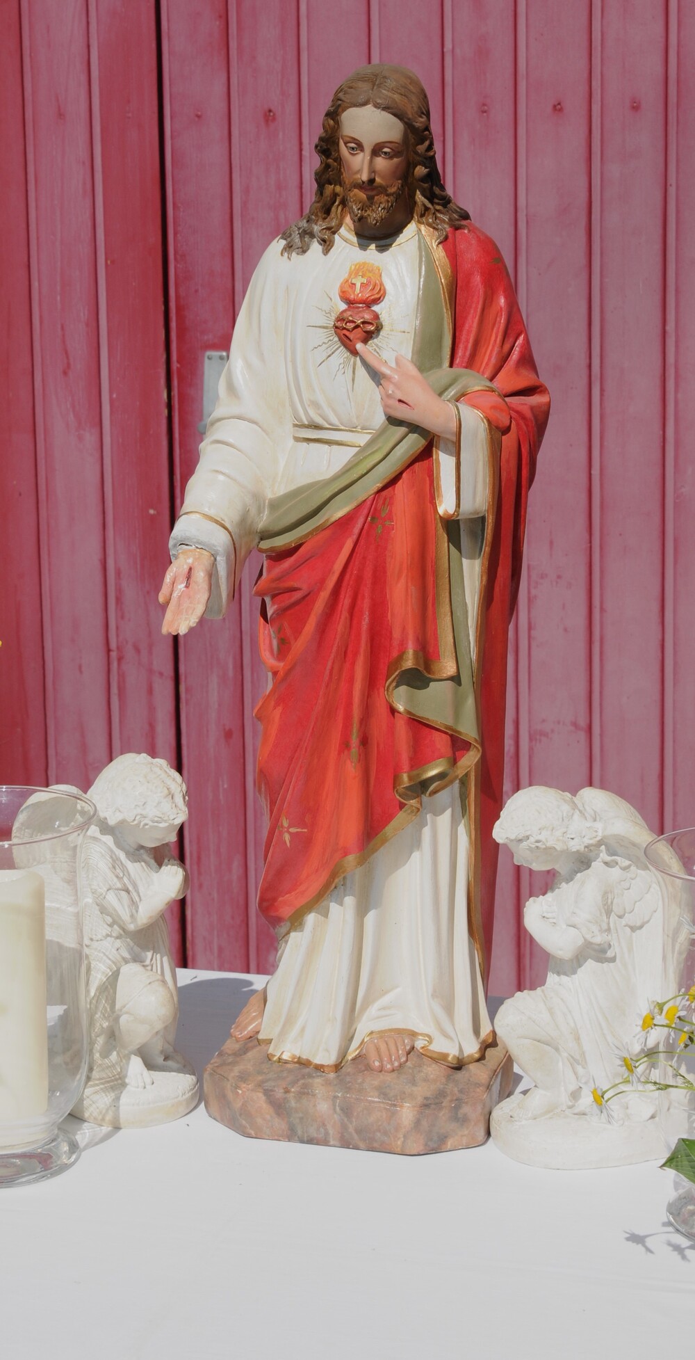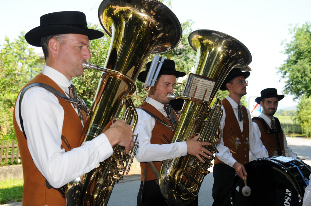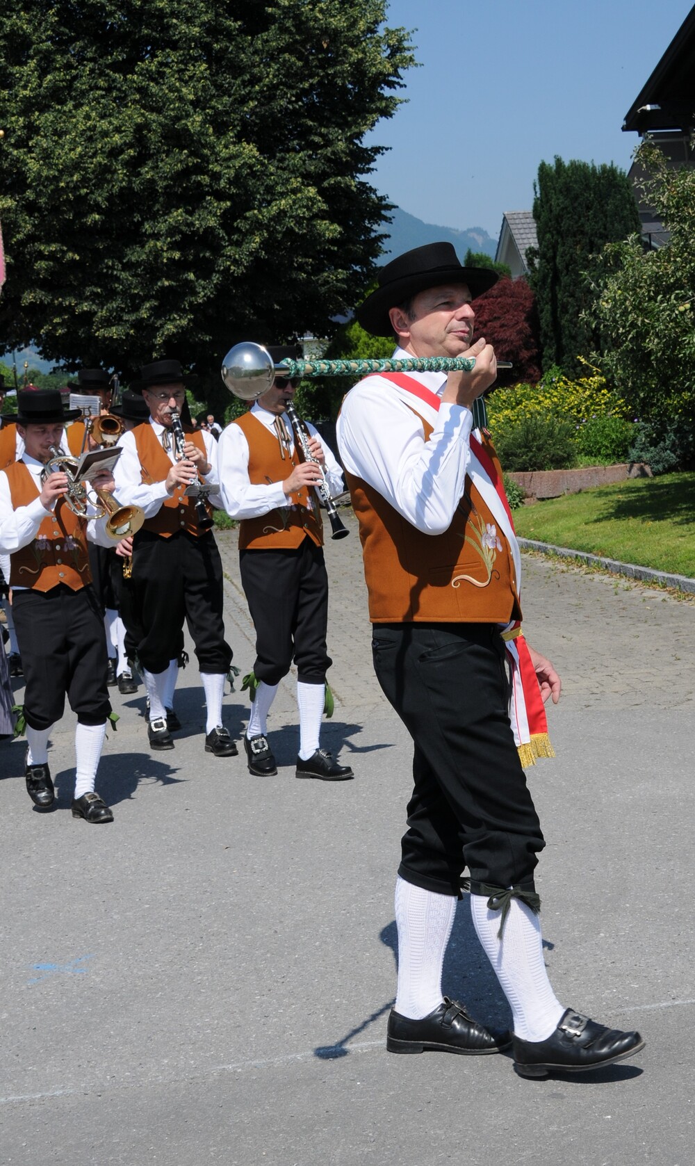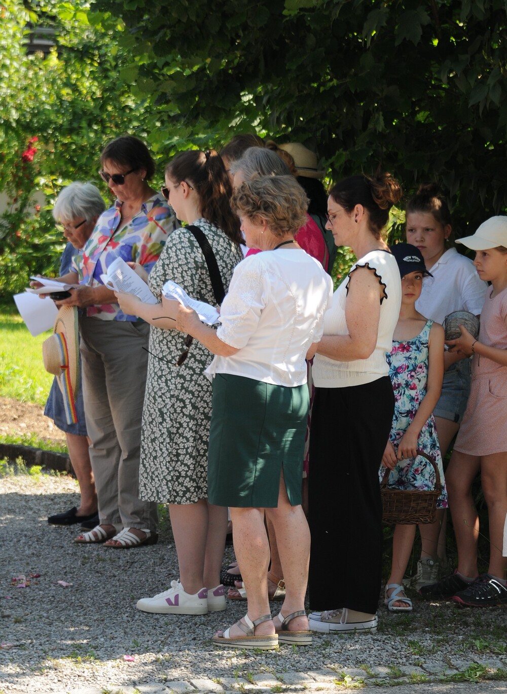 Im Anschluss an die Festmesse folgte dann bei wunderbarem Wetter die eindrucksvolle Prozession, heuer wieder in Brederis. Entlang des Prozessionsweges (Pfarrkirche - Kirchstr. - Hinter den Bündten - Im Gässele - St. Eusebius Str. - Madlenerweg - Pfarrkirche) waren an vier Stationen von den Hausbesitzern kleine Altäre errichtet worden, an denen die Prozession Halt machte. Sie entsprechen den vier Himmelsrichtungen und den vier Evangelien. An jeder Station wurde ein Abschnitt aus einem Evangelium vorgelesen, es wurden Fürbitten und Gebete gesprochen, sowie Hymnen gesungen. Darüber hinaus erteilte der Priester den eucharistischen Segen in jede Himmelsrichtung und über das Dorf.