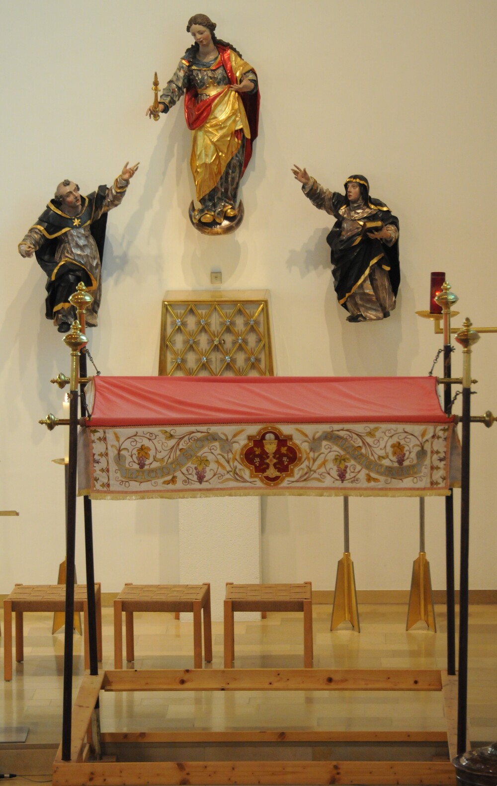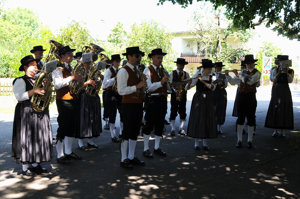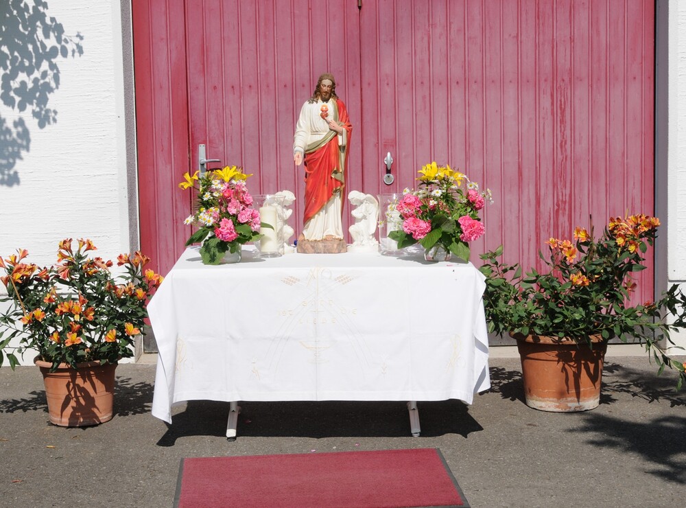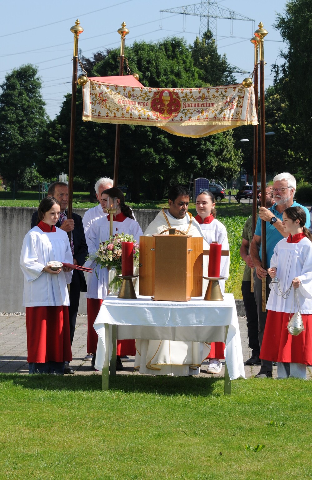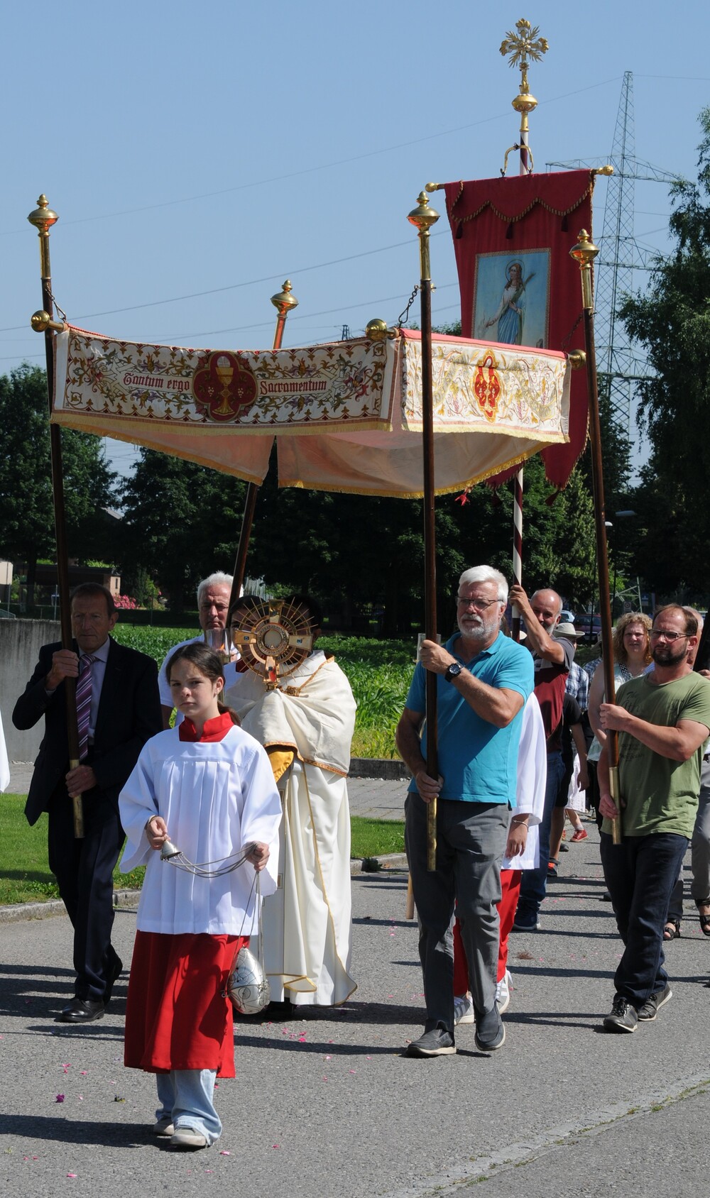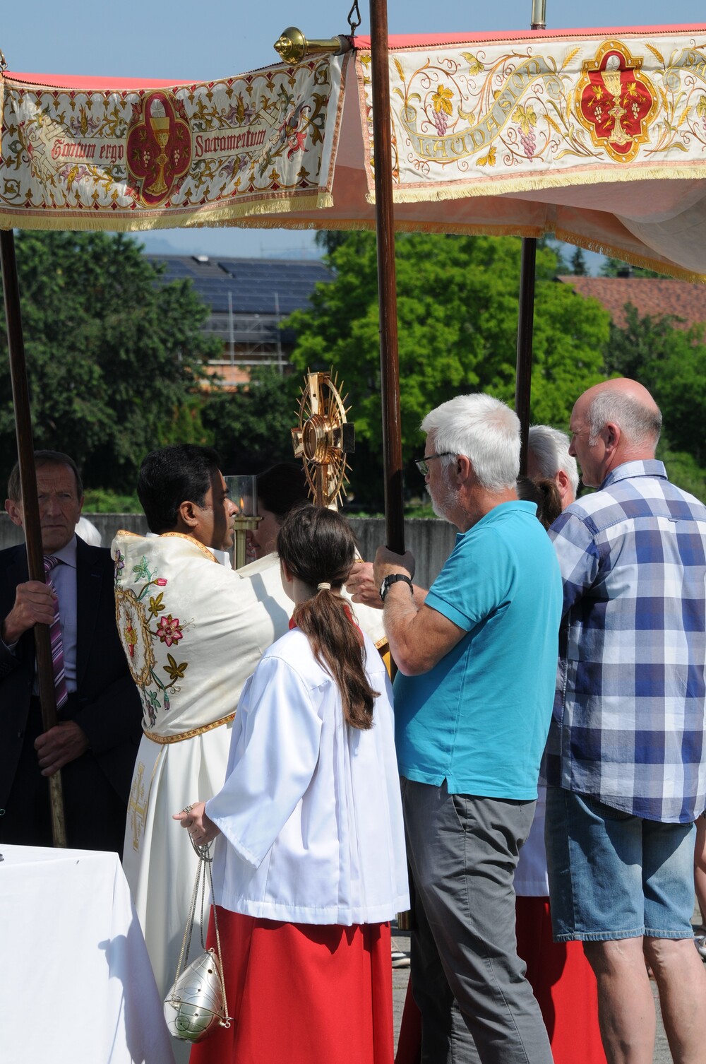 Im Zentrum der Feierlichkeit stand die Monstranz mit der konsekrierten Hostie, getragen von Pfr. Noby unter einem Baldachin, dem sog. „Himmel“, der von vier "Himmelträgern" (Christoph Kessler/Arnulf Amann/Ulrich Tiefenthaler/Konrad Schlömmer) getragen wurde. Der Himmel ist ein Zeichen der Verehrung, aber auch ein sichtbares Zeichen der Gegenwart Christi mitten unter uns. „Christus geht mit, er erschließt uns die Welt, er lässt uns den Sinn des Lebens spüren und schenkt uns die Kraft für den weiteren Lebensweg.“