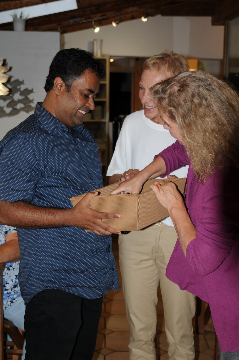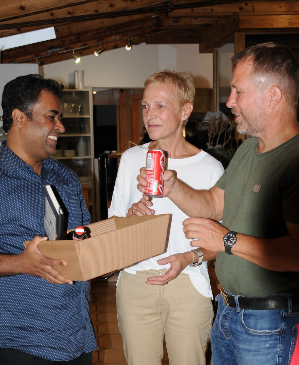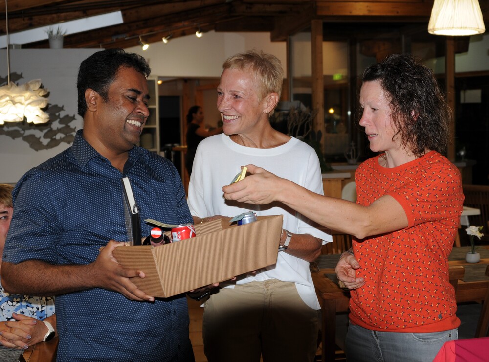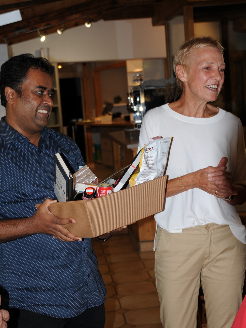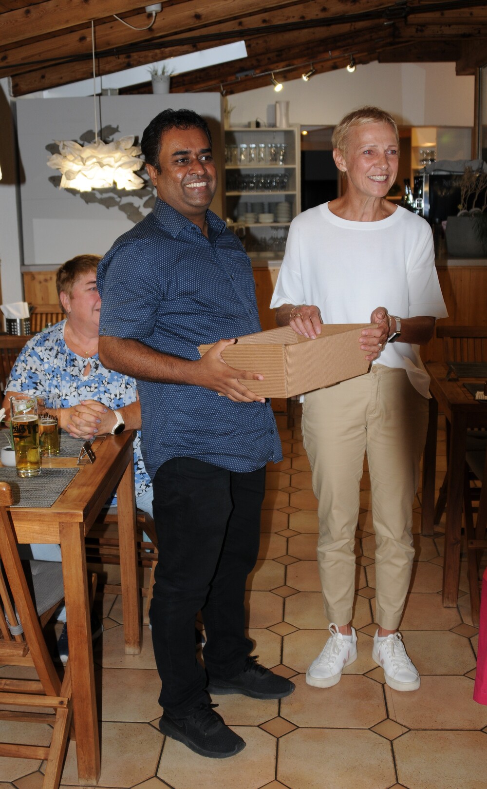 Nach diesem ästhetischen Vergnügen mit vielen Eindrücken folgte der kulinarische Teil im Anglerparadies Güfel nur einige Meter weiter. Ein Highlight des Abends waren mit Sicherheit am Beginn die „wertschätzenden Aussagen“ von Margot an die Ehrenamtlichen. Sie bezeichnete u.a. die vielen tollen Teams als das Rückgrat der Pfarre und bedankte sich für das unermüdliche Wirken. Ganz besonders liebe, nette Worte fand Margot für Pfr. Noby, der für drei Jahre an die Universität München wechselt, um dort das Studium in Kirchenrecht zu beginnen. Sie überraschte ihn mit einem „Notfallpaket“, vollgepackt mit unterschiedlichen Produkten von den einzelnen PGR-Mitgliedern und meinte dazu „…möge dir dieses Paket in Momenten der Sehnsucht ein Lächeln ins Gesicht zaubern. Möge es dich daran erinnern, dass hier Menschen sind, die an dich denken, dich unterstützen und sich auf deine Rückkehr freuen.“. Pfr. Noby bedankte sich einerseits für die Unterstützung für das „neue Kapitel“ in seinem Leben, andererseits vergaß er aber auch nicht die vielen Ehrenamtlichen, die Tag für Tag in der Pfarrgemeinde tätig sind. Ihnen allen gilt sein aufrichtiger DANK.