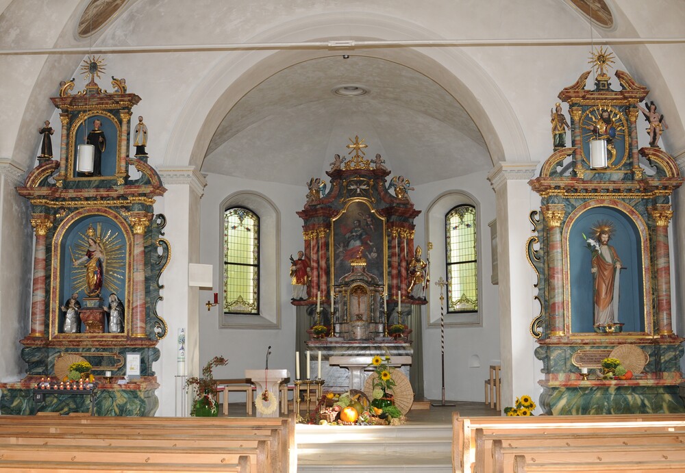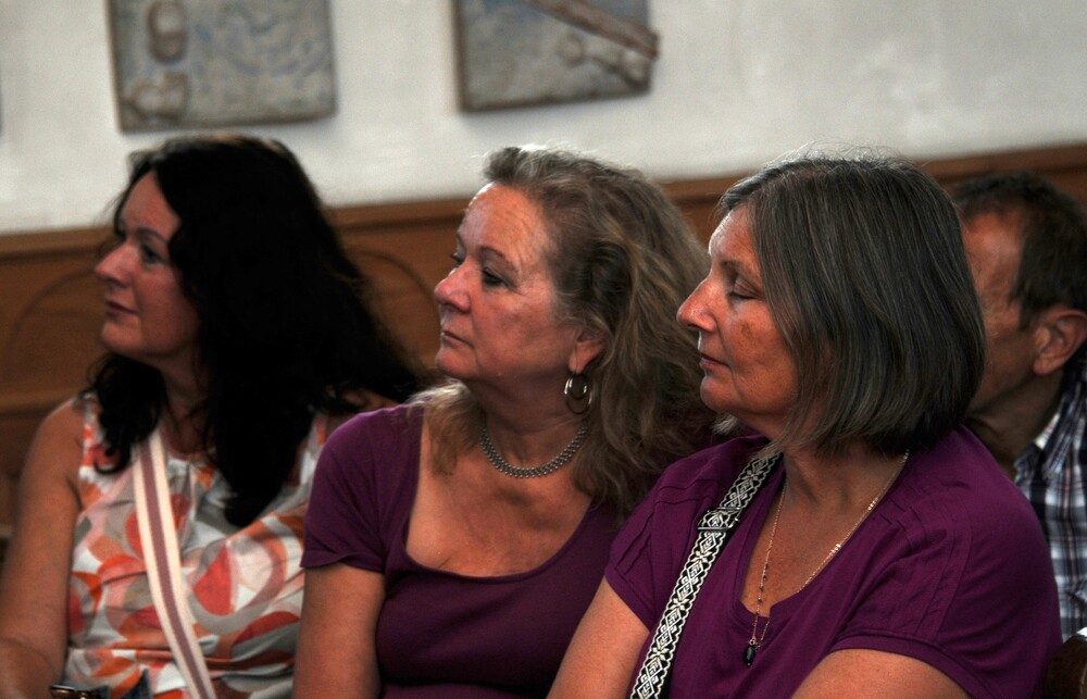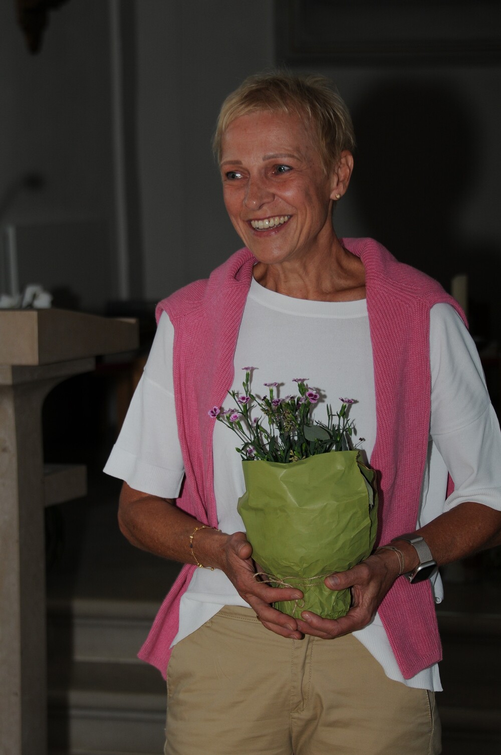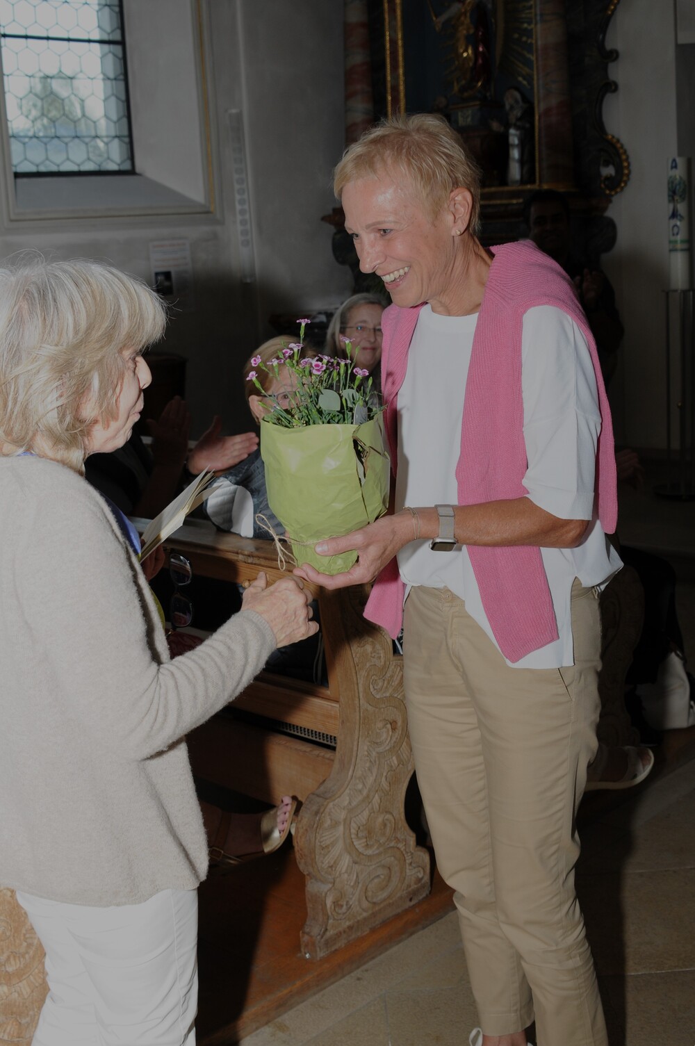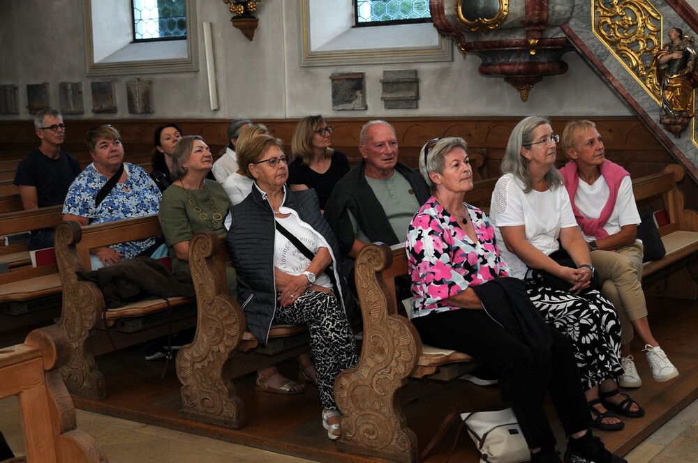 Eine besondere Resonanz hinterließ bei der Gruppe der Hochaltar mit seinem barocken Aufbau und der Darstellung der hl. Agatha in ihrer Verherrlichung. Aber auch die beiden im Aufbau ineinander gleichen Seitenaltäre, die Kanzel mit dem Stiegengeländer, die vielen barocken Darstellungen an den Seitenwänden und der Decke (u.a. das Martyrium der Schutzpatronin St. Anna), sowie der spezielle „Meininger Kreuzweg“- eine Zusammenarbeit der beiden Künstler A. Zauner und H. Gfader - hinterließen bleibende Eindrücke. Als kleine Aufmerksamkeit für die sachlich versierte und pointierte Führung überreichte Margot ihr ein Geschenk.