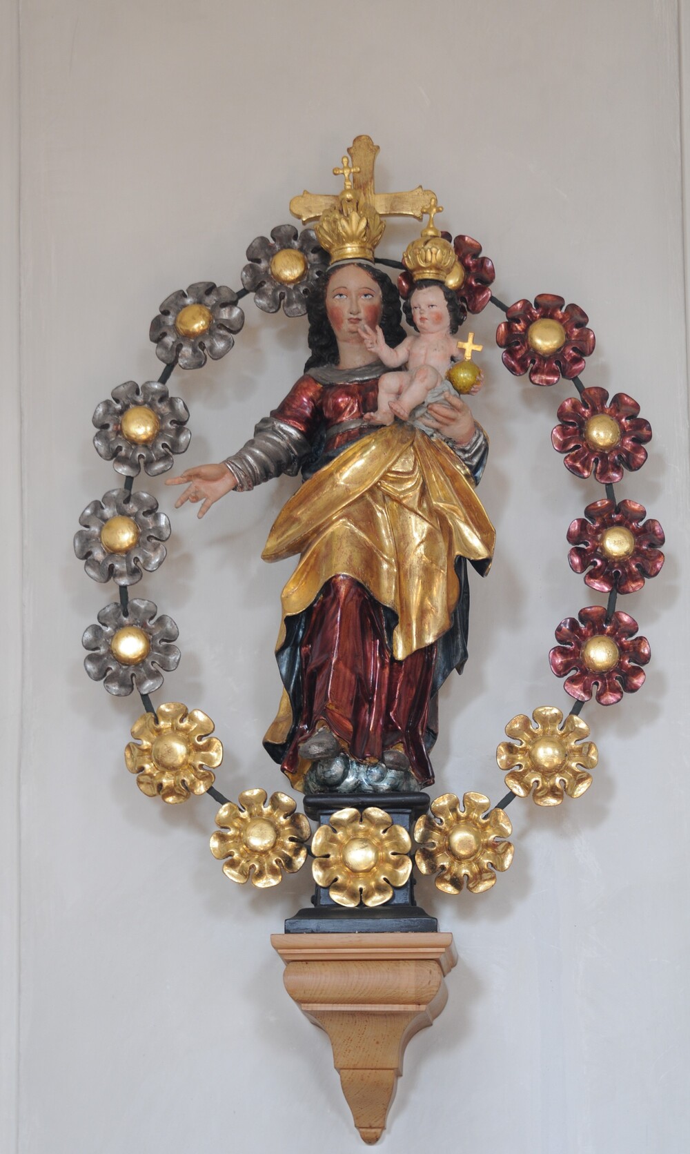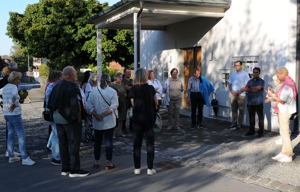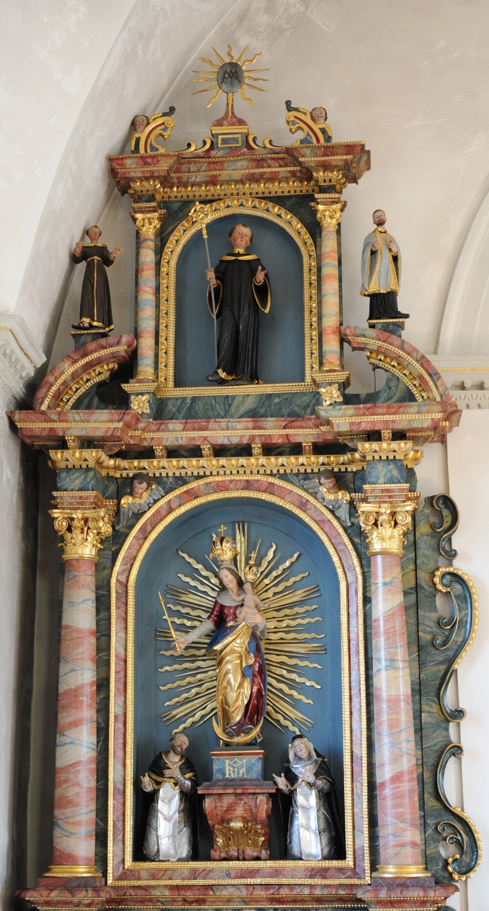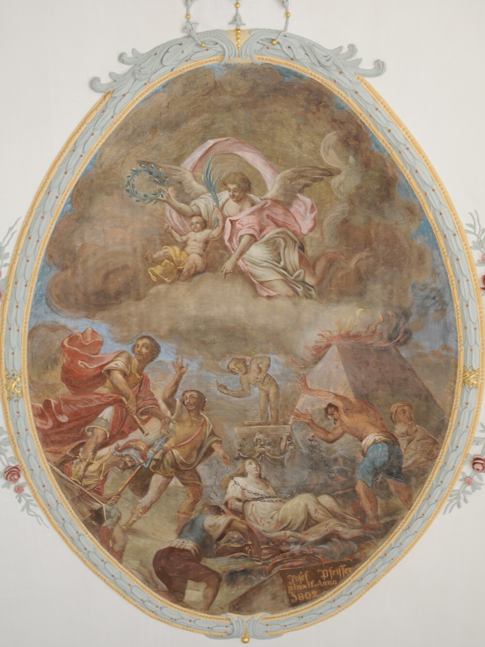 Eine besondere Resonanz hinterließ bei der Gruppe der Hochaltar mit seinem barocken Aufbau und der Darstellung der hl. Agatha in ihrer Verherrlichung. Aber auch die beiden im Aufbau ineinander gleichen Seitenaltäre, die Kanzel mit dem Stiegengeländer, die vielen barocken Darstellungen an den Seitenwänden und der Decke (u.a. das Martyrium der Schutzpatronin St. Anna), sowie der spezielle „Meininger Kreuzweg“- eine Zusammenarbeit der beiden Künstler A. Zauner und H. Gfader - hinterließen bleibende Eindrücke. Als kleine Aufmerksamkeit für die sachlich versierte und pointierte Führung überreichte Margot ihr ein Geschenk.