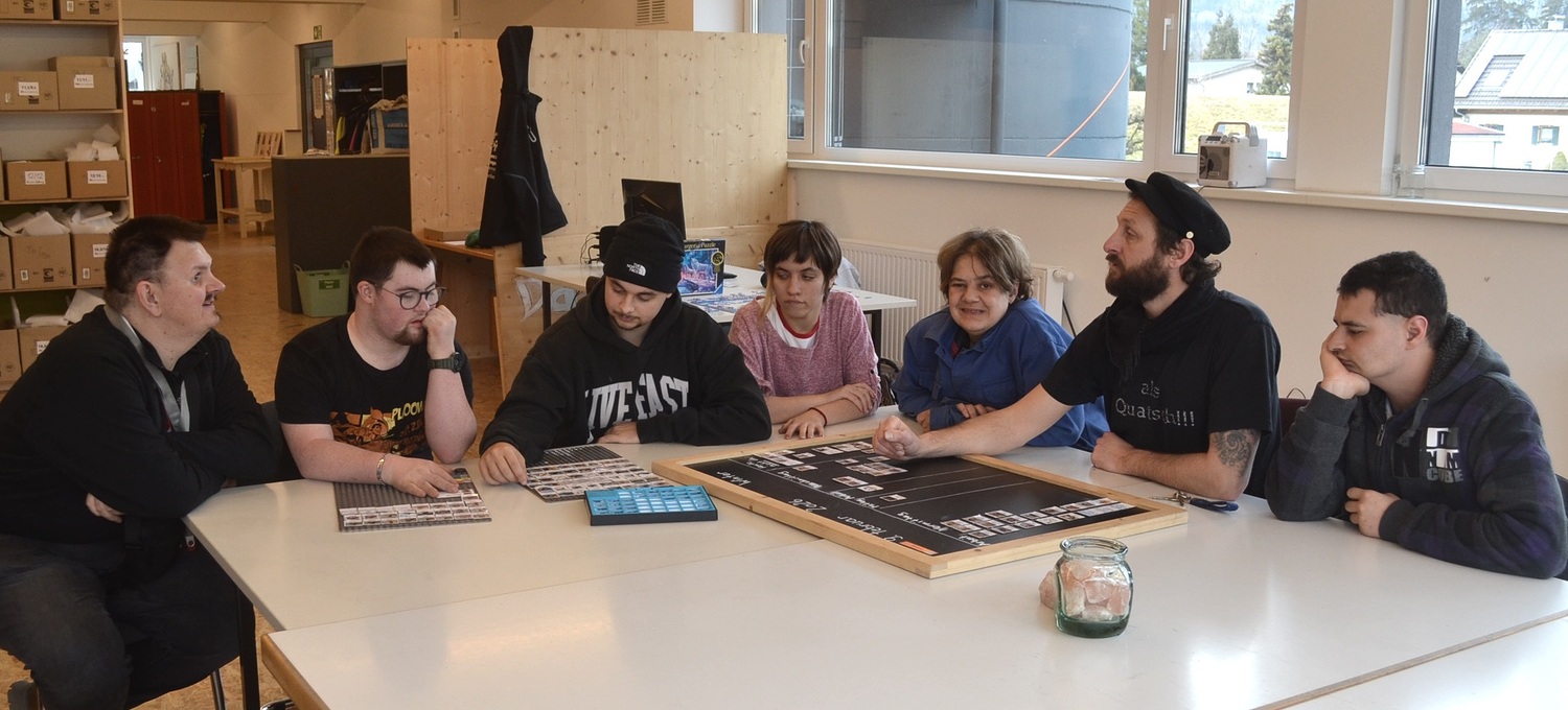 Kurz nach dem Mittagessen treffen sich die Mitarbeitenden des „gschickt & gschwind“ zu einer Arbeitsbesprechung. Es stehen vielfältige Arbeiten an, einige davon sind mit einem fixen Abgabetermin und deshalb besonders eilig. „Wir sehen uns als verlängerte Werkbank von Unternehmen, die gewisse Arbeiten an uns auslagern“, erzählt Stellenleiter Sabino Juriatti. Auch große Industriebetriebe, wie beispielsweise die Firma Liebherr, zählen dabei zu den Partner-Unternehmen – die Zusammenarbeit funktioniere dabei sehr routiniert und reibungslos. Es ist eine Win-Win-Situation für alle Beteiligten: „Die Unternehmen geben uns Aufträge, beispielsweise für Falt- und Biegearbeiten und haben in uns einen verlässlichen Partner. Menschen mit Beeinträchtigung erledigen diese Aufträge möglichst eigenständig. Für sie bieten wir eine gute Vorbereitung für einen späteren Job am ersten Arbeitsmarkt“, beschreibt Juriatti. Ziel sei es, Menschen mit Beeinträchtigung auf vielfältige Weise so zu unterstützen, dass sie schrittweise den Einstieg in den ersten Arbeitsmarkt gut meistern.