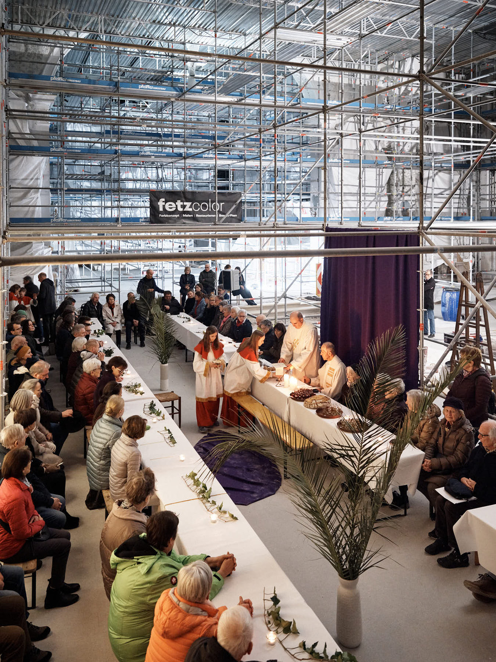 Also wurde am Gründonnerstag kurzerhand eine große Tafel zwischen den Gerüsten aufgebaut. Die Menschen kamen und es wurde Gottesdienst gefeiert. Eine wirklich gelungene Hinführung auf Ostern!