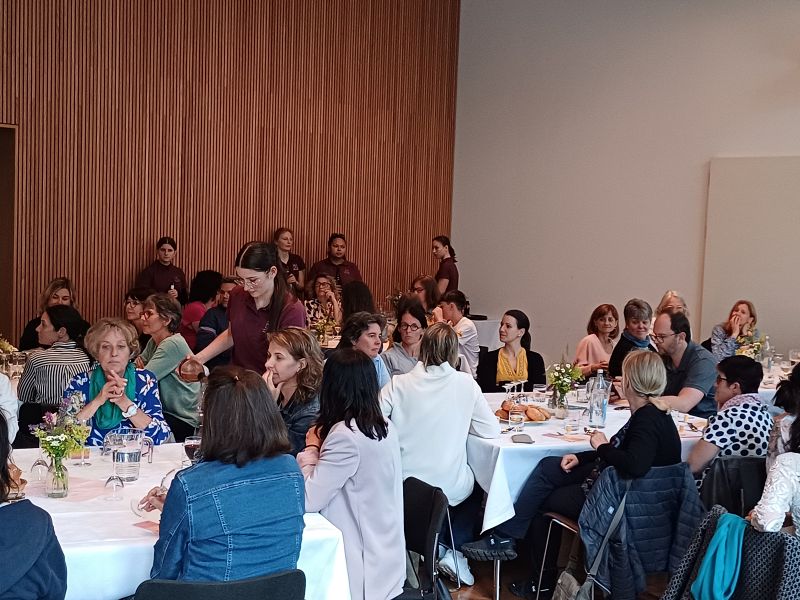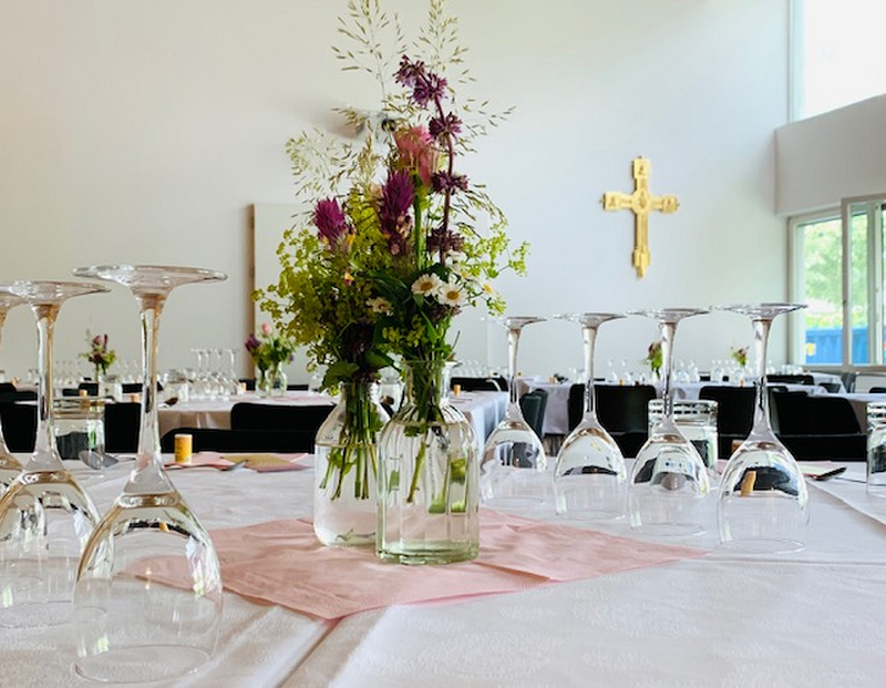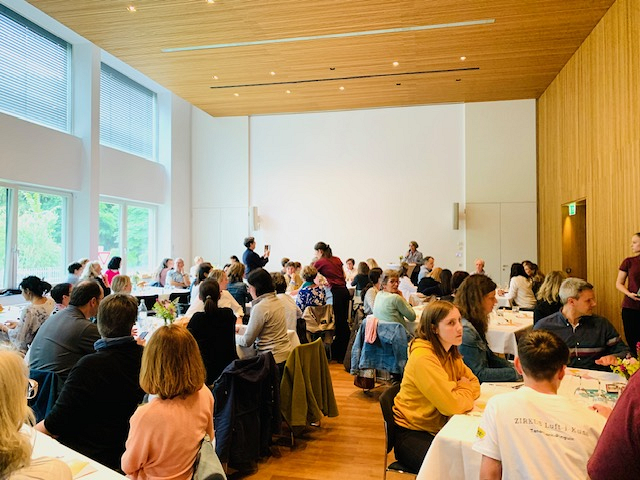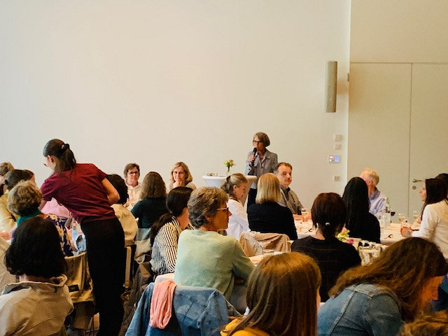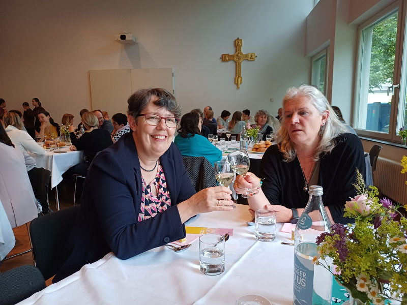 Beim anschließenden spirituellen Impuls begleiteten uns Religionslehrerin Christine Andres und ihre beiden Kinder musikalisch und interaktiv, so dass letztendlich alle begeistert ins gemeinsame Singen einstimmten. Im festlich gedeckten Saal des Diözesanhauses klang der Abend mit Essen, Trinken und guten Tischgesprächen aus.