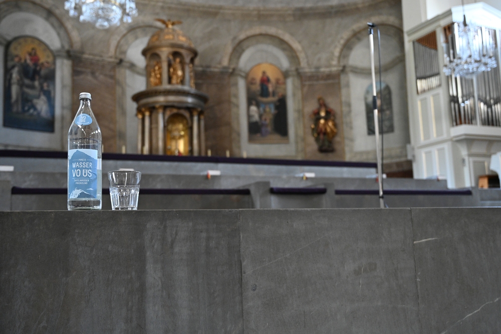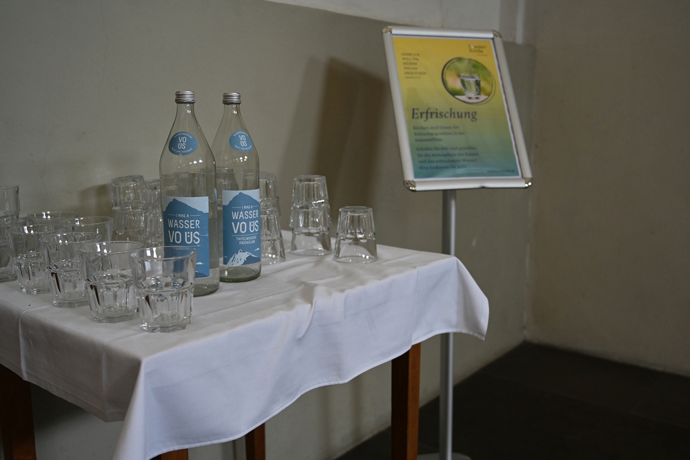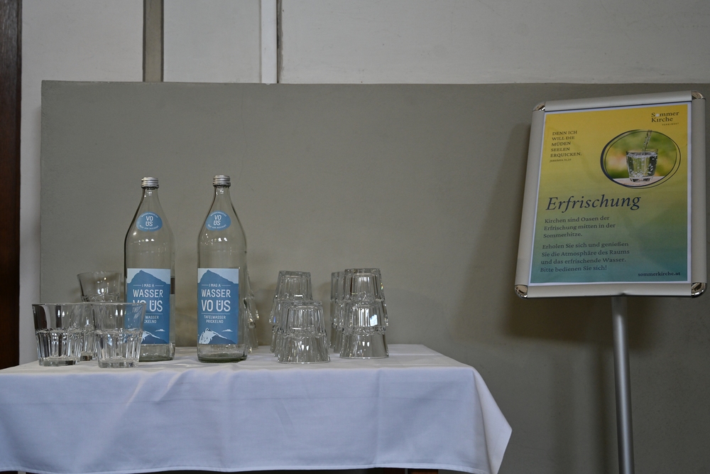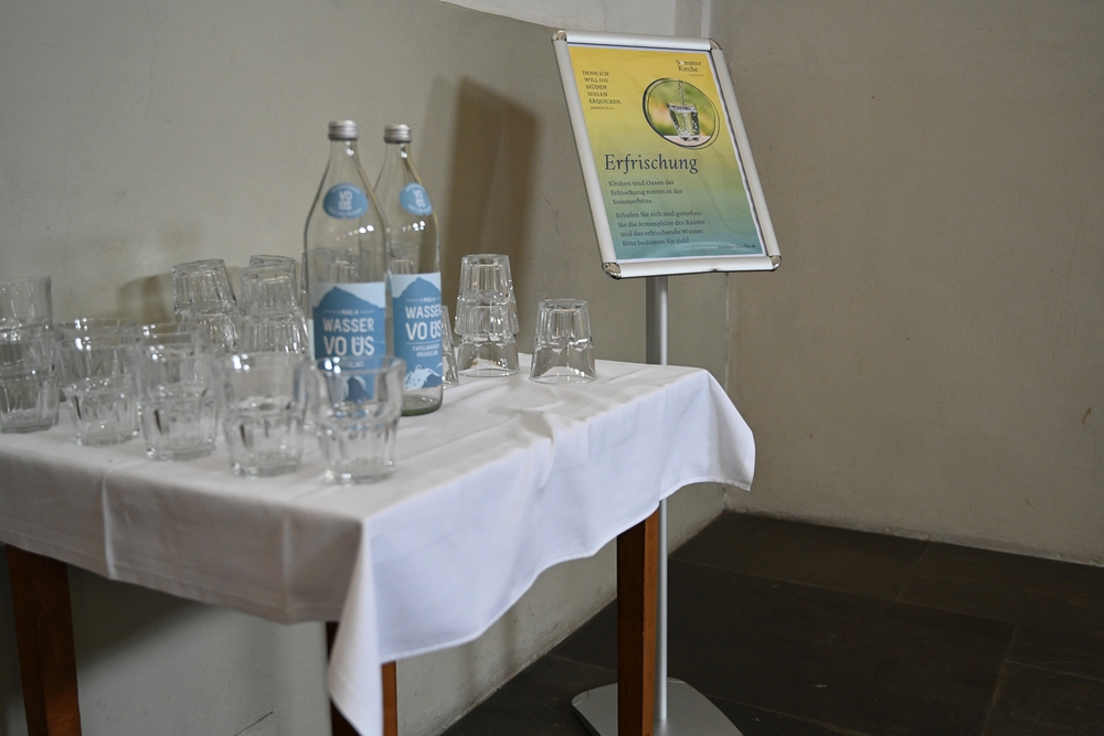 Doch dann die Rettung, die St. Martins Kirche mitten in der Stadt. Hinter der Eingangstür wartet eine andere Welt oder zumindest eine andere Jahreszeit auf die Besucher. Es ist kühl und ruhig. Der perfekte Rückzugsort für ein bisschen Besinnung oder einfach für eine kleine Auszeit von der Sommerhitze. Im Rahmen der Sommerkirche stellt die St. Martins Kirche auch ein kühles Glas Wasser für jeden Besucher bereit. Zu finden sind diese in der vorderen linken Ecke, wo prickelndes Tafelwasser von „VO ÜS“ gratis zur Verfügung steht.