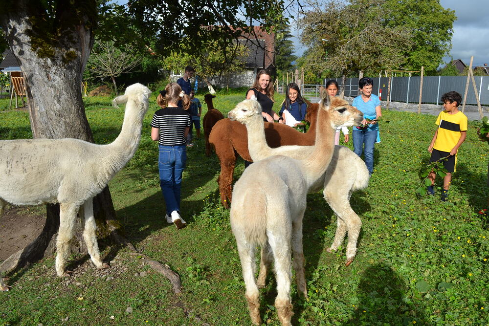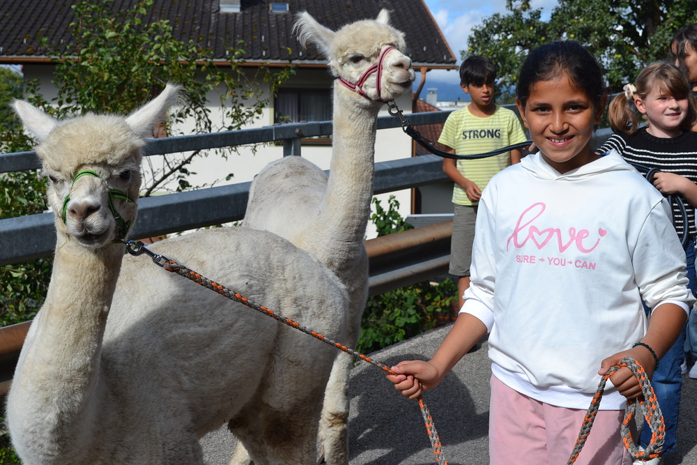 Ruhig zu sein ist gar nicht so einfach, aber genau das ist die erste Lektion, die Jasmine Matt von „Hoamat G´fühl Alpakas“ den Schüler:innen des Lerncafé Vorderland bei ihrem Besuch auf dem Hof lehrt. „Alpakas sind Herdentiere, aber auch Fluchttiere“, erzählt die Besitzerin von der Sanftmütigkeit und Intelligenz dieser Tiere, deren Charakter oft mit der Sanftmütigkeit von Delphinen verglichen wird. Verspüren die Tiere Stress, zieht sich die Herde zurück. „Es ist schon aufregend, wenn man die Alpakas füttern darf“, ist der neunjährige Gazi sehr stolz darauf, dass er die Aufgabe gut meistert und die Haselnusszweige den Tieren offenbar schmecken. „Spucken die Alpakas auch?“, möchte die zehnjährige Sham wissen. „Nicht auf Menschen“, beruhigt Jasmine Matt, dass sich die Tiere höchstens bei Rivalitäten untereinander bespucken.
