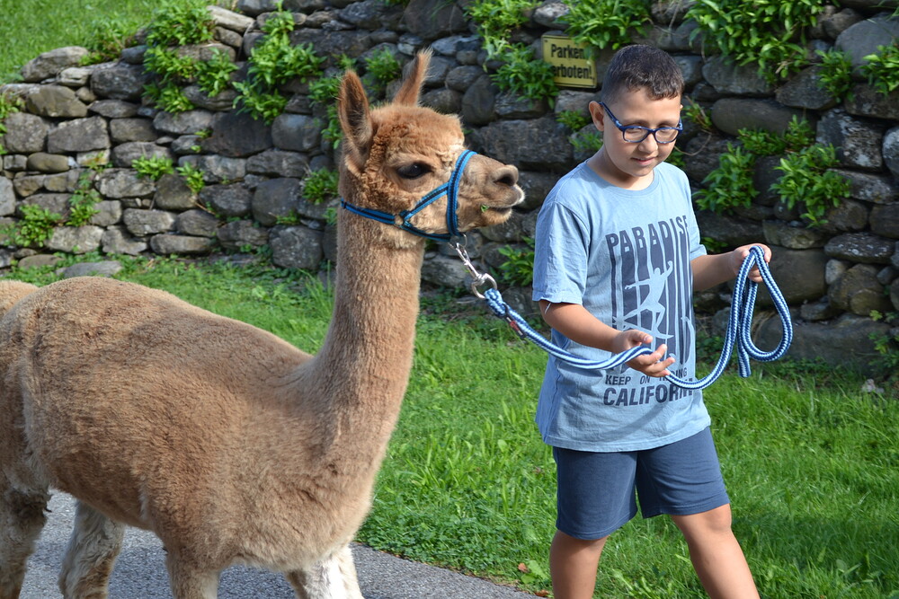 Schon vor dem Besuch auf dem Bauernhof haben die Kids von Lerncafé-Koordinatorin Carina Lang gelernt, achtsam mit den Tieren umzugehen: „Alpakas sind sehr ruhige und aufmerksame Tiere, was einen besonders achtsamen Umgang erfordert. Durch den Kontakt zu ihnen können die Kinder auf der emotionalen Ebene erfahren, was es bedeutet auf jemanden Rücksicht zu nehmen, sich auf Neues einzulassen, zu führen und empathisch auf andere Lebewesen einzugehen.“ Denn nach dem ersten Kennenlernen stand ein gemeinsamer Spaziergang auf dem Plan. Jedes Kind hatte dabei die Möglichkeit, selbst ein Alpaka an der Leine zu führen. Besonders schön zu beobachten dabei, wie auf den ersten Blick schüchterne Schüler:innen über sich hinauswachsen und schlussendlich „ihr“ Tier führten. Lehrreich war aber auch das Wissen, das ihnen Jasmine Matt über Herkunft, Haltung und Charakter der Tiere vermittelte. Ein Besuch im Hofladen zeigte den Kids schließlich auf, wie vielfältig die Wolle der Tiere eingesetzt und verarbeitet werden kann. „Das Erlebnis brachte den Kindern ein Stück Natur näher und war ein pädagogisch besonders wertvolles Erlebnis“, hofft Caritas-Mitarbeiterin Carina Lang, dieses Angebot auch künftig den Lerncafé-Kids anbieten zu können.