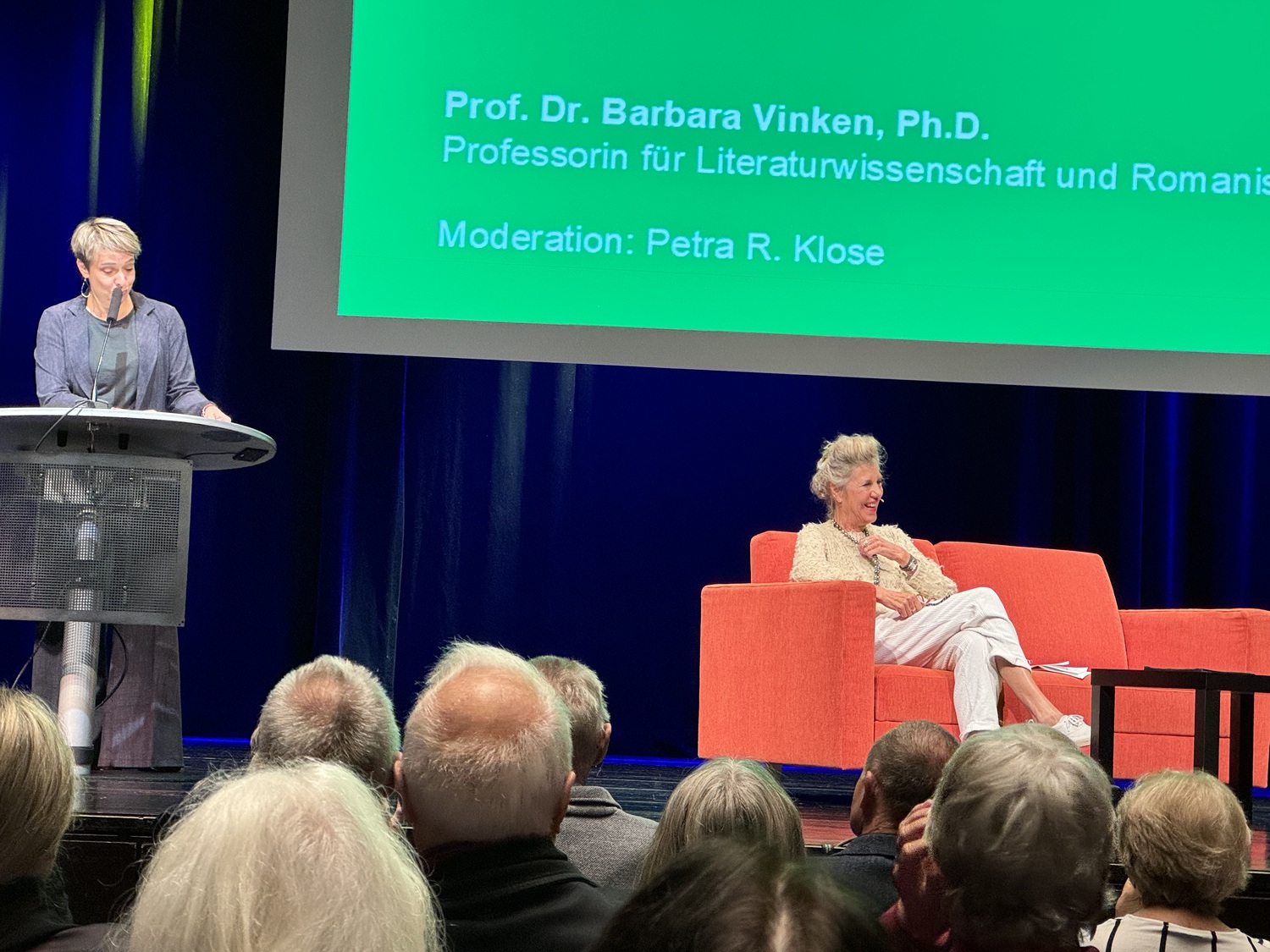 Barbara Vinken, die an diesem warmen Herbstmontag selbst in ein elegantes cremefarbenes Outfit gekleidet ist, einzig durch eine Brille in orangerot akzentuiert, nimmt den Begriff Eleganz mit Wortgewandtheit und etlichen historischen Belegen unter die Lupe und erklärt dem Publikum: „Eleganz ist sehr viel mehr als eine Frage des Gekleidetseins", weiß Barbara Vinken, die sich als Modetheoretikerin intensiv mit der Welt der Mode aus verschiedenen Perspektiven beschäftigt.