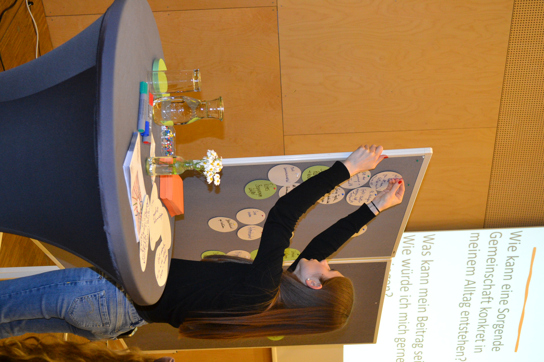 Die Teilnehmer*innen des Abends setzten sich intensiv mit dem Thema auseinander und tauschten sich in Kleingruppen über Fragen wie „Wie kann eine sorgende Gemeinschaft in meinem Alltag entstehen?“ und „Wie möchte ich mich einbringen?“ aus. Die gesammelten Erkenntnisse wurden sichtbar gemacht und bilden zusammen mit den Umfrageergebnissen die Grundlage für die nächsten Projektschritte.
