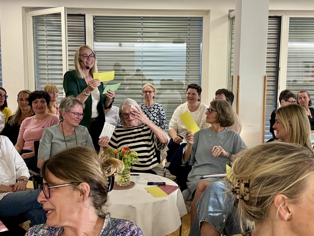 Die Kommunikationstrainerin zeigte zudem auf, wie sehr Frauen unter der Doppelbelastung von Beruf und Care-Arbeit leiden, aber auch, wie viel Gestaltungskraft in weiblicher Führung steckt: „Macht ist nicht Kontrolle – Macht ist Beziehung, Verantwortung und Gemeinschaft.“ Und sie fügte mit einem Augenzwinkern hinzu: „Was heute von Führungskräften verlangt wird, können Frauen längst – wir nennen es halt Alltag.“
