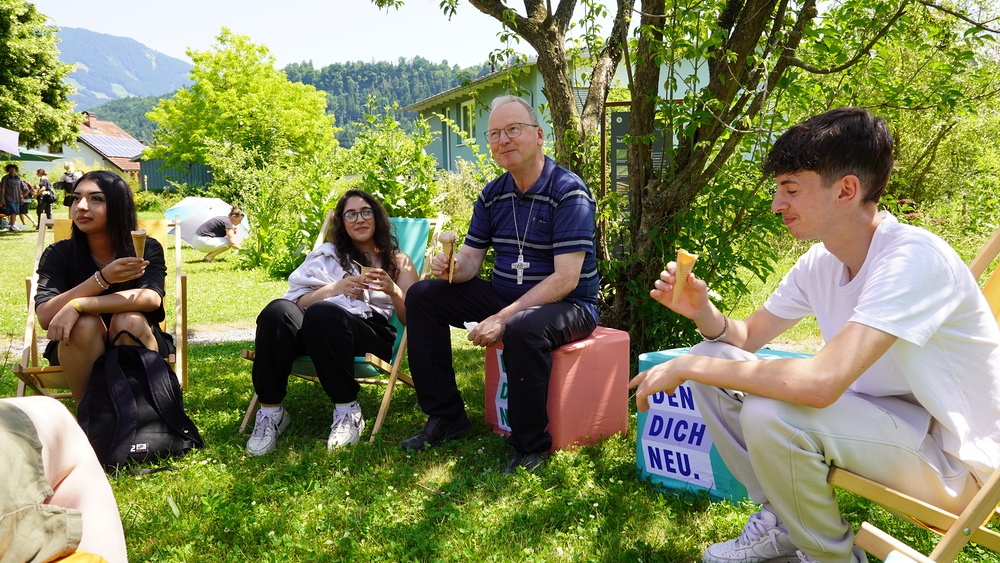 In Göfis angekommen, wartete schon der festliche Abschlussgottesdienst – ein feierlicher Moment mit Bischof Benno, der die Jugendlichen selbst auf der Wallfahrt begleitet hatte und abschließend alle Gedanken und Eindrücke des Tages noch einmal in der Pfarrkirche zusammenführte. Danach wurde im schattigen Garten unter Bäumen gegessen, gelacht und – ganz wichtig – Halleluja-Eis geschleckt. Die Lehrlinge bekamen von Bischof Benno persönlich Europas Eissorte des Jahres, eine Mischung aus Schokolade und gerösteten Haselnüssen, serviert. Dank „Lenas Eis“ konnte die leckere Eissorte direkt vor Ort verkostet werden – ein kleiner Himmel auf Erden sozusagen.
