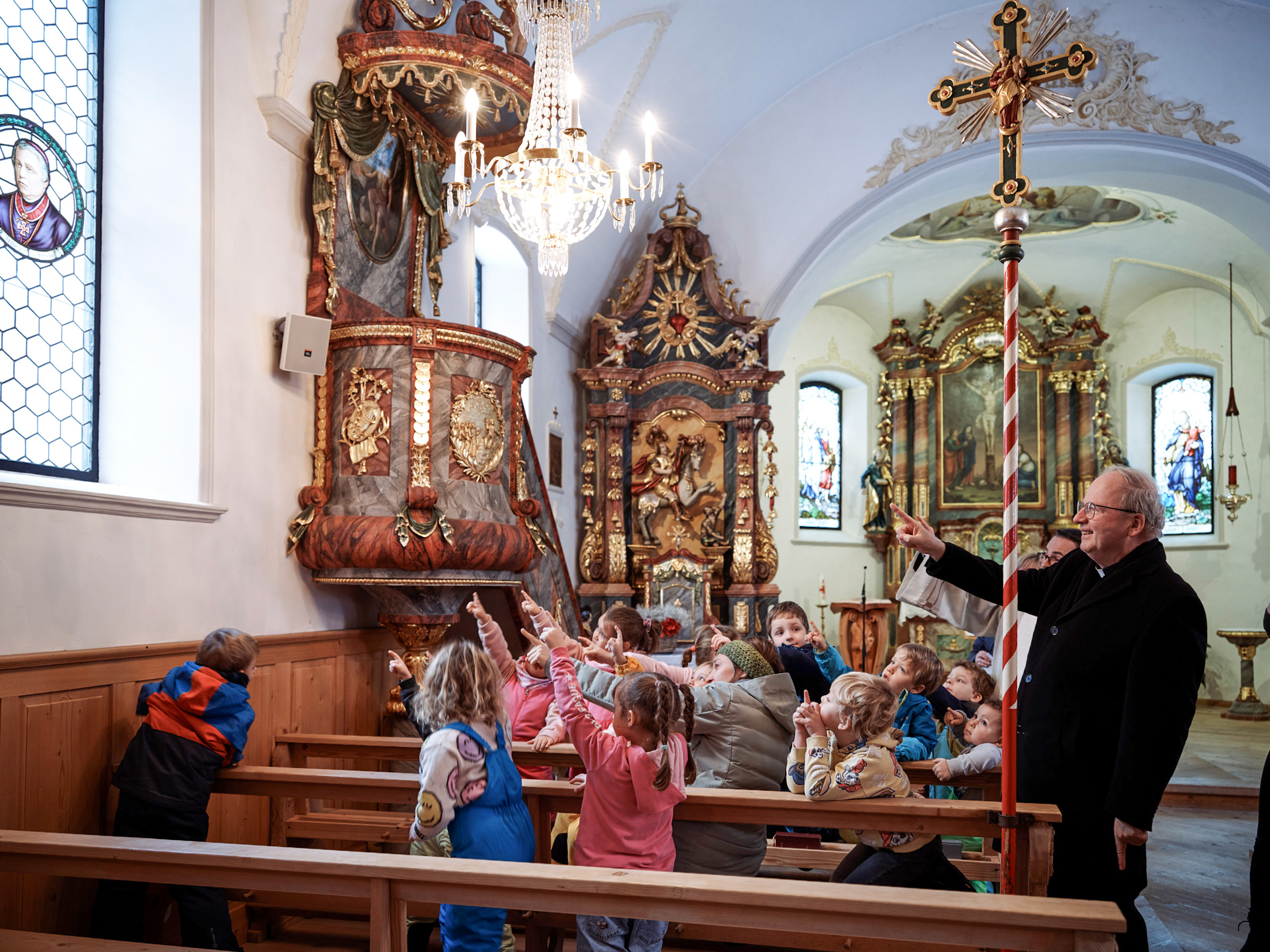 9:00 Uhr – Morgengebet in Partenen: Zum Auftakt seiner Pastoralvisitation im Innermontafon wurde Bischof Benno von den Kindergartenkindern herzlich willkommen geheißen.