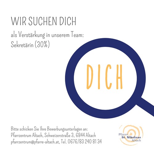 Verstärkung für das Pfarrsekretariat gesucht Wir suchen Verstärkung in unserem Team: Pfarrsekretär/in für die Pfarre Altach (30%) Mehr lesen