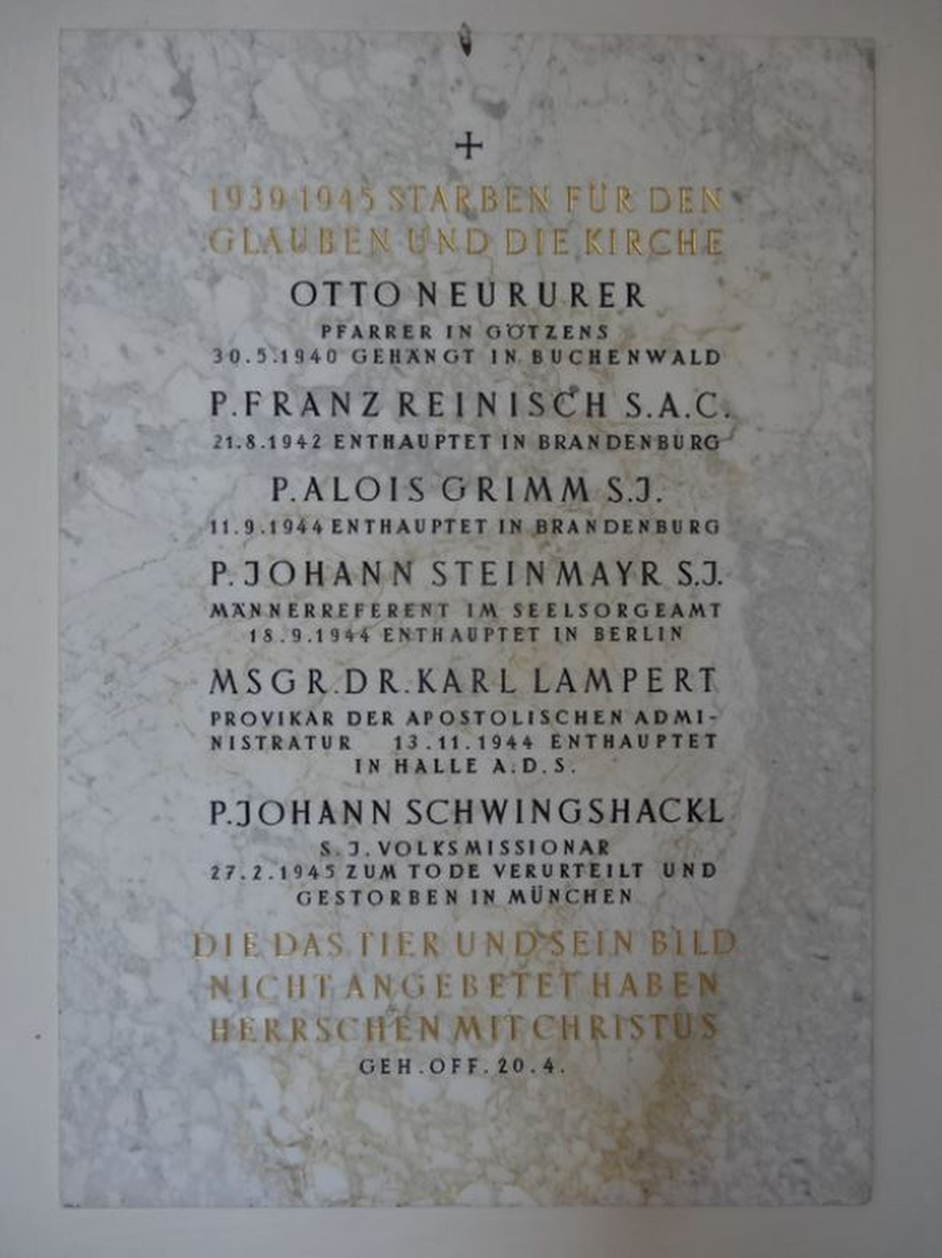 Am 22. August 1953 wurde diese Gedenktafel an die sechs Märtyrerpriester der Apostolischen Administratur Innsbruck-Feldkirch von Abt Eugen Fiderer enthüllt. Heute ist die Tafel in der Stiftskirche Stams angebracht. „Die von der Gestaltung her schlichte Tafel erhält durch die Wahl des Ortes ihrer Anbringung ... einen Kontext, der dem Gedenken an die sechs Märtyrer einen Platz in der Tiroler Landesgeschichte gibt, in welcher das Stift eine bedeutende Rolle innehatte." (Markus Illmer)