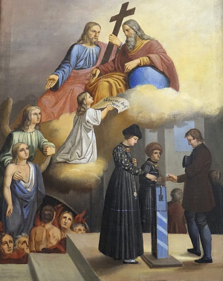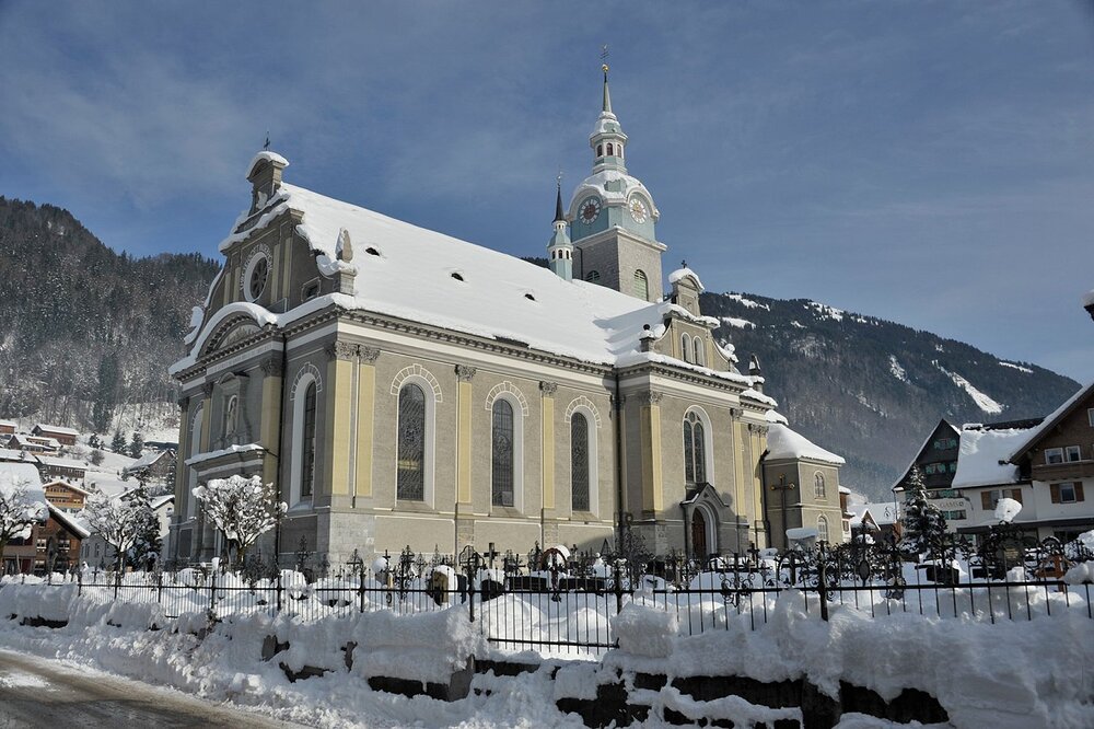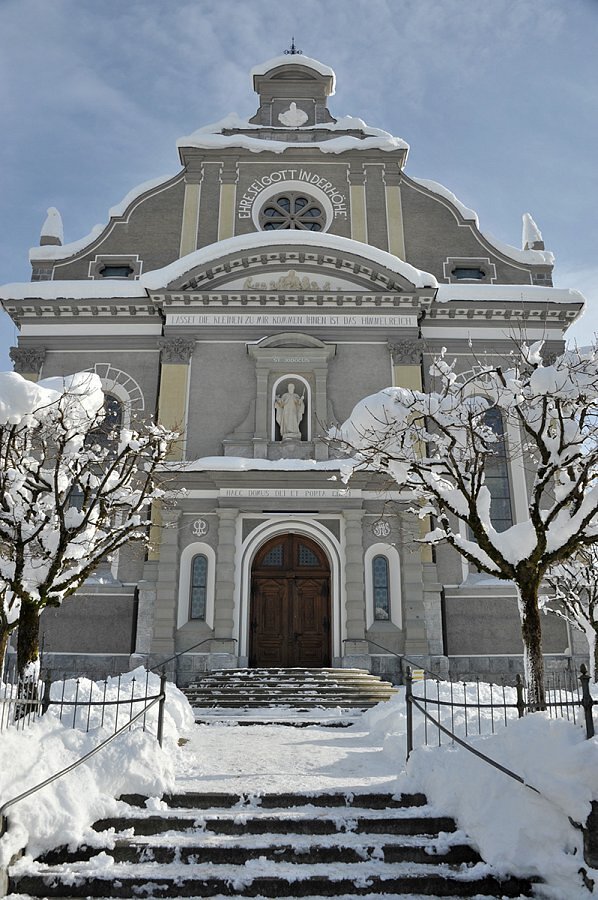 1494 gotische Kirche geweiht, 1771 vergrößert. 1908-1909 nach Plänen von Architekt Albert Rimli neu errichtet.