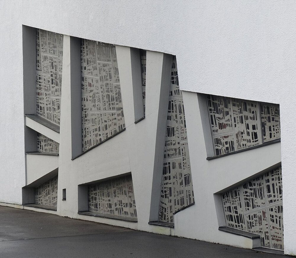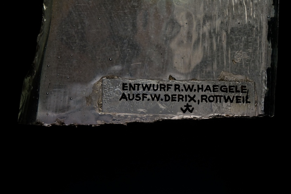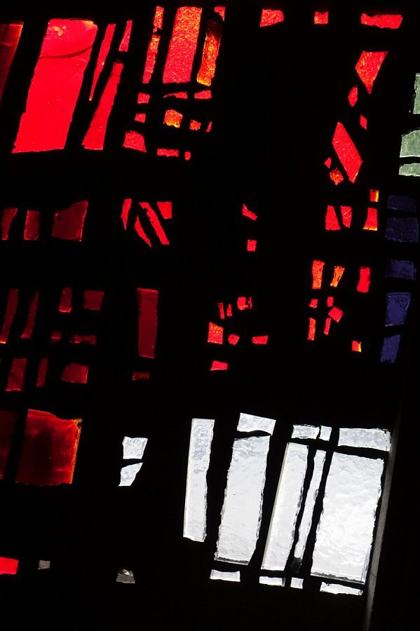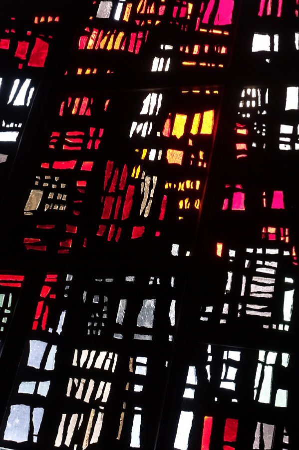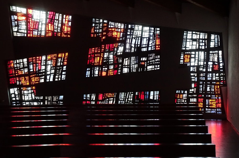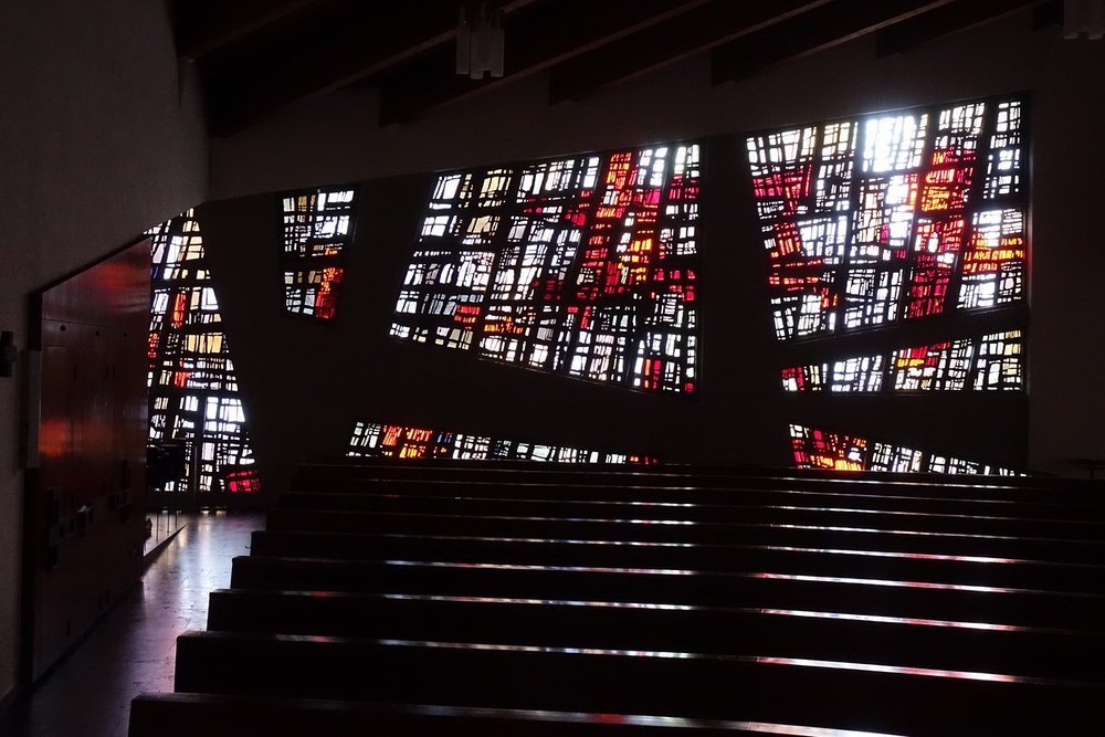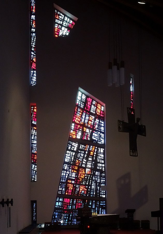 Seitenwände, Altarwand und Emporenwand Betonglasfenster, Entwurf Walter Haegele, Ausführung Wilhelm Derix, Rottweil