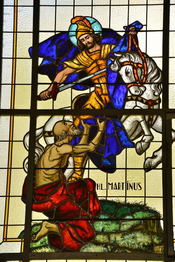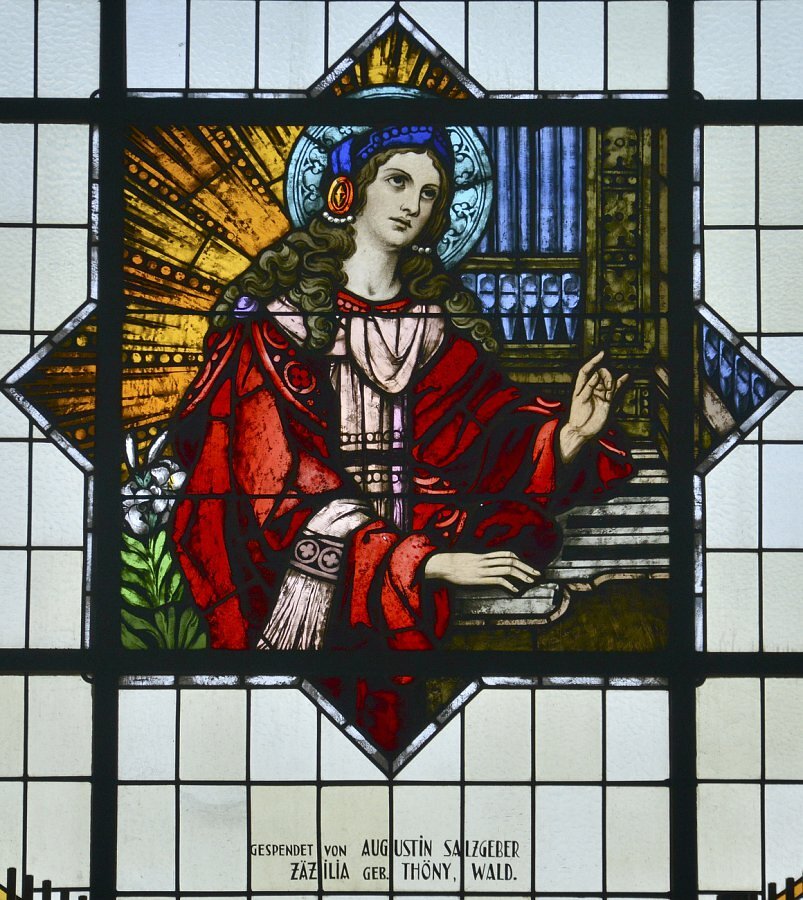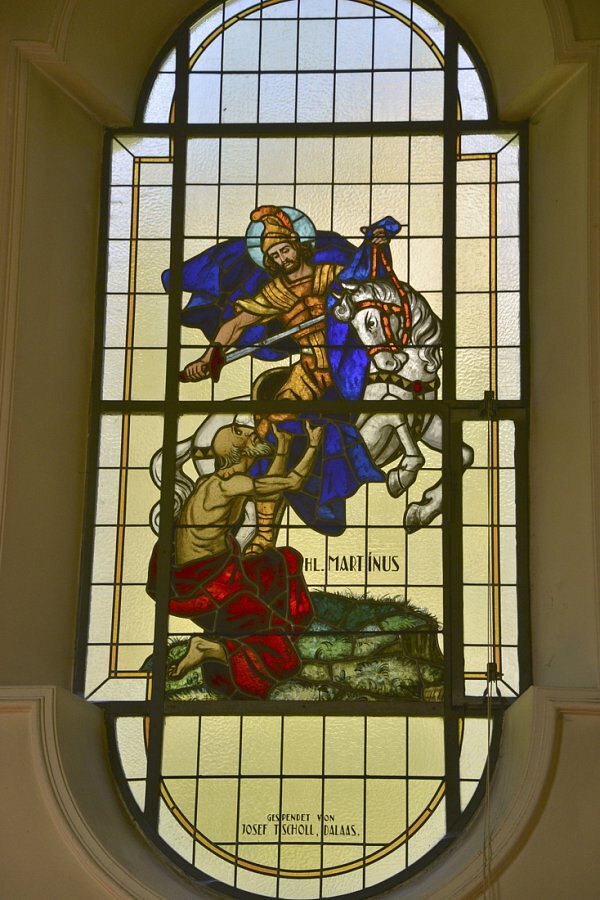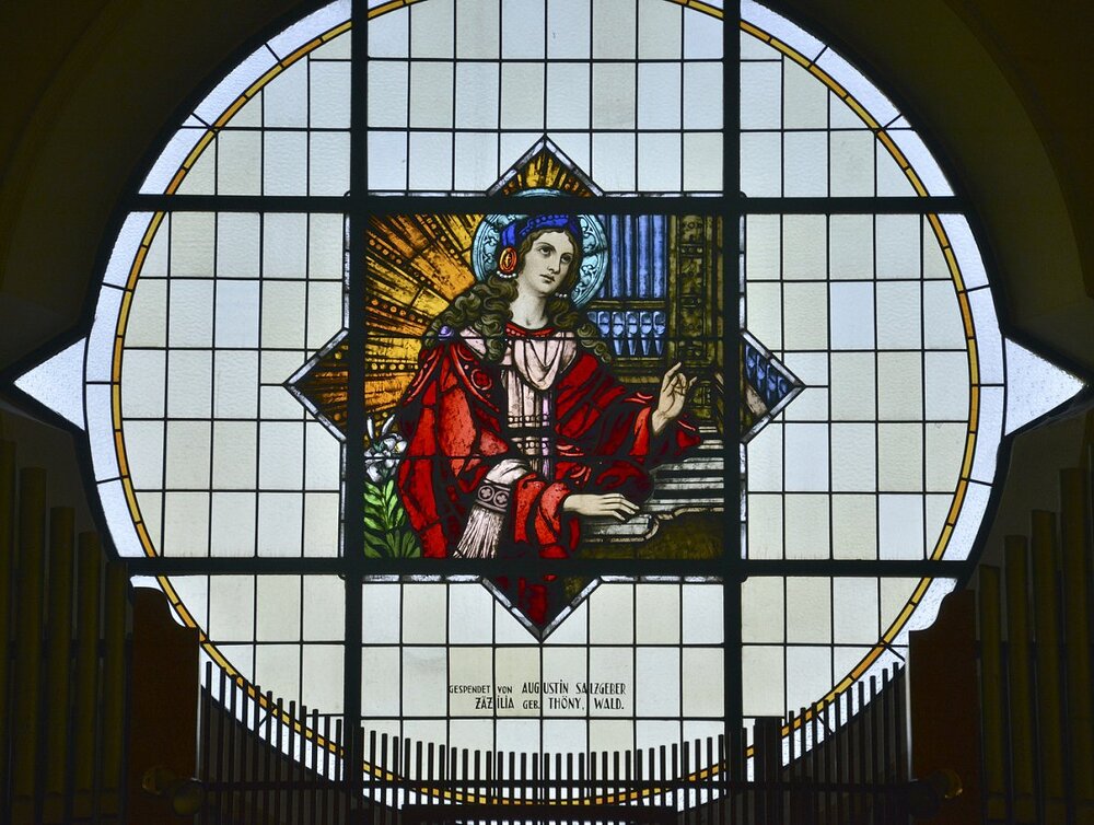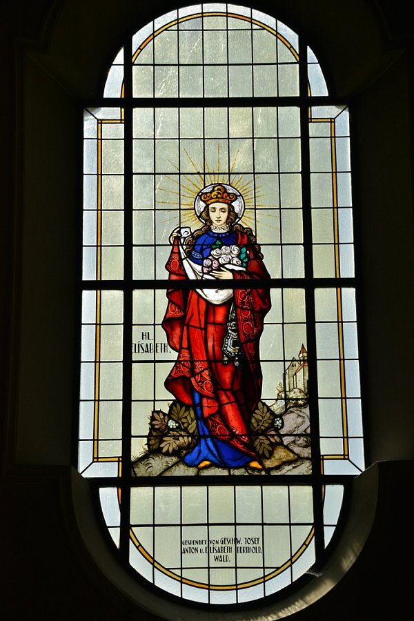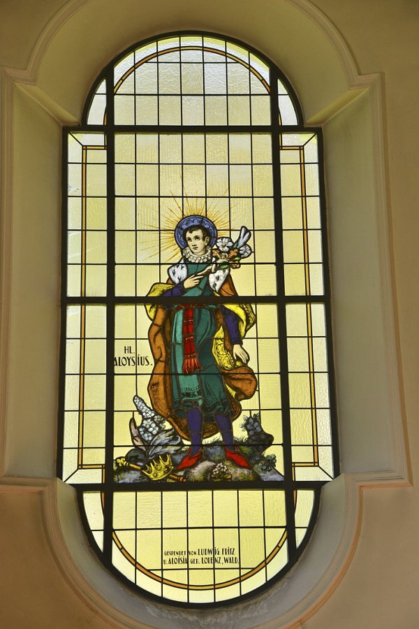 im Chor links hl. Elisabeth, Mitte Gottvater, rechts hl. Aloysius und Martin, Im Langhaus Dekorfenster, an der Ost-Fassade hl. Cäcilia