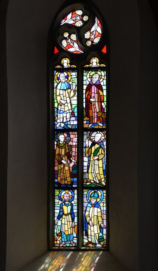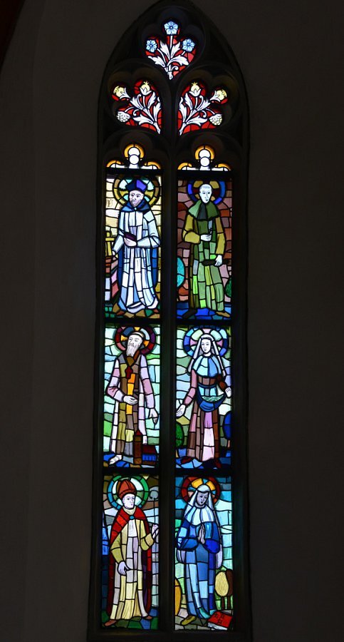 Im Chor vier Spitzbogenfenster mit Maßwerk, Glasgemälde von Hubert Dietrich, 1961, Tiroler Glasmalereianstalt, Innsbruck