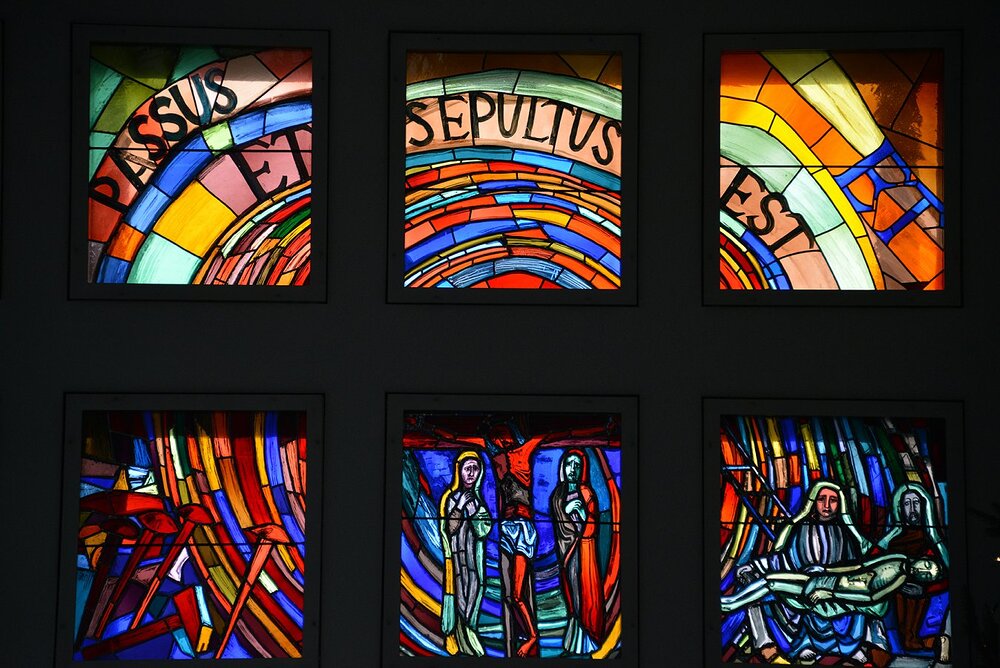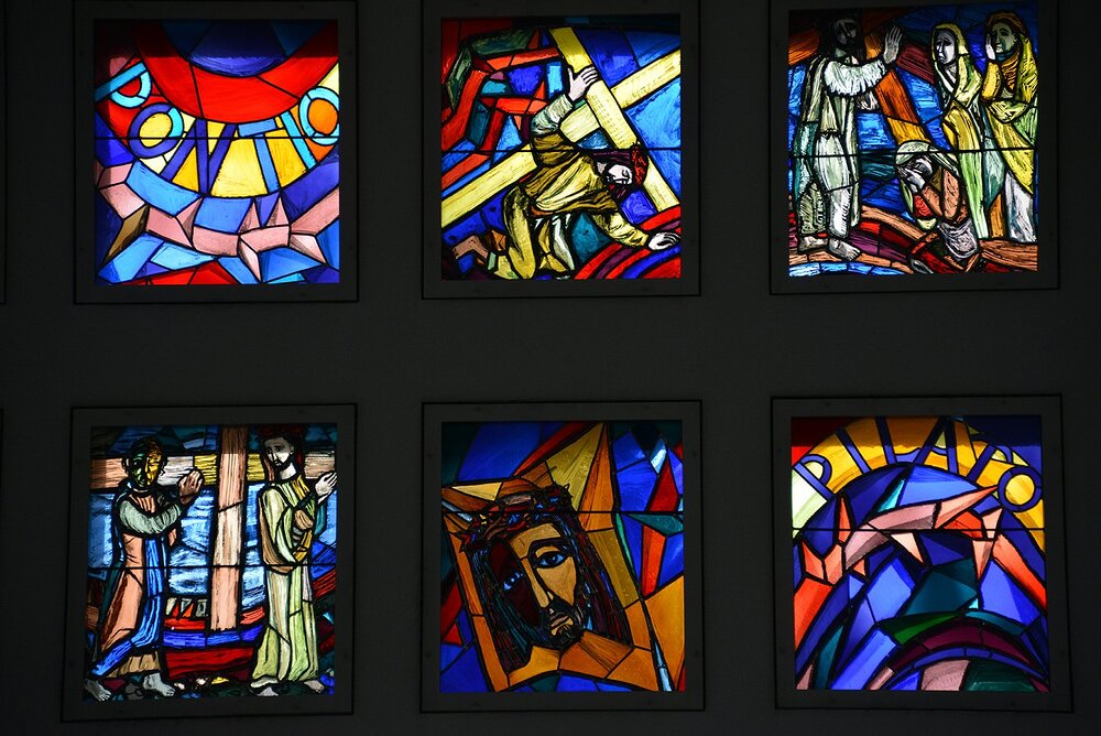 An der li. Langhauswand: Kreuzweg in 22 Glasfenstern in Doppelreihe.