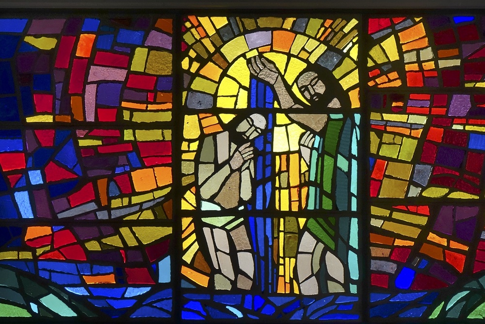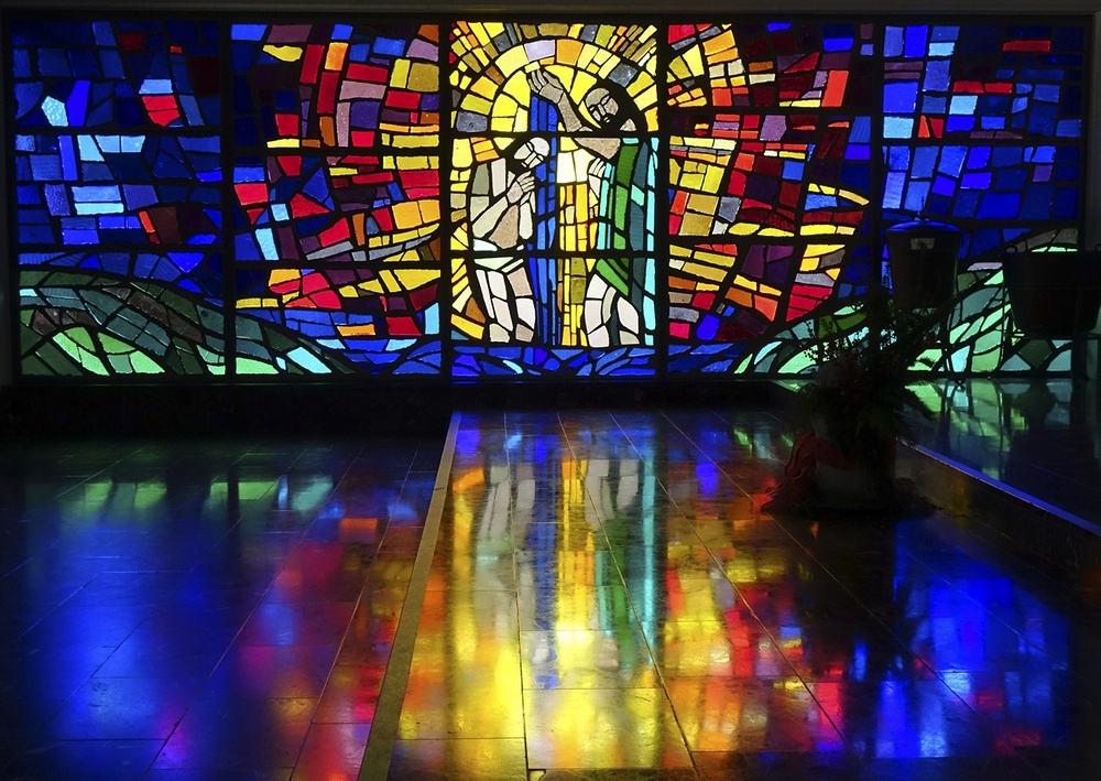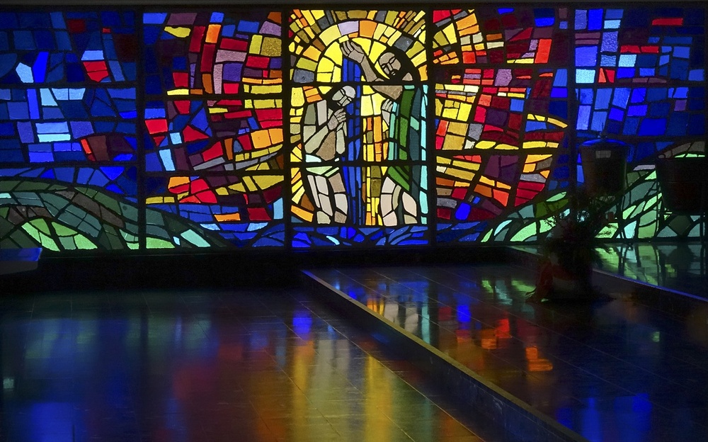 Glasgemälde "Taufe Christi" in der Taufkapelle, Entwurf Martin von Häusle, Ausführung von Margarete Ruiter-Häusle