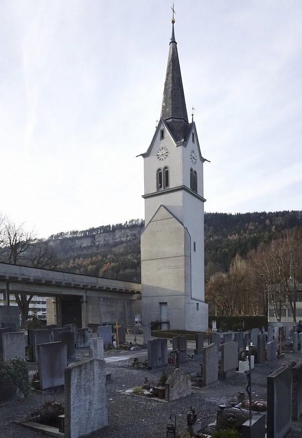 1970-72 Plan von Guntram Mätzler, 1976 Abbruch der alten Kirche, 1977 geweiht