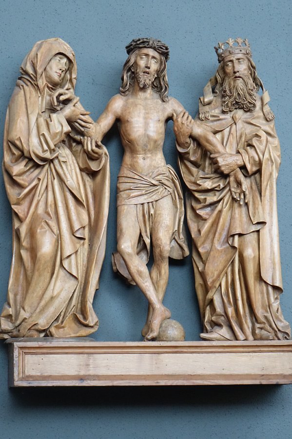 Aufbahrungshalle: Glasgemälde Maria mit Kind, Lamm Gottes und Pelikan aus der alten Pfarrkirche, 1879