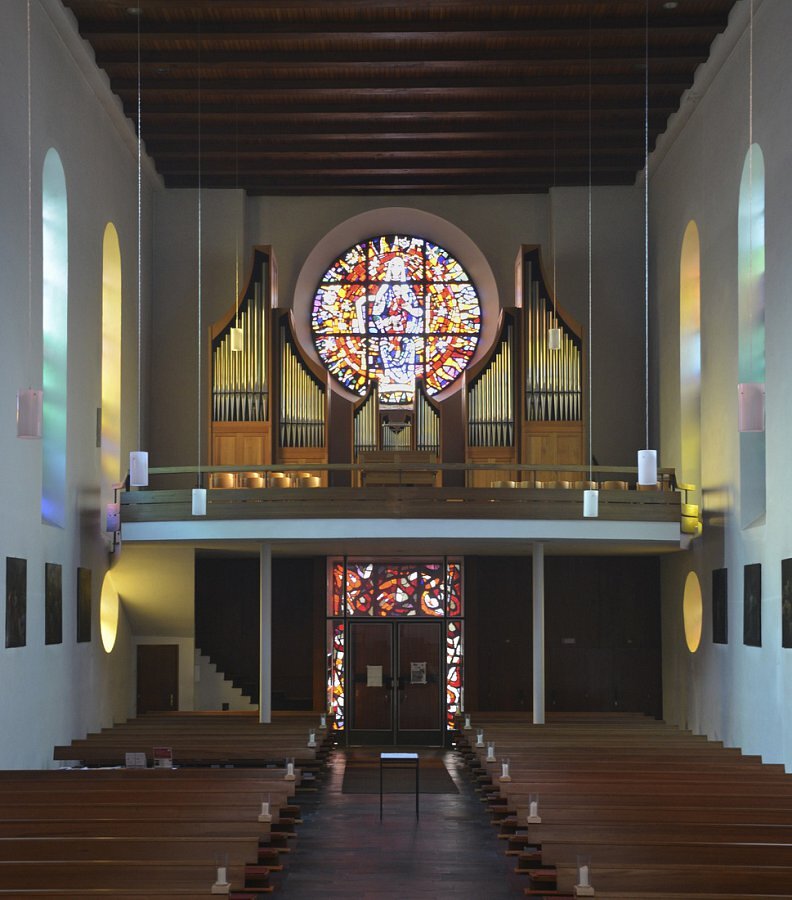 im Langhaus Fenster von Erich Huber, 1963/64: Erschaffung des Kosmos, Anbetung der Könige, Opfer Abrahams, Samariterin am Jakobsbrunnen, Arche Noahs, Erweckung des Lazarus, Symbol der Taufe und Eucharistie