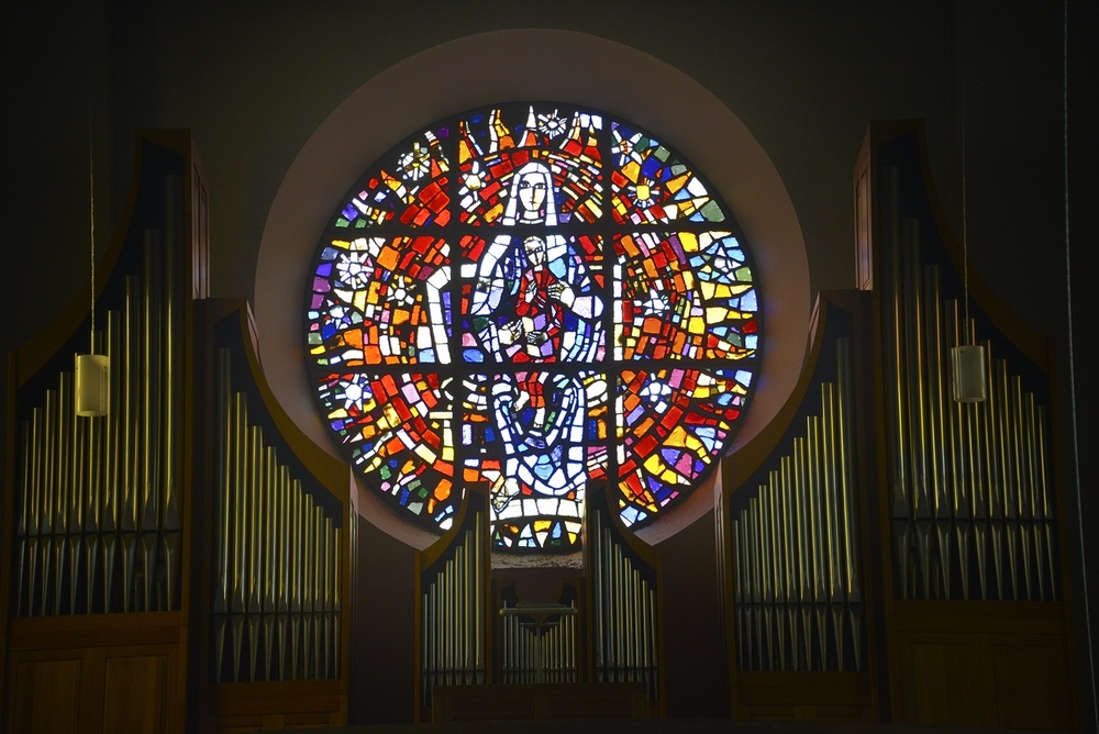 Glasgemälde von Martin Häusle, 1964: Rosette: Thronende Maria mit Kind; Toreinrahmung: Brennender Dornenbusch;