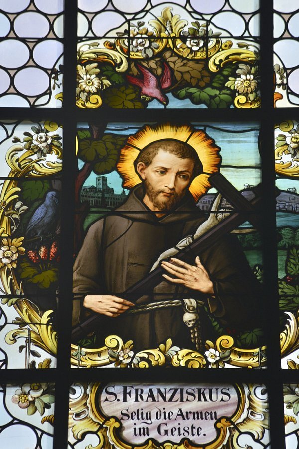 Apsis: links Gesetzestafeln und Schweißtuch der hl. Veronika, Mitte hl. Franziskus und Herz Jesu, rechts Paradiesschlange und Johanneshaupt.