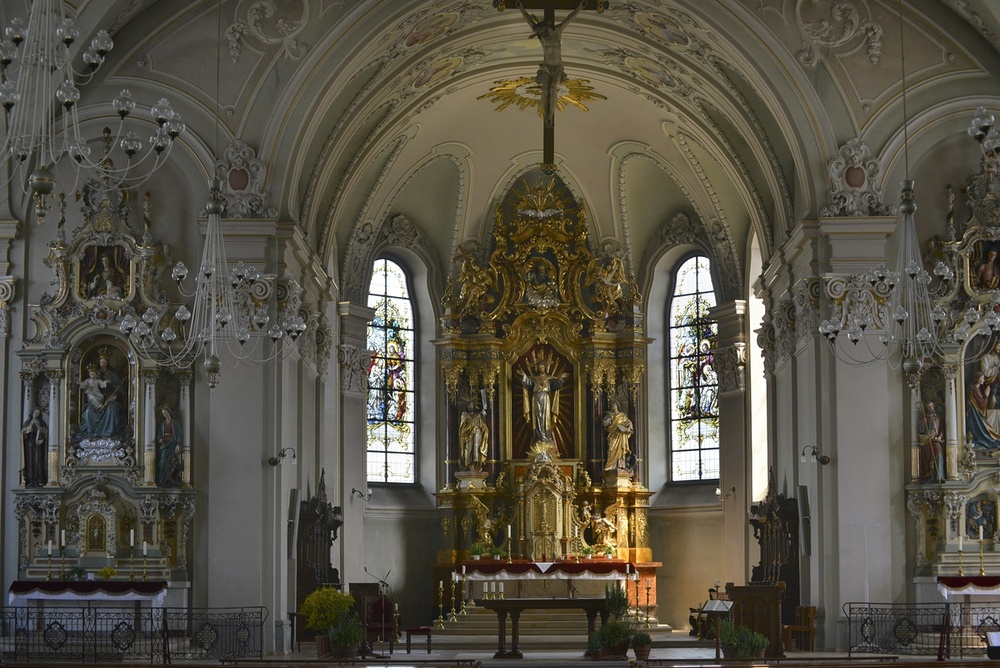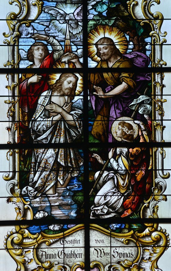 Im Chor li. Hl. Geist, Taufe Christi, rechts Hl. Familie mit hl. Johannes, Lamm Gottes