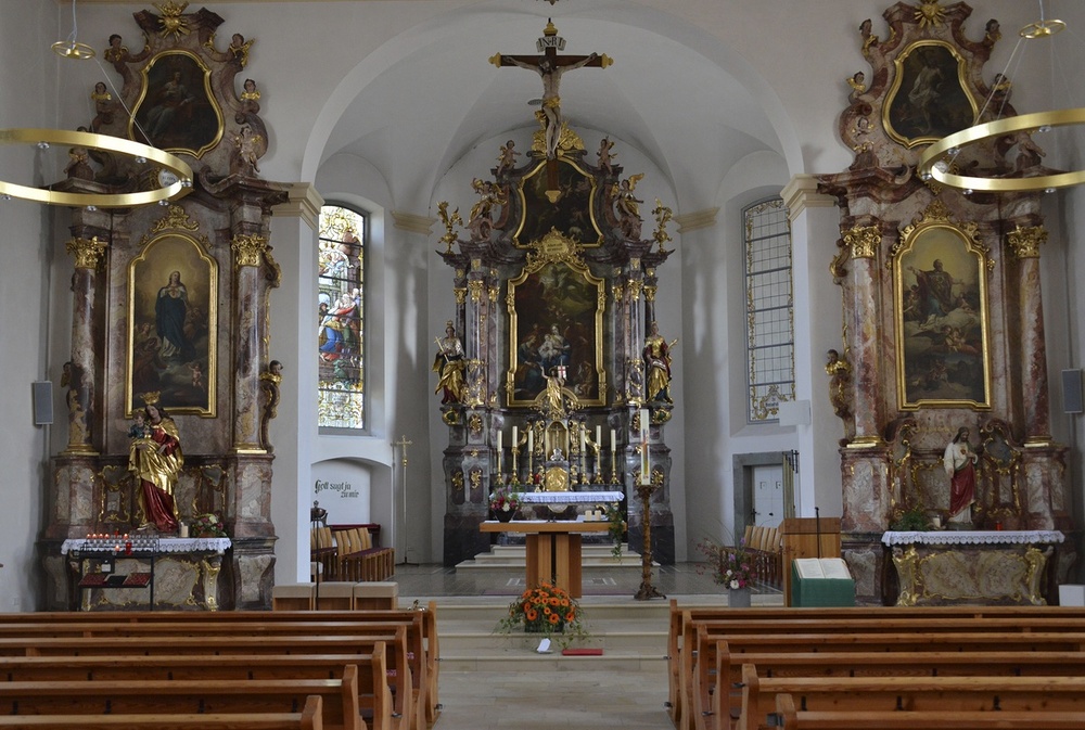 Langhaus li. Dekor, hll. Matthäus und Bartholomäus, Paulus und Petrus, Krönung Mariens und Pietà, re. hll. Antonius und Franziskus, Andreas und Jakobus d. Ä., Jakobus d. J. und Philippus, Simon Thaddäus