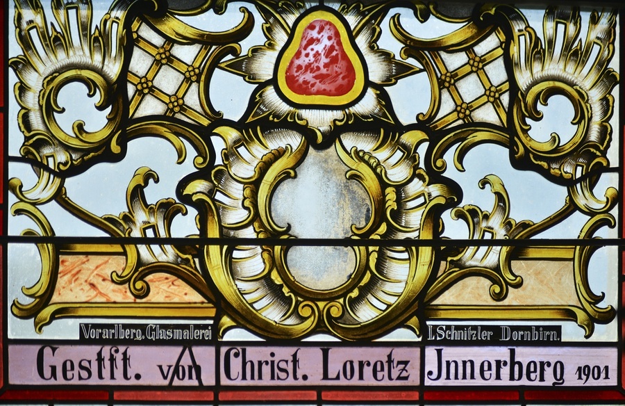 Vorarlb. Glasmalerei L.Schnitzler Dornbirn 1901 Signatur auf Herz Jesu Glasfenster