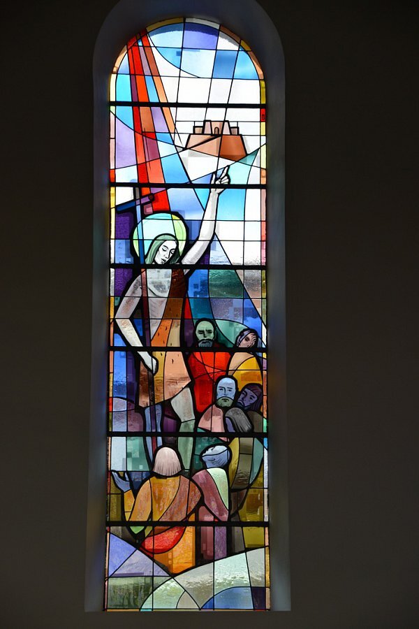 Glasfenster 1963 Entwurf Konrad Honold, Ausführung Tiroler Glasmalereianstalt, Innsbruck - Geschichte und Leben Johannes des Täufers, Patron der Kirche