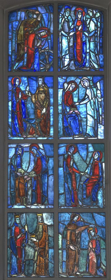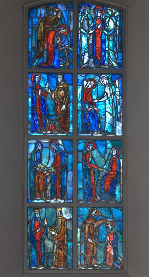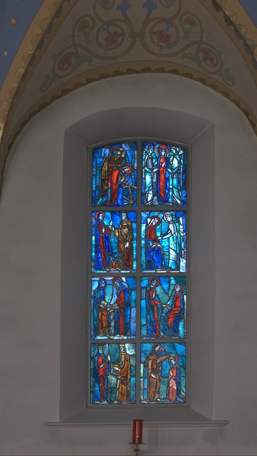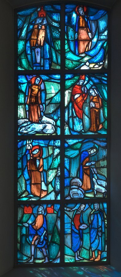 Glasgemälde im Chor, Entwurf Mila Bjelik-Stöhr, 1948, hl. Katharina, hl. Wendelin, hl. Nikolaus von der Flüe