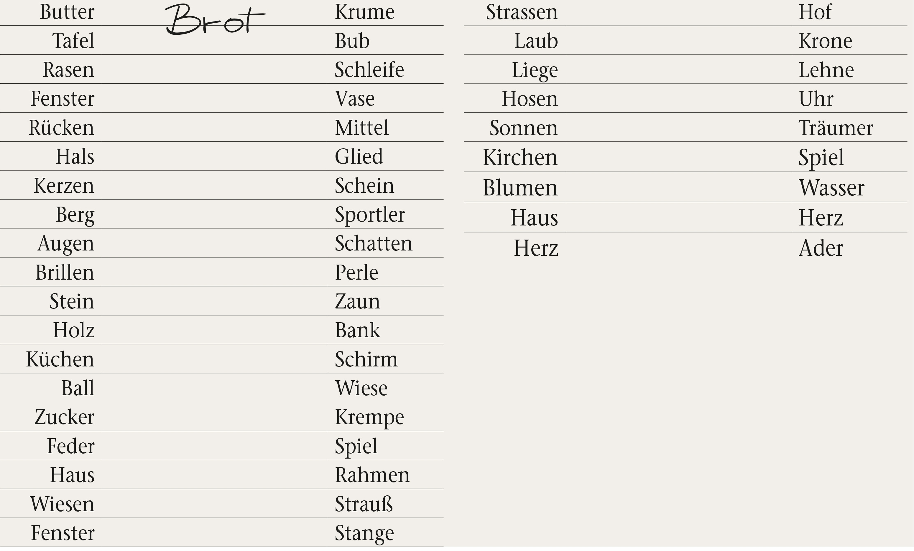 Zwei Wörter (Aussage zur 1. Zeile, der/die/das plus Gegenstand, Ort oder Person)
